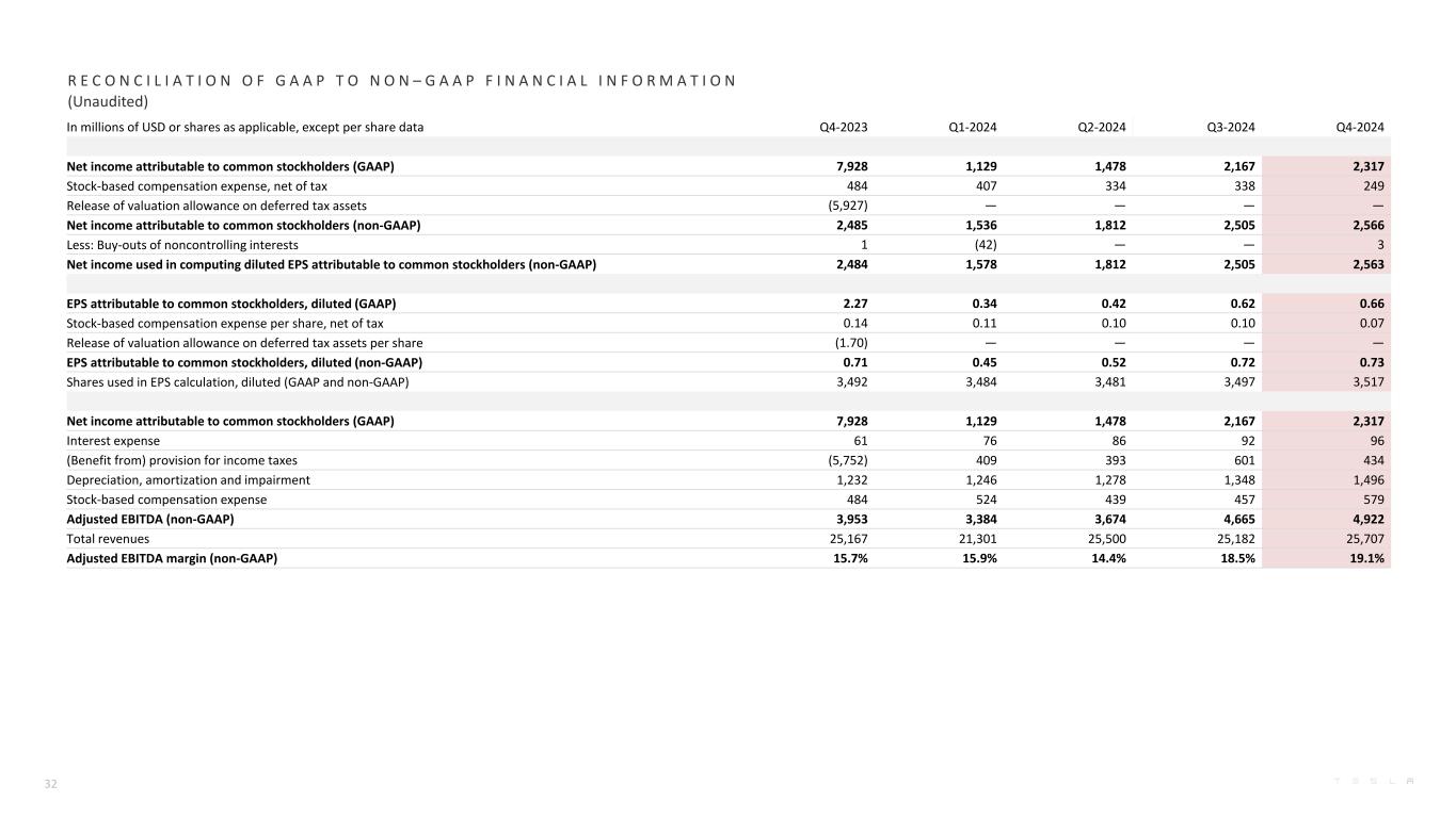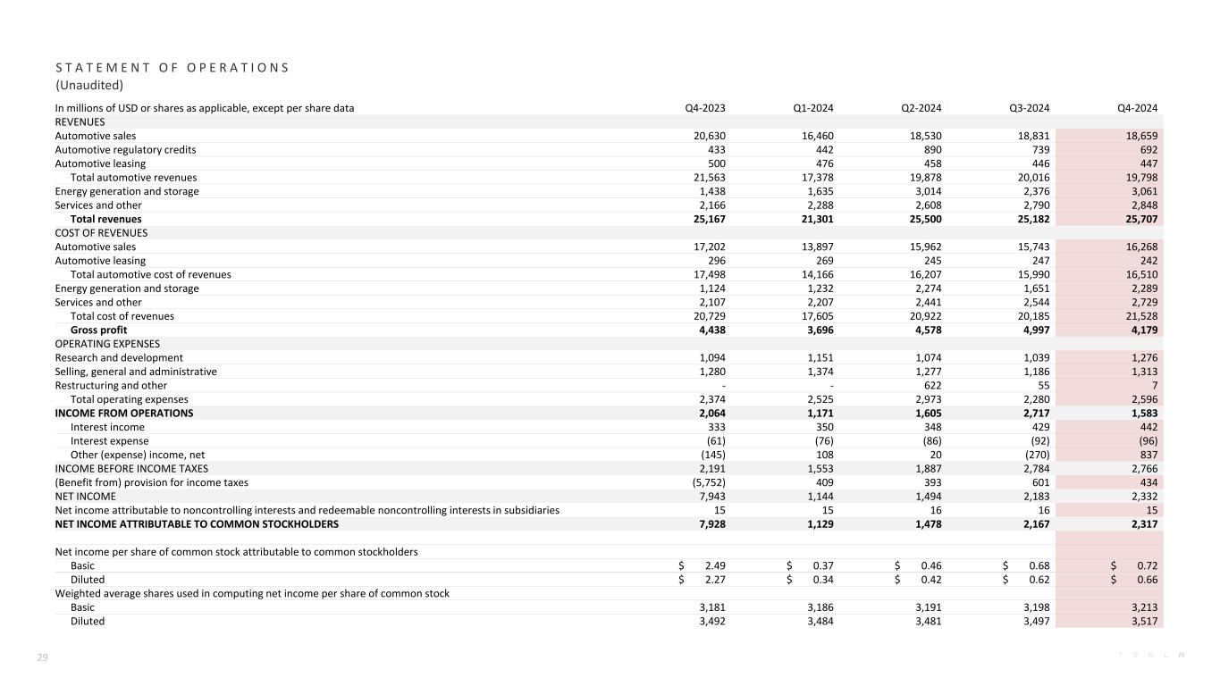 In millions of USD or shares as applicable, except per share data Q4-2023 Q1-2024 Q2-2024 Q3-2024 Q4-2024 REVENUES Automotive sales 20,630 16,460 18,530 18,831 18,659 Automotive regulatory credits 433 442 890 739 692 Automotive leasing 500 476 458 446 447 Total automotive revenues 21,563 17,378 19,878 20,016 19,798 Energy generation and storage 1,438 1,635 3,014 2,376 3,061 Services and other 2,166 2,288 2,608 2,790 2,848 Total revenues 25,167 21,301 25,500 25,182 25,707 COST OF REVENUES Automotive sales 17,202 13,897 15,962 15,743 16,268 Automotive leasing 296 269 245 247 242 Total automotive cost of revenues 17,498 14,166 16,207 15,990 16,510 Energy generation and storage 1,124 1,232 2,274 1,651 2,289 Services and other 2,107 2,207 2,441 2,544 2,729 Total cost of revenues 20,729 17,605 20,922 20,185 21,528 Gross profit 4,438 3,696 4,578 4,997 4,179 OPERATING EXPENSES Research and development 1,094 1,151 1,074 1,039 1,276 Selling, general and administrative 1,280 1,374 1,277 1,186 1,313 Restructuring and other - - 622 55 7 Total operating expenses 2,374 2,525 2,973 2,280 2,596 INCOME FROM OPERATIONS 2,064 1,171 1,605 2,717 1,583 Interest income 333 350 348 429 442 Interest expense (61) (76) (86) (92) (96) Other (expense) income, net (145) 108 20 (270) 837 INCOME BEFORE INCOME TAXES 2,191 1,553 1,887 2,784 2,766 (Benefit from) provision for income taxes (5,752) 409 393 601 434 NET INCOME 7,943 1,144 1,494 2,183 2,332 Net income attributable to noncontrolling interests and redeemable noncontrolling interests in subsidiaries 15 15 16 16 15 NET INCOME ATTRIBUTABLE TO COMMON STOCKHOLDERS 7,928 1,129 1,478 2,167 2,317 Net income per share of common stock attributable to common stockholders Basic $ 2.49 $ 0.37 $ 0.46 $ 0.68 $ 0.72 Diluted $ 2.27 $ 0.34 $ 0.42 $ 0.62 $ 0.66 Weighted average shares used in computing net income per share of common stock Basic 3,181 3,186 3,191 3,198 3,213 Diluted 3,492 3,484 3,481 3,497 3,517 S T A T E M E N T O F O P E R A T I O N S (Unaudited) 29
