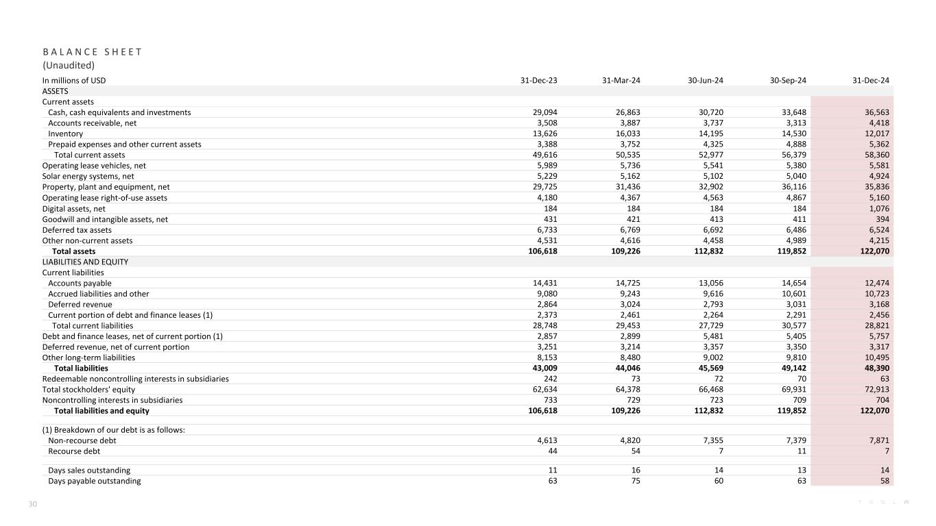 B A L A N C E S H E E T (Unaudited) In millions of USD 31-Dec-23 31-Mar-24 30-Jun-24 30-Sep-24 31-Dec-24 ASSETS Current assets Cash, cash equivalents and investments 29,094 26,863 30,720 33,648 36,563 Accounts receivable, net 3,508 3,887 3,737 3,313 4,418 Inventory 13,626 16,033 14,195 14,530 12,017 Prepaid expenses and other current assets 3,388 3,752 4,325 4,888 5,362 Total current assets 49,616 50,535 52,977 56,379 58,360 Operating lease vehicles, net 5,989 5,736 5,541 5,380 5,581 Solar energy systems, net 5,229 5,162 5,102 5,040 4,924 Property, plant and equipment, net 29,725 31,436 32,902 36,116 35,836 Operating lease right-of-use assets 4,180 4,367 4,563 4,867 5,160 Digital assets, net 184 184 184 184 1,076 Goodwill and intangible assets, net 431 421 413 411 394 Deferred tax assets 6,733 6,769 6,692 6,486 6,524 Other non-current assets 4,531 4,616 4,458 4,989 4,215 Total assets 106,618 109,226 112,832 119,852 122,070 LIABILITIES AND EQUITY Current liabilities Accounts payable 14,431 14,725 13,056 14,654 12,474 Accrued liabilities and other 9,080 9,243 9,616 10,601 10,723 Deferred revenue 2,864 3,024 2,793 3,031 3,168 Current portion of debt and finance leases (1) 2,373 2,461 2,264 2,291 2,456 Total current liabilities 28,748 29,453 27,729 30,577 28,821 Debt and finance leases, net of current portion (1) 2,857 2,899 5,481 5,405 5,757 Deferred revenue, net of current portion 3,251 3,214 3,357 3,350 3,317 Other long-term liabilities 8,153 8,480 9,002 9,810 10,495 Total liabilities 43,009 44,046 45,569 49,142 48,390 Redeemable noncontrolling interests in subsidiaries 242 73 72 70 63 Total stockholders' equity 62,634 64,378 66,468 69,931 72,913 Noncontrolling interests in subsidiaries 733 729 723 709 704 Total liabilities and equity 106,618 109,226 112,832 119,852 122,070 (1) Breakdown of our debt is as follows: Non-recourse debt 4,613 4,820 7,355 7,379 7,871 Recourse debt 44 54 7 11 7 Days sales outstanding 11 16 14 13 14 Days payable outstanding 63 75 60 63 58 30