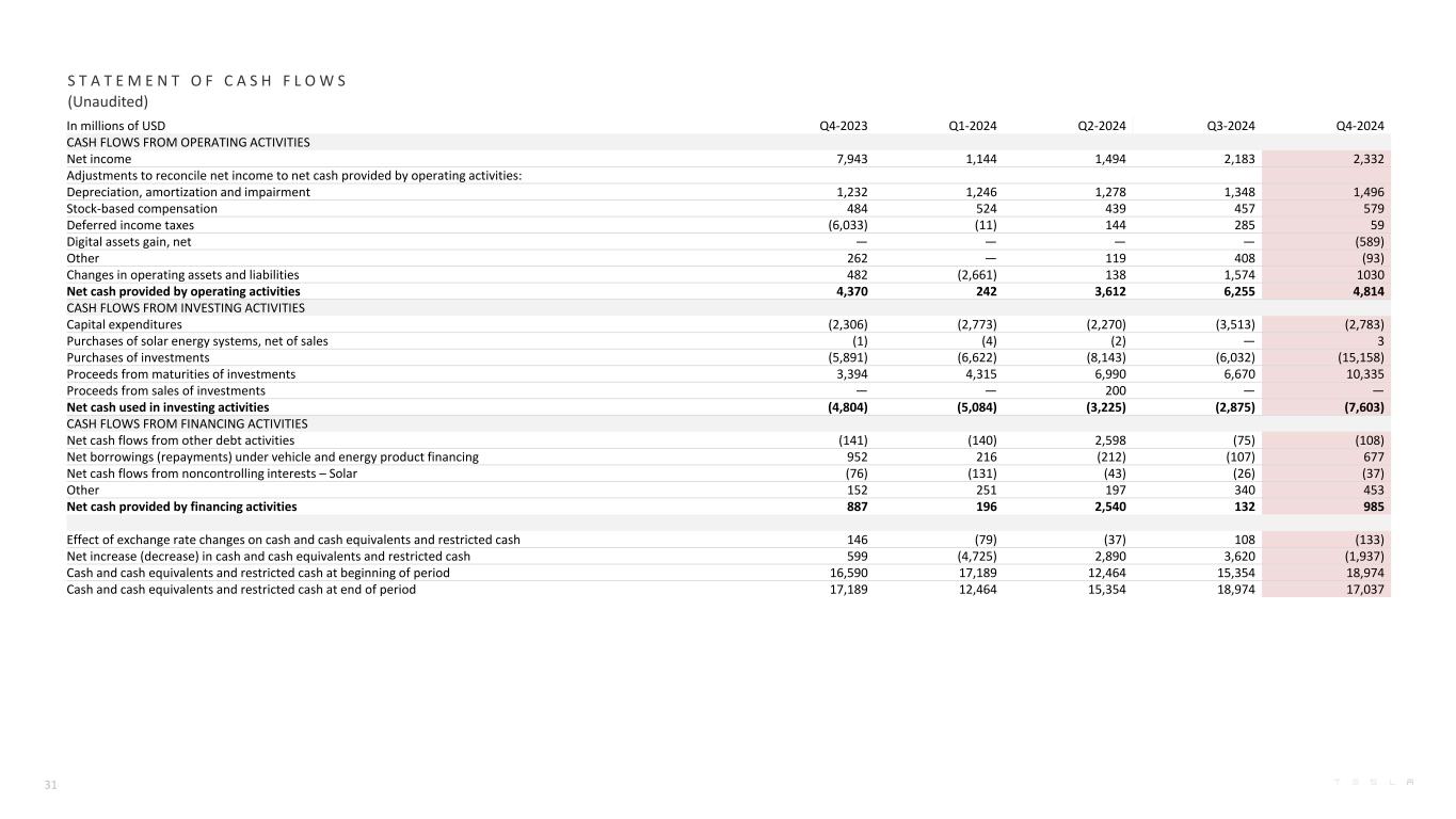 In millions of USD Q4-2023 Q1-2024 Q2-2024 Q3-2024 Q4-2024 CASH FLOWS FROM OPERATING ACTIVITIES Net income 7,943 1,144 1,494 2,183 2,332 Adjustments to reconcile net income to net cash provided by operating activities: Depreciation, amortization and impairment 1,232 1,246 1,278 1,348 1,496 Stock-based compensation 484 524 439 457 579 Deferred income taxes (6,033) (11) 144 285 59 Digital assets gain, net — — — — (589) Other 262 — 119 408 (93) Changes in operating assets and liabilities 482 (2,661) 138 1,574 1030 Net cash provided by operating activities 4,370 242 3,612 6,255 4,814 CASH FLOWS FROM INVESTING ACTIVITIES Capital expenditures (2,306) (2,773) (2,270) (3,513) (2,783) Purchases of solar energy systems, net of sales (1) (4) (2) — 3 Purchases of investments (5,891) (6,622) (8,143) (6,032) (15,158) Proceeds from maturities of investments 3,394 4,315 6,990 6,670 10,335 Proceeds from sales of investments — — 200 — — Net cash used in investing activities (4,804) (5,084) (3,225) (2,875) (7,603) CASH FLOWS FROM FINANCING ACTIVITIES Net cash flows from other debt activities (141) (140) 2,598 (75) (108) Net borrowings (repayments) under vehicle and energy product financing 952 216 (212) (107) 677 Net cash flows from noncontrolling interests – Solar (76) (131) (43) (26) (37) Other 152 251 197 340 453 Net cash provided by financing activities 887 196 2,540 132 985 Effect of exchange rate changes on cash and cash equivalents and restricted cash 146 (79) (37) 108 (133) Net increase (decrease) in cash and cash equivalents and restricted cash 599 (4,725) 2,890 3,620 (1,937) Cash and cash equivalents and restricted cash at beginning of period 16,590 17,189 12,464 15,354 18,974 Cash and cash equivalents and restricted cash at end of period 17,189 12,464 15,354 18,974 17,037 S T A T E M E N T O F C A S H F L O W S (Unaudited) 31