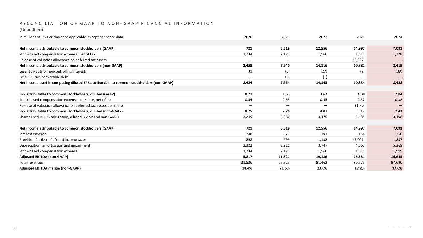 In millions of USD or shares as applicable, except per share data 2020 2021 2022 2023 2024 Net income attributable to common stockholders (GAAP) 721 5,519 12,556 14,997 7,091 Stock-based compensation expense, net of tax 1,734 2,121 1,560 1,812 1,328 Release of valuation allowance on deferred tax assets — — — (5,927) — Net income attributable to common stockholders (non-GAAP) 2,455 7,640 14,116 10,882 8,419 Less: Buy-outs of noncontrolling interests 31 (5) (27) (2) (39) Less: Dilutive convertible debt — (9) (1) — — Net income used in computing diluted EPS attributable to common stockholders (non-GAAP) 2,424 7,654 14,143 10,884 8,458 EPS attributable to common stockholders, diluted (GAAP) 0.21 1.63 3.62 4.30 2.04 Stock-based compensation expense per share, net of tax 0.54 0.63 0.45 0.52 0.38 Release of valuation allowance on deferred tax assets per share — — — (1.70) — EPS attributable to common stockholders, diluted (non-GAAP) 0.75 2.26 4.07 3.12 2.42 Shares used in EPS calculation, diluted (GAAP and non-GAAP) 3,249 3,386 3,475 3,485 3,498 Net income attributable to common stockholders (GAAP) 721 5,519 12,556 14,997 7,091 Interest expense 748 371 191 156 350 Provision for (benefit from) income taxes 292 699 1,132 (5,001) 1,837 Depreciation, amortization and impairment 2,322 2,911 3,747 4,667 5,368 Stock-based compensation expense 1,734 2,121 1,560 1,812 1,999 Adjusted EBITDA (non-GAAP) 5,817 11,621 19,186 16,331 16,645 Total revenues 31,536 53,823 81,462 96,773 97,690 Adjusted EBITDA margin (non-GAAP) 18.4% 21.6% 23.6% 17.2% 17.0% R E C O N C I L I A T I O N O F G A A P T O N O N – G A A P F I N A N C I A L I N F O R M A T I O N (Unaudited) 33