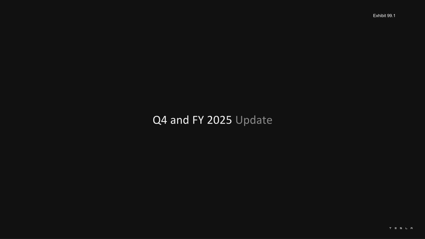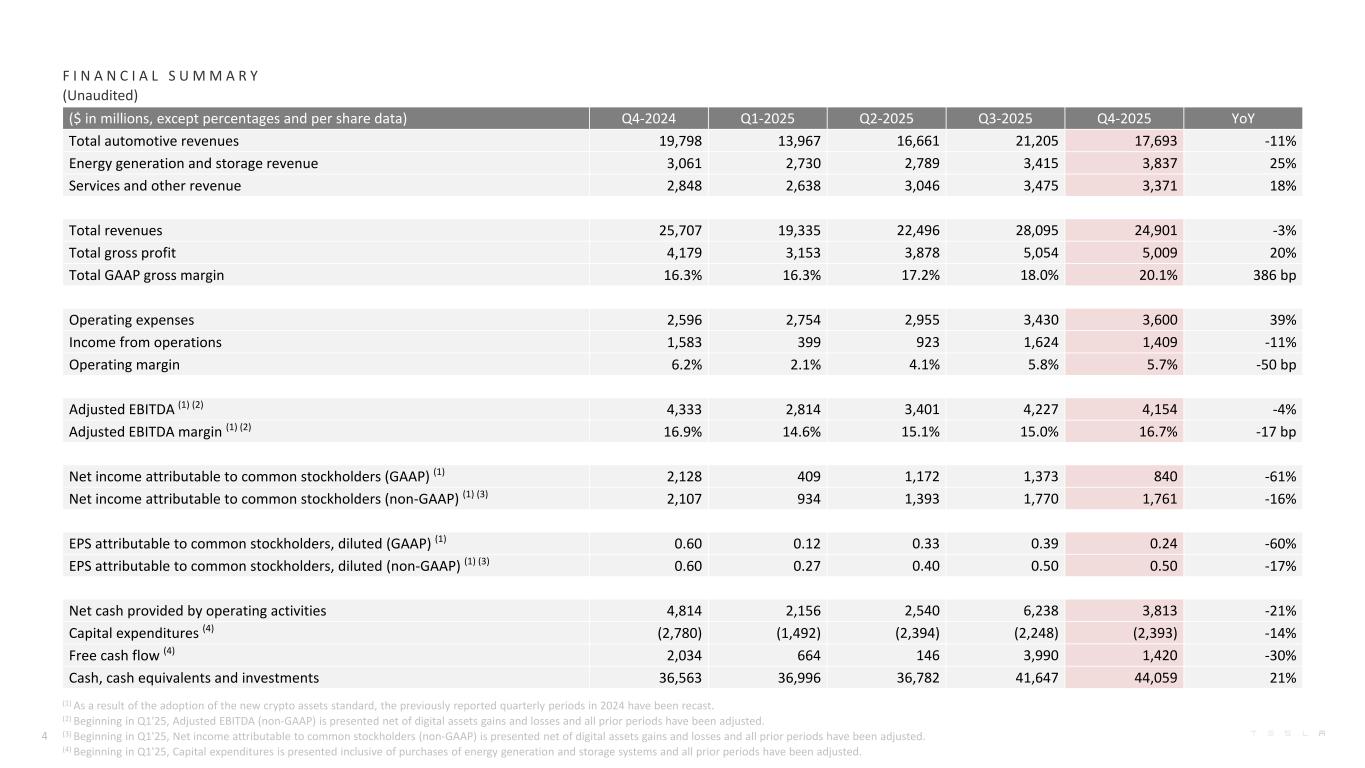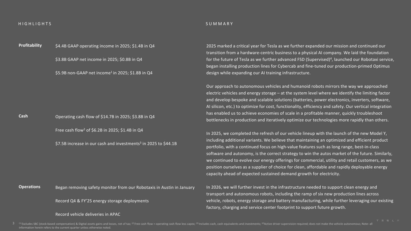 S U M M A R YH I G H L I G H T S (1) Excludes SBC (stock-based compensation) & Digital assets gains and losses, net of tax; (2) Free cash flow = operating cash flow less capex; (3) Includes cash, cash equivalents and investments; (4)Active driver supervision required; does not make the vehicle autonomous; Note: all information herein refers to the current quarter unless otherwise noted. Profitability $4.4B GAAP operating income in 2025; $1.4B in Q4 $3.8B GAAP net income in 2025; $0.8B in Q4 $5.9B non-GAAP net income1 in 2025; $1.8B in Q4 2025 marked a critical year for Tesla as we further expanded our mission and continued our transition from a hardware-centric business to a physical AI company. We laid the foundation for the future of Tesla as we further advanced FSD (Supervised)4, launched our Robotaxi service, began installing production lines for Cybercab and fine-tuned our production-primed Optimus design while expanding our AI training infrastructure. Our approach to autonomous vehicles and humanoid robots mirrors the way we approached electric vehicles and energy storage – at the system level where we identify the limiting factor and develop bespoke and scalable solutions (batteries, power electronics, inverters, software, AI silicon, etc.) to optimize for cost, functionality, efficiency and safety. Our vertical integration has enabled us to achieve economies of scale in a profitable manner, quickly troubleshoot bottlenecks in production and iteratively optimize our technologies more rapidly than others. In 2025, we completed the refresh of our vehicle lineup with the launch of the new Model Y, including additional variants. We believe that maintaining an optimized and efficient product portfolio, with a continued focus on high-value features such as long range, best-in-class software and autonomy, is the correct strategy to win the autos market of the future. Similarly, we continued to evolve our energy offerings for commercial, utility and retail customers, as we position ourselves as a supplier of choice for clean, affordable and rapidly deployable energy capacity ahead of expected sustained demand growth for electricity. In 2026, we will further invest in the infrastructure needed to support clean energy and transport and autonomous robots, including the ramp of six new production lines across vehicle, robots, energy storage and battery manufacturing, while further leveraging our existing factory, charging and service center footprint to support future growth. Cash Operating cash flow of $14.7B in 2025; $3.8B in Q4 Free cash flow2 of $6.2B in 2025; $1.4B in Q4 $7.5B increase in our cash and investments3 in 2025 to $44.1B Operations Began removing safety monitor from our Robotaxis in Austin in January Record Q4 & FY’25 energy storage deployments Record vehicle deliveries in APAC 3