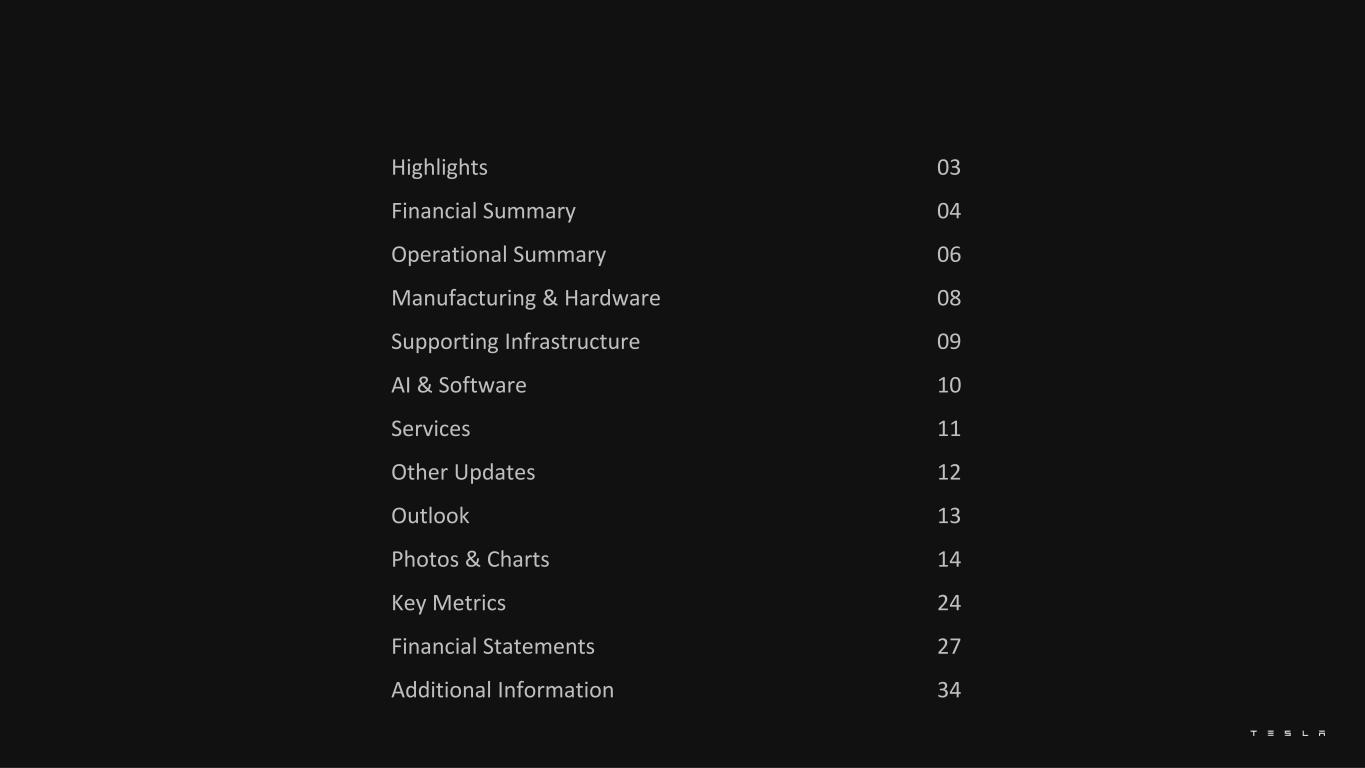 Highlights 03 Financial Summary 04 Operational Summary 06 Manufacturing & Hardware 08 Supporting Infrastructure 09 AI & Software 10 Services 11 Other Updates 12 Outlook 13 Photos & Charts 14 Key Metrics 24 Financial Statements 27 Additional Information 34 2