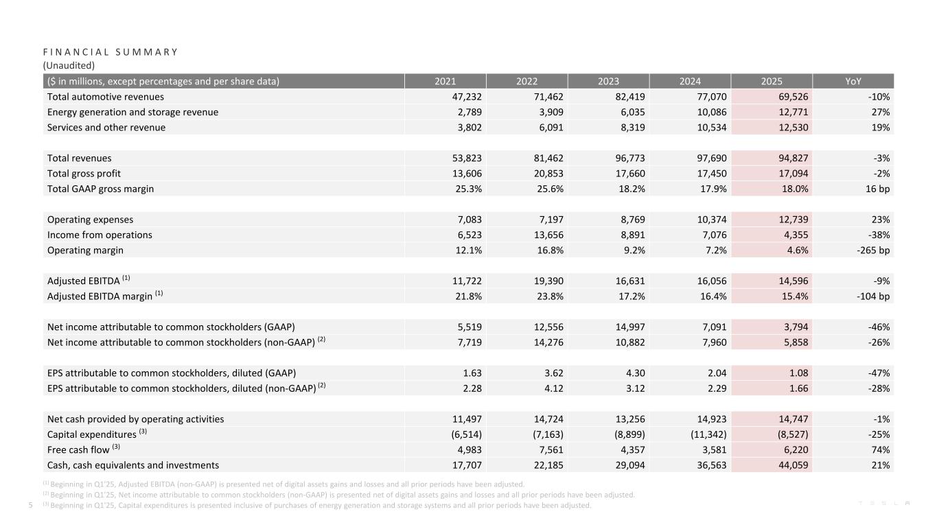 F I N A N C I A L S U M M A R Y (Unaudited) ($ in millions, except percentages and per share data) Q4-2024 Q1-2025 Q2-2025 Q3-2025 Q4-2025 YoY Total automotive revenues 19,798 13,967 16,661 21,205 17,693 -11% Energy generation and storage revenue 3,061 2,730 2,789 3,415 3,837 25% Services and other revenue 2,848 2,638 3,046 3,475 3,371 18% Total revenues 25,707 19,335 22,496 28,095 24,901 -3% Total gross profit 4,179 3,153 3,878 5,054 5,009 20% Total GAAP gross margin 16.3% 16.3% 17.2% 18.0% 20.1% 386 bp Operating expenses 2,596 2,754 2,955 3,430 3,600 39% Income from operations 1,583 399 923 1,624 1,409 -11% Operating margin 6.2% 2.1% 4.1% 5.8% 5.7% -50 bp Adjusted EBITDA (1) (2) 4,333 2,814 3,401 4,227 4,154 -4% Adjusted EBITDA margin (1) (2) 16.9% 14.6% 15.1% 15.0% 16.7% -17 bp Net income attributable to common stockholders (GAAP) (1) 2,128 409 1,172 1,373 840 -61% Net income attributable to common stockholders (non-GAAP) (1) (3) 2,107 934 1,393 1,770 1,761 -16% EPS attributable to common stockholders, diluted (GAAP) (1) 0.60 0.12 0.33 0.39 0.24 -60% EPS attributable to common stockholders, diluted (non-GAAP) (1) (3) 0.60 0.27 0.40 0.50 0.50 -17% Net cash provided by operating activities 4,814 2,156 2,540 6,238 3,813 -21% Capital expenditures (4) (2,780) (1,492) (2,394) (2,248) (2,393) -14% Free cash flow (4) 2,034 664 146 3,990 1,420 -30% Cash, cash equivalents and investments 36,563 36,996 36,782 41,647 44,059 21% 4 (1) As a result of the adoption of the new crypto assets standard, the previously reported quarterly periods in 2024 have been recast. (2) Beginning in Q1'25, Adjusted EBITDA (non-GAAP) is presented net of digital assets gains and losses and all prior periods have been adjusted. (3) Beginning in Q1'25, Net income attributable to common stockholders (non-GAAP) is presented net of digital assets gains and losses and all prior periods have been adjusted. (4) Beginning in Q1'25, Capital expenditures is presented inclusive of purchases of energy generation and storage systems and all prior periods have been adjusted.