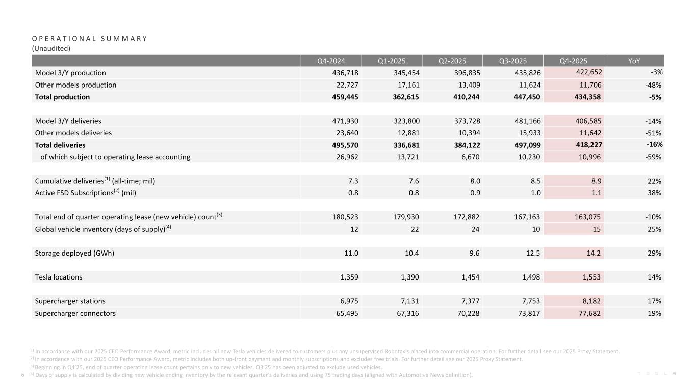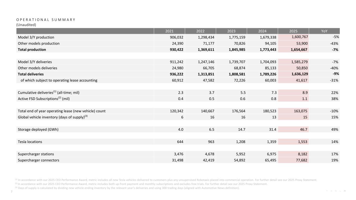 Q4-2024 Q1-2025 Q2-2025 Q3-2025 Q4-2025 YoY Model 3/Y production 436,718 345,454 396,835 435,826 422,652 -3% Other models production 22,727 17,161 13,409 11,624 11,706 -48% Total production 459,445 362,615 410,244 447,450 434,358 -5% Model 3/Y deliveries 471,930 323,800 373,728 481,166 406,585 -14% Other models deliveries 23,640 12,881 10,394 15,933 11,642 -51% Total deliveries 495,570 336,681 384,122 497,099 418,227 -16% of which subject to operating lease accounting 26,962 13,721 6,670 10,230 10,996 -59% Cumulative deliveries(1) (all-time; mil) 7.3 7.6 8.0 8.5 8.9 22% Active FSD Subscriptions(2) (mil) 0.8 0.8 0.9 1.0 1.1 38% Total end of quarter operating lease (new vehicle) count(3) 180,523 179,930 172,882 167,163 163,075 -10% Global vehicle inventory (days of supply)(4) 12 22 24 10 15 25% Storage deployed (GWh) 11.0 10.4 9.6 12.5 14.2 29% Tesla locations 1,359 1,390 1,454 1,498 1,553 14% Supercharger stations 6,975 7,131 7,377 7,753 8,182 17% Supercharger connectors 65,495 67,316 70,228 73,817 77,682 19% O P E R A T I O N A L S U M M A R Y (Unaudited) 6 (1) In accordance with our 2025 CEO Performance Award, metric includes all new Tesla vehicles delivered to customers plus any unsupervised Robotaxis placed into commercial operation. For further detail see our 2025 Proxy Statement. (2) In accordance with our 2025 CEO Performance Award, metric includes both up-front payment and monthly subscriptions and excludes free trials. For further detail see our 2025 Proxy Statement. (3) Beginning in Q4’25, end of quarter operating lease count pertains only to new vehicles. Q3’25 has been adjusted to exclude used vehicles. (4) Days of supply is calculated by dividing new vehicle ending inventory by the relevant quarter’s deliveries and using 75 trading days (aligned with Automotive News definition).