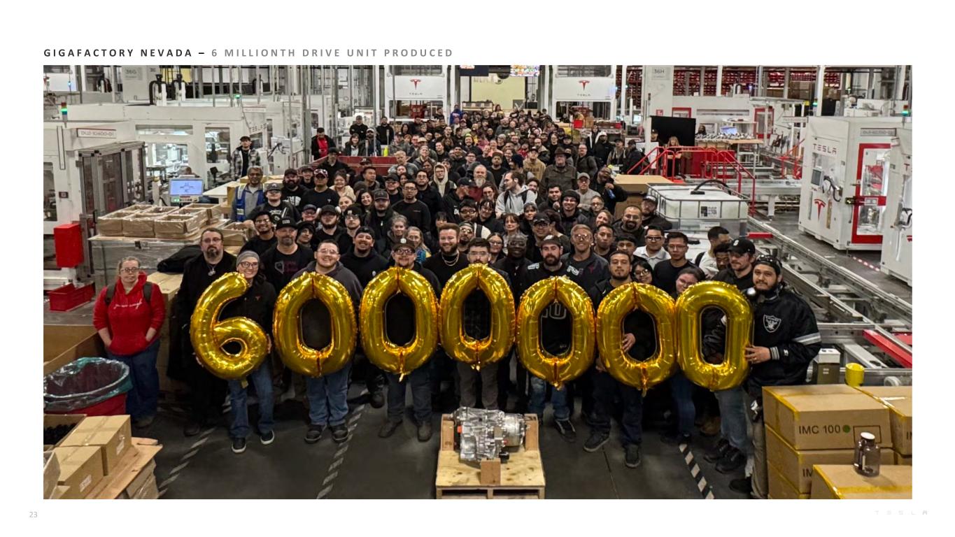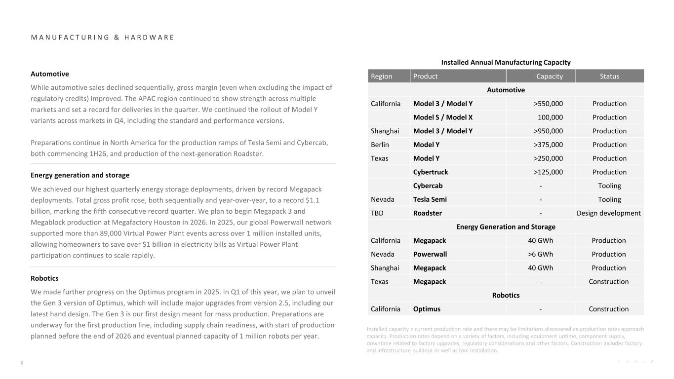 M A N U F A C T U R I N G & H A R D W A R E Installed Annual Manufacturing Capacity Region Product Capacity Status Automotive California Model 3 / Model Y >550,000 Production Model S / Model X 100,000 Production Shanghai Model 3 / Model Y >950,000 Production Berlin Model Y >375,000 Production Texas Model Y >250,000 Production Cybertruck >125,000 Production Cybercab - Tooling Nevada Tesla Semi - Tooling TBD Roadster - Design development Energy Generation and Storage California Megapack 40 GWh Production Nevada Powerwall >6 GWh Production Shanghai Megapack 40 GWh Production Texas Megapack - Construction Robotics California Optimus - Construction Installed capacity ≠ current production rate and there may be limitations discovered as production rates approach capacity. Production rates depend on a variety of factors, including equipment uptime, component supply, downtime related to factory upgrades, regulatory considerations and other factors. Construction includes factory and infrastructure buildout as well as tool installation. Automotive While automotive sales declined sequentially, gross margin (even when excluding the impact of regulatory credits) improved. The APAC region continued to show strength across multiple markets and set a record for deliveries in the quarter. We continued the rollout of Model Y variants across markets in Q4, including the standard and performance versions. Preparations continue in North America for the production ramps of Tesla Semi and Cybercab, both commencing 1H26, and production of the next-generation Roadster. Energy generation and storage We achieved our highest quarterly energy storage deployments, driven by record Megapack deployments. Total gross profit rose, both sequentially and year-over-year, to a record $1.1 billion, marking the fifth consecutive record quarter. We plan to begin Megapack 3 and Megablock production at Megafactory Houston in 2026. In 2025, our global Powerwall network supported more than 89,000 Virtual Power Plant events across over 1 million installed units, allowing homeowners to save over $1 billion in electricity bills as Virtual Power Plant participation continues to scale rapidly. Robotics We made further progress on the Optimus program in 2025. In Q1 of this year, we plan to unveil the Gen 3 version of Optimus, which will include major upgrades from version 2.5, including our latest hand design. The Gen 3 is our first design meant for mass production. Preparations are underway for the first production line, including supply chain readiness, with start of production planned before the end of 2026 and eventual planned capacity of 1 million robots per year. 8