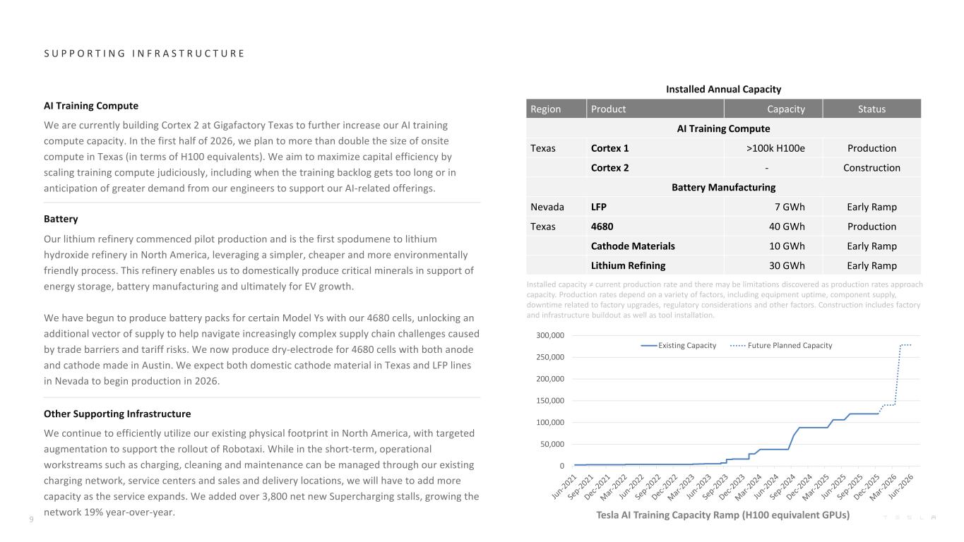 S U P P O R T I N G I N F R A S T R U C T U R E Installed Annual Capacity Region Product Capacity Status AI Training Compute Texas Cortex 1 >100k H100e Production Cortex 2 - Construction Battery Manufacturing Nevada LFP 7 GWh Early Ramp Texas 4680 40 GWh Production Cathode Materials 10 GWh Early Ramp Lithium Refining 30 GWh Early Ramp Installed capacity ≠ current production rate and there may be limitations discovered as production rates approach capacity. Production rates depend on a variety of factors, including equipment uptime, component supply, downtime related to factory upgrades, regulatory considerations and other factors. Construction includes factory and infrastructure buildout as well as tool installation. AI Training Compute We are currently building Cortex 2 at Gigafactory Texas to further increase our AI training compute capacity. In the first half of 2026, we plan to more than double the size of onsite compute in Texas (in terms of H100 equivalents). We aim to maximize capital efficiency by scaling training compute judiciously, including when the training backlog gets too long or in anticipation of greater demand from our engineers to support our AI-related offerings. Battery Our lithium refinery commenced pilot production and is the first spodumene to lithium hydroxide refinery in North America, leveraging a simpler, cheaper and more environmentally friendly process. This refinery enables us to domestically produce critical minerals in support of energy storage, battery manufacturing and ultimately for EV growth. We have begun to produce battery packs for certain Model Ys with our 4680 cells, unlocking an additional vector of supply to help navigate increasingly complex supply chain challenges caused by trade barriers and tariff risks. We now produce dry-electrode for 4680 cells with both anode and cathode made in Austin. We expect both domestic cathode material in Texas and LFP lines in Nevada to begin production in 2026. Other Supporting Infrastructure We continue to efficiently utilize our existing physical footprint in North America, with targeted augmentation to support the rollout of Robotaxi. While in the short-term, operational workstreams such as charging, cleaning and maintenance can be managed through our existing charging network, service centers and sales and delivery locations, we will have to add more capacity as the service expands. We added over 3,800 net new Supercharging stalls, growing the network 19% year-over-year. 9 Tesla AI Training Capacity Ramp (H100 equivalent GPUs) 0 50,000 100,000 150,000 200,000 250,000 300,000 Existing Capacity Future Planned Capacity