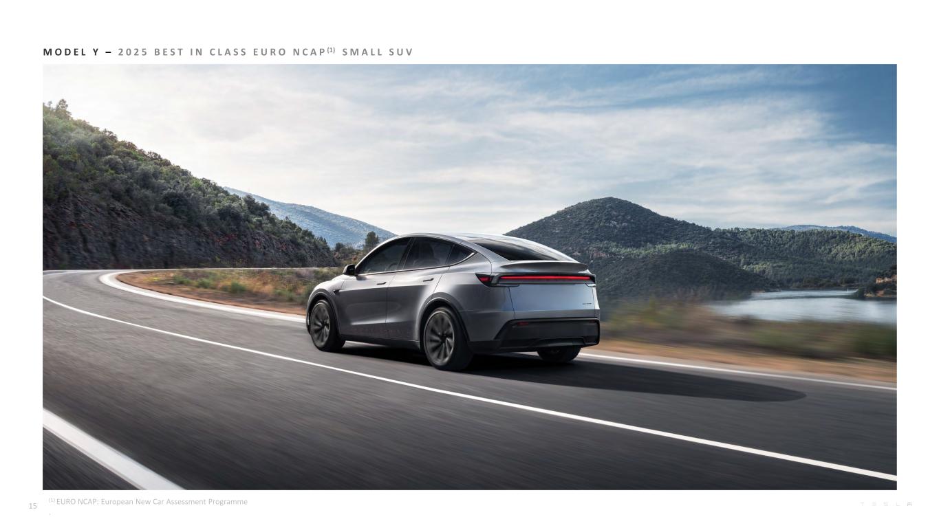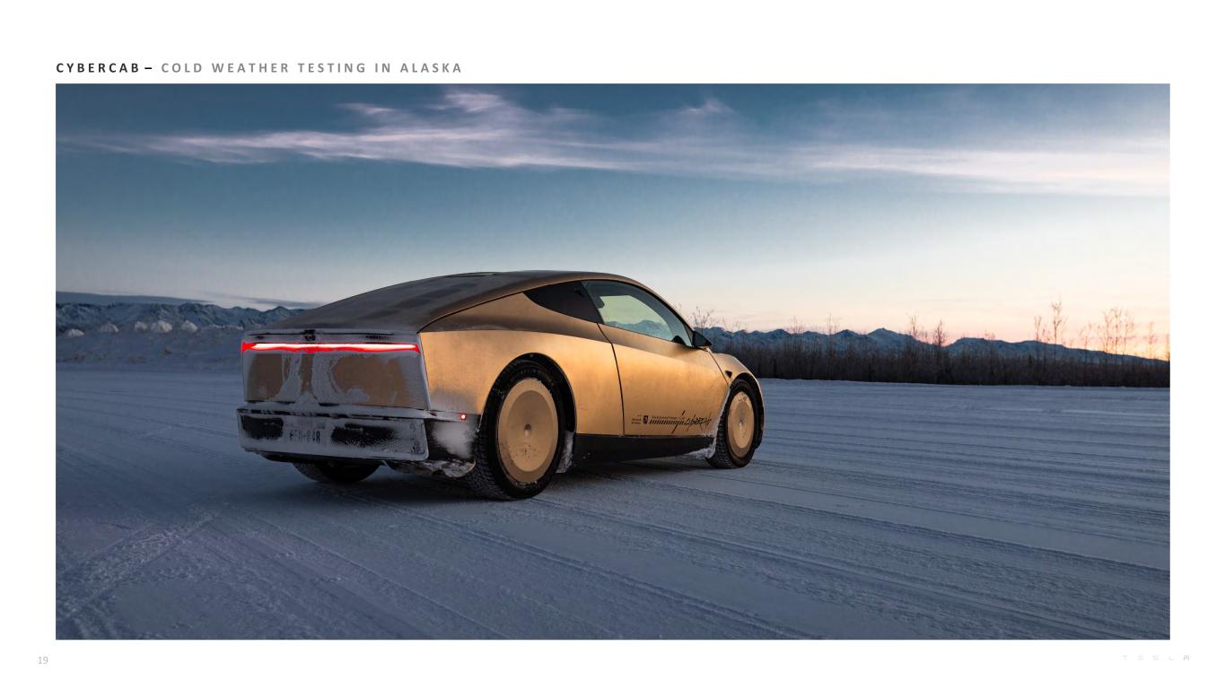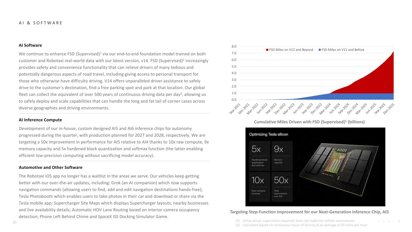 Targeting Step-Function Improvement for our Next-Generation Inference Chip, AI5 A I & S O F T W A R E Cumulative Miles Driven with FSD (Supervised)1 (billions) AI Software We continue to enhance FSD (Supervised)1 via our end-to-end foundation model trained on both customer and Robotaxi real-world data with our latest version, v14. FSD (Supervised)1 increasingly provides safety and convenience functionality that can relieve drivers of many tedious and potentially dangerous aspects of road travel, including giving access to personal transport for those who otherwise have difficulty driving. V14 offers unparalleled driver assistance to safely drive to the customer’s destination, find a free parking spot and park at that location. Our global fleet can collect the equivalent of over 500 years of continuous driving data per day2, allowing us to safely deploy and scale capabilities that can handle the long and fat tail of corner cases across diverse geographies and driving environments. AI Inference Compute Development of our in-house, custom designed AI5 and AI6 inference chips for autonomy progressed during the quarter, with production planned for 2027 and 2028, respectively. We are targeting a 50x improvement in performance for AI5 relative to AI4 thanks to 10x raw compute, 9x memory capacity and 5x hardened block quantization and softmax function (the latter enabling efficient low-precision computing without sacrificing model accuracy). Automotive and Other Software The Robotaxi iOS app no longer has a waitlist in the areas we serve. Our vehicles keep getting better with our over-the-air updates, including: Grok (an AI companion) which now supports navigation commands (allowing users to find, add and edit navigation destinations hands-free); Tesla Photobooth which enables users to take photos in their car and download or share via the Tesla mobile app; Supercharger Site Maps which displays Supercharger layouts, nearby businesses and live availability details; Automatic HOV Lane Routing based on interior camera occupancy detection; Phone Left Behind Chime and SpaceX ISS Docking Simulator Game. 10 (1) Active driver supervision required; does not make the vehicle autonomous (2) Calculated based on continuous hours of driving at an average of 30 miles per hour 0.0 1.0 2.0 3.0 4.0 5.0 6.0 7.0 8.0 FSD Miles on V12 and Beyond FSD Miles on V11 and Before
