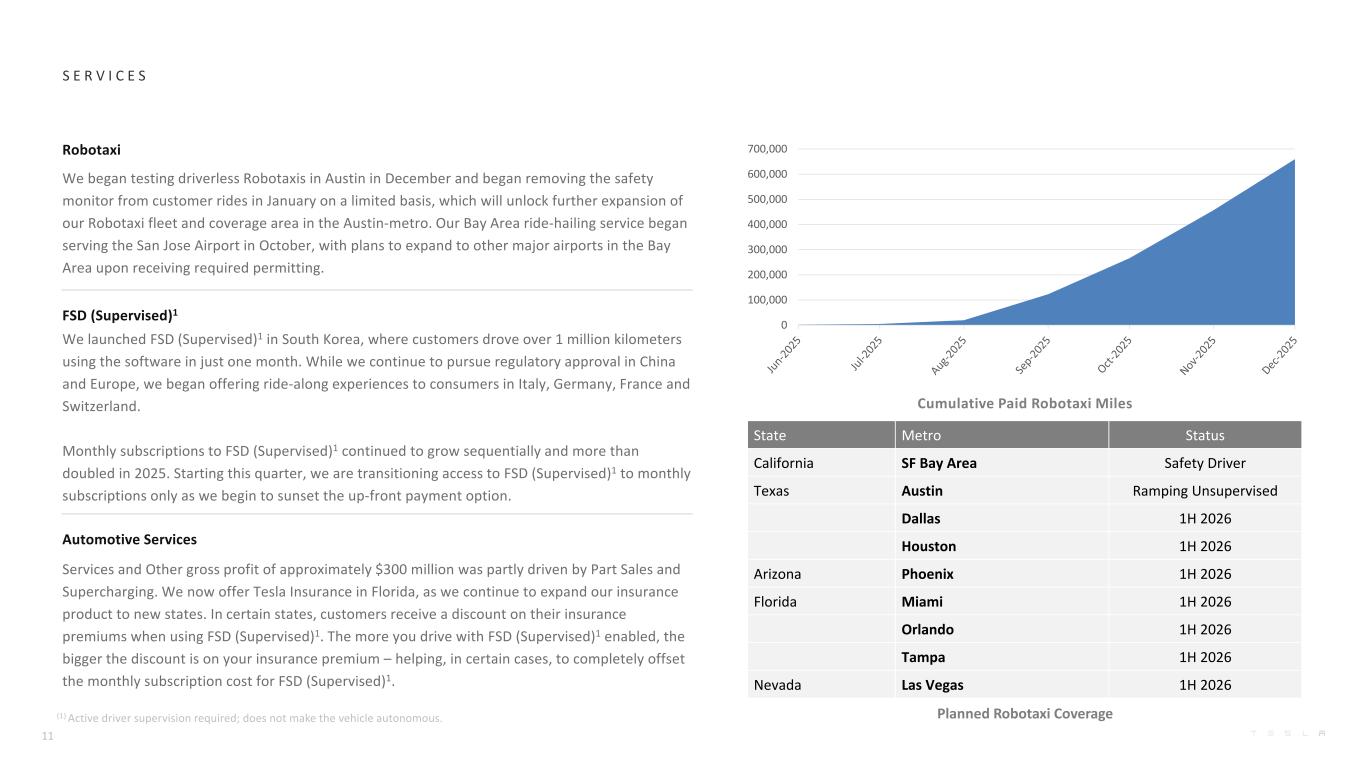 S E R V I C E S Planned Robotaxi Coverage Cumulative Paid Robotaxi Miles 11 State Metro Status California SF Bay Area Safety Driver Texas Austin Ramping Unsupervised Dallas 1H 2026 Houston 1H 2026 Arizona Phoenix 1H 2026 Florida Miami 1H 2026 Orlando 1H 2026 Tampa 1H 2026 Nevada Las Vegas 1H 2026 0 100,000 200,000 300,000 400,000 500,000 600,000 700,000 (1) Active driver supervision required; does not make the vehicle autonomous. Robotaxi We began testing driverless Robotaxis in Austin in December and began removing the safety monitor from customer rides in January on a limited basis, which will unlock further expansion of our Robotaxi fleet and coverage area in the Austin-metro. Our Bay Area ride-hailing service began serving the San Jose Airport in October, with plans to expand to other major airports in the Bay Area upon receiving required permitting. FSD (Supervised)1 We launched FSD (Supervised)1 in South Korea, where customers drove over 1 million kilometers using the software in just one month. While we continue to pursue regulatory approval in China and Europe, we began offering ride-along experiences to consumers in Italy, Germany, France and Switzerland. Monthly subscriptions to FSD (Supervised)1 continued to grow sequentially and more than doubled in 2025. Starting this quarter, we are transitioning access to FSD (Supervised)1 to monthly subscriptions only as we begin to sunset the up-front payment option. Automotive Services Services and Other gross profit of approximately $300 million was partly driven by Part Sales and Supercharging. We now offer Tesla Insurance in Florida, as we continue to expand our insurance product to new states. In certain states, customers receive a discount on their insurance premiums when using FSD (Supervised)1. The more you drive with FSD (Supervised)1 enabled, the bigger the discount is on your insurance premium – helping, in certain cases, to completely offset the monthly subscription cost for FSD (Supervised)1.