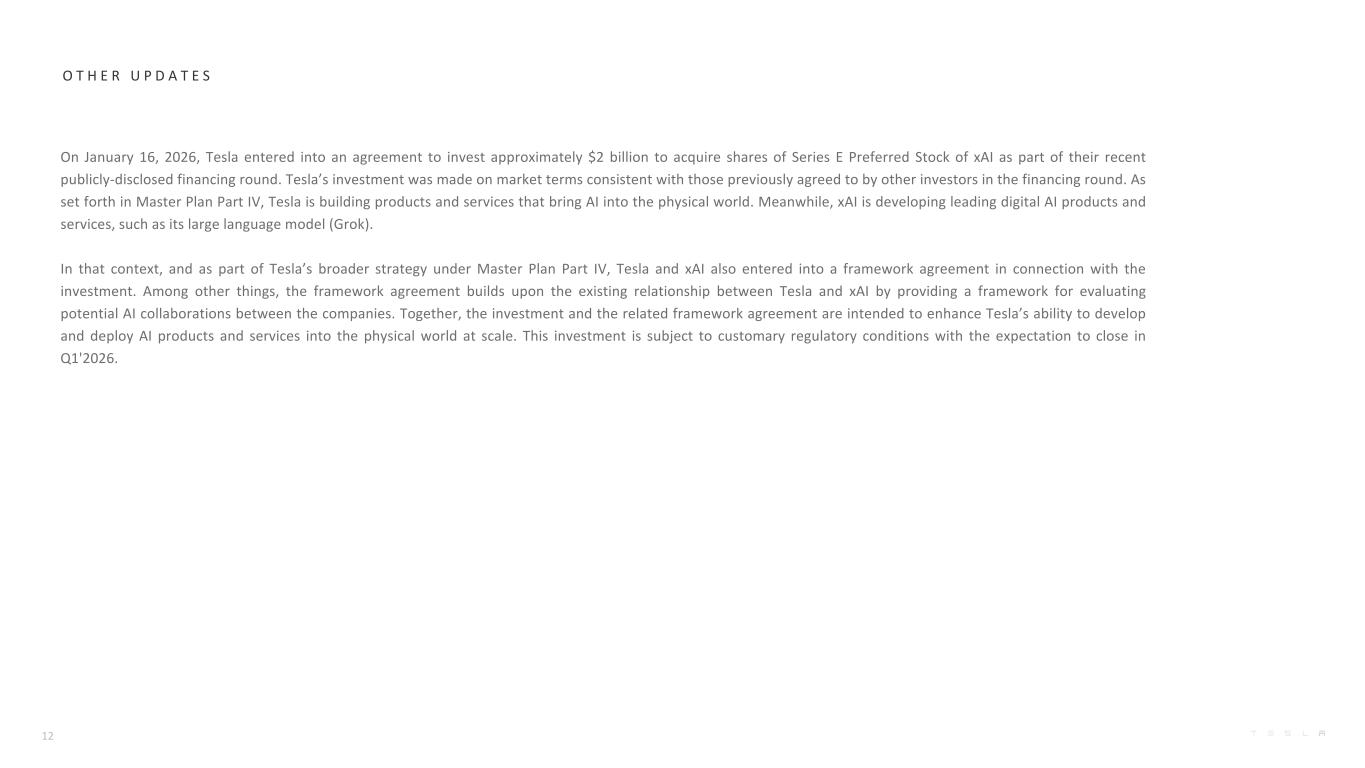 O T H E R U P D A T E S On January 16, 2026, Tesla entered into an agreement to invest approximately $2 billion to acquire shares of Series E Preferred Stock of xAI as part of their recent publicly-disclosed financing round. Tesla’s investment was made on market terms consistent with those previously agreed to by other investors in the financing round. As set forth in Master Plan Part IV, Tesla is building products and services that bring AI into the physical world. Meanwhile, xAI is developing leading digital AI products and services, such as its large language model (Grok). In that context, and as part of Tesla’s broader strategy under Master Plan Part IV, Tesla and xAI also entered into a framework agreement in connection with the investment. Among other things, the framework agreement builds upon the existing relationship between Tesla and xAI by providing a framework for evaluating potential AI collaborations between the companies. Together, the investment and the related framework agreement are intended to enhance Tesla’s ability to develop and deploy AI products and services into the physical world at scale. This investment is subject to customary regulatory conditions with the expectation to close in Q1'2026. 12