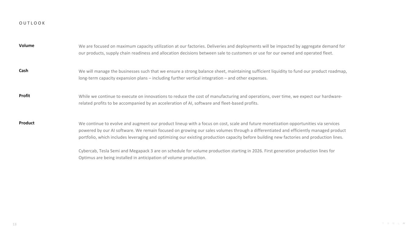 O U T L O O K Volume We are focused on maximum capacity utilization at our factories. Deliveries and deployments will be impacted by aggregate demand for our products, supply chain readiness and allocation decisions between sale to customers or use for our owned and operated fleet. Cash We will manage the businesses such that we ensure a strong balance sheet, maintaining sufficient liquidity to fund our product roadmap, long-term capacity expansion plans – including further vertical integration – and other expenses. Profit While we continue to execute on innovations to reduce the cost of manufacturing and operations, over time, we expect our hardware- related profits to be accompanied by an acceleration of AI, software and fleet-based profits. Product We continue to evolve and augment our product lineup with a focus on cost, scale and future monetization opportunities via services powered by our AI software. We remain focused on growing our sales volumes through a differentiated and efficiently managed product portfolio, which includes leveraging and optimizing our existing production capacity before building new factories and production lines. Cybercab, Tesla Semi and Megapack 3 are on schedule for volume production starting in 2026. First generation production lines for Optimus are being installed in anticipation of volume production. 13