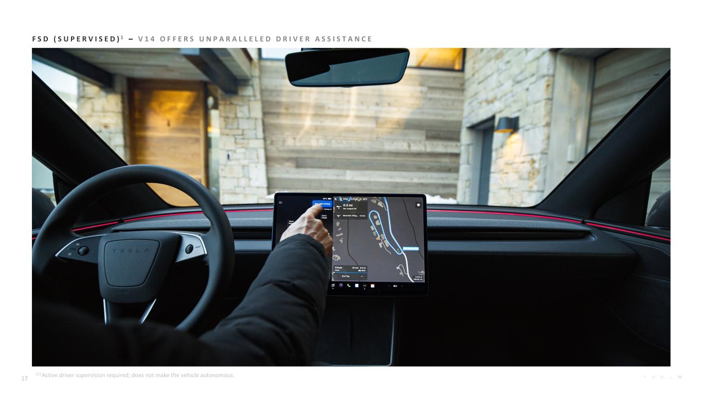 F S D ( S U P E R V I S E D ) 1 – V 1 4 O F F E R S U N P A R A L L E L E D D R I V E R A S S I S T A N C E 17 (1) Active driver supervision required; does not make the vehicle autonomous.