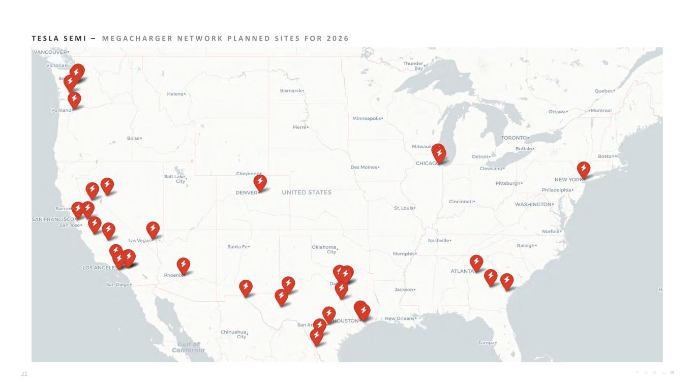 T E S L A S E M I – M E G A C H A R G E R N E T W O R K P L A N N E D S I T E S F O R 2 0 2 6 21