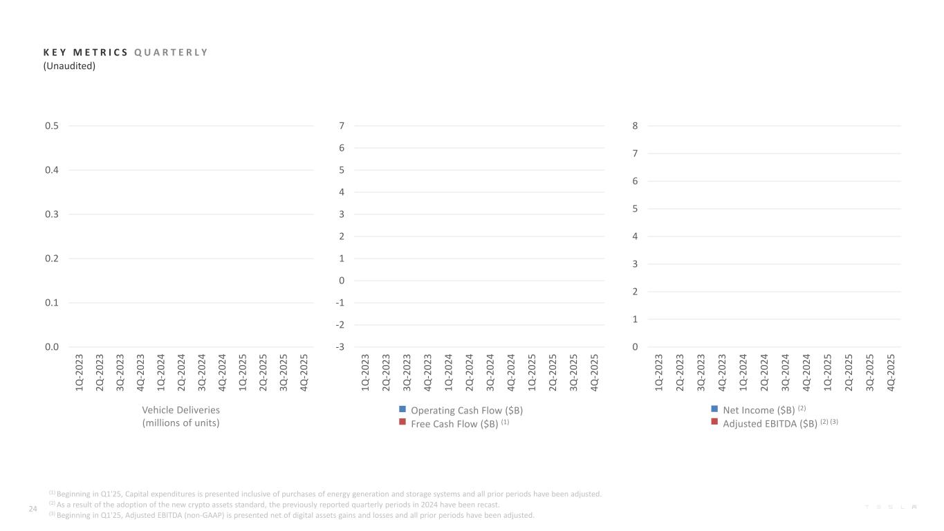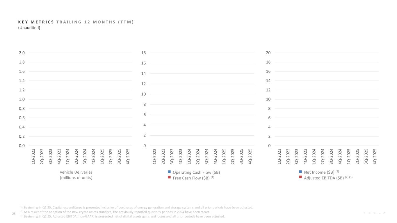 Vehicle Deliveries (millions of units) K E Y M E T R I C S Q U A R T E R L Y (Unaudited) Operating Cash Flow ($B) Free Cash Flow ($B) (1) Net Income ($B) (2) Adjusted EBITDA ($B) (2) (3) 24 (1) Beginning in Q1'25, Capital expenditures is presented inclusive of purchases of energy generation and storage systems and all prior periods have been adjusted. (2) As a result of the adoption of the new crypto assets standard, the previously reported quarterly periods in 2024 have been recast. (3) Beginning in Q1'25, Adjusted EBITDA (non-GAAP) is presented net of digital assets gains and losses and all prior periods have been adjusted. 0.0 0.1 0.2 0.3 0.4 0.5 1Q -2 02 3 2Q -2 02 3 3Q -2 02 3 4Q -2 02 3 1Q -2 02 4 2Q -2 02 4 3Q -2 02 4 4Q -2 02 4 1Q -2 02 5 2Q -2 02 5 3Q -2 02 5 4Q -2 02 5 -3 -2 -1 0 1 2 3 4 5 6 7 1Q -2 02 3 2Q -2 02 3 3Q -2 02 3 4Q -2 02 3 1Q -2 02 4 2Q -2 02 4 3Q -2 02 4 4Q -2 02 4 1Q -2 02 5 2Q -2 02 5 3Q -2 02 5 4Q -2 02 5 0 1 2 3 4 5 6 7 8 1Q -2 02 3 2Q -2 02 3 3Q -2 02 3 4Q -2 02 3 1Q -2 02 4 2Q -2 02 4 3Q -2 02 4 4Q -2 02 4 1Q -2 02 5 2Q -2 02 5 3Q -2 02 5 4Q -2 02 5