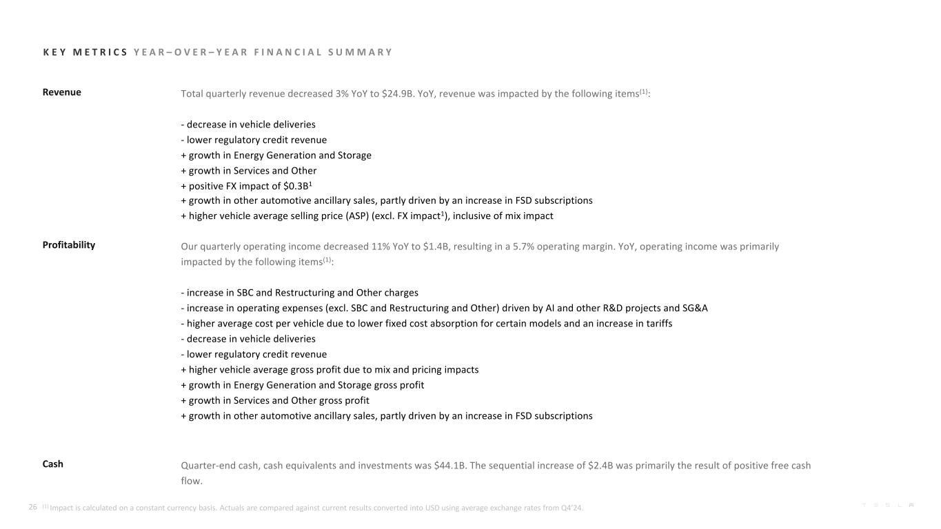 Revenue Total quarterly revenue decreased 3% YoY to $24.9B. YoY, revenue was impacted by the following items(1): - decrease in vehicle deliveries - lower regulatory credit revenue + growth in Energy Generation and Storage + growth in Services and Other + positive FX impact of $0.3B1 + growth in other automotive ancillary sales, partly driven by an increase in FSD subscriptions + higher vehicle average selling price (ASP) (excl. FX impact1), inclusive of mix impact Profitability Our quarterly operating income decreased 11% YoY to $1.4B, resulting in a 5.7% operating margin. YoY, operating income was primarily impacted by the following items(1): - increase in SBC and Restructuring and Other charges - increase in operating expenses (excl. SBC and Restructuring and Other) driven by AI and other R&D projects and SG&A - higher average cost per vehicle due to lower fixed cost absorption for certain models and an increase in tariffs - decrease in vehicle deliveries - lower regulatory credit revenue + higher vehicle average gross profit due to mix and pricing impacts + growth in Energy Generation and Storage gross profit + growth in Services and Other gross profit + growth in other automotive ancillary sales, partly driven by an increase in FSD subscriptions Cash Quarter-end cash, cash equivalents and investments was $44.1B. The sequential increase of $2.4B was primarily the result of positive free cash flow. 26 (1) Impact is calculated on a constant currency basis. Actuals are compared against current results converted into USD using average exchange rates from Q4’24. K E Y M E T R I C S Y E A R – O V E R – Y E A R F I N A N C I A L S U M M A R Y