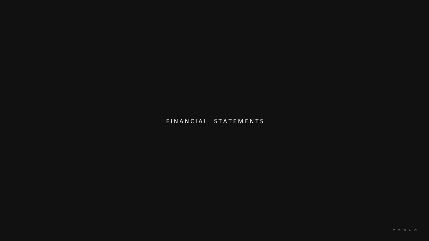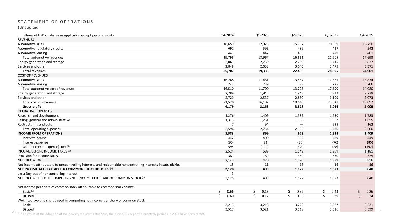 In millions of USD or shares as applicable, except per share data Q4-2024 Q1-2025 Q2-2025 Q3-2025 Q4-2025 REVENUES Automotive sales 18,659 12,925 15,787 20,359 16,750 Automotive regulatory credits 692 595 439 417 542 Automotive leasing 447 447 435 429 401 Total automotive revenues 19,798 13,967 16,661 21,205 17,693 Energy generation and storage 3,061 2,730 2,789 3,415 3,837 Services and other 2,848 2,638 3,046 3,475 3,371 Total revenues 25,707 19,335 22,496 28,095 24,901 COST OF REVENUES Automotive sales 16,268 11,461 13,567 17,365 13,874 Automotive leasing 242 239 228 225 206 Total automotive cost of revenues 16,510 11,700 13,795 17,590 14,080 Energy generation and storage 2,289 1,945 1,943 2,342 2,739 Services and other 2,729 2,537 2,880 3,109 3,073 Total cost of revenues 21,528 16,182 18,618 23,041 19,892 Gross profit 4,179 3,153 3,878 5,054 5,009 OPERATING EXPENSES Research and development 1,276 1,409 1,589 1,630 1,783 Selling, general and administrative 1,313 1,251 1,366 1,562 1,655 Restructuring and other 7 94 — 238 162 Total operating expenses 2,596 2,754 2,955 3,430 3,600 INCOME FROM OPERATIONS 1,583 399 923 1,624 1,409 Interest income 442 400 392 439 449 Interest expense (96) (91) (86) (76) (85) Other income (expense), net (1) 595 (119) 320 (28) (592) INCOME BEFORE INCOME TAXES (1) 2,524 589 1,549 1,959 1,181 Provision for income taxes (1) 381 169 359 570 325 NET INCOME (1) 2,143 420 1,190 1,389 856 Net income attributable to noncontrolling interests and redeemable noncontrolling interests in subsidiaries 15 11 18 16 16 NET INCOME ATTRIBUTABLE TO COMMON STOCKHOLDERS (1) 2,128 409 1,172 1,373 840 Less: Buy-out of noncontrolling interest 3 — — — — NET INCOME USED IN COMPUTING NET INCOME PER SHARE OF COMMON STOCK (1) 2,125 409 1,172 1,373 840 Net income per share of common stock attributable to common stockholders Basic (1) $ 0.66 $ 0.13 $ 0.36 $ 0.43 $ 0.26 Diluted (1) $ 0.60 $ 0.12 $ 0.33 $ 0.39 $ 0.24 Weighted average shares used in computing net income per share of common stock Basic 3,213 3,218 3,223 3,227 3,231 Diluted 3,517 3,521 3,519 3,526 3,539 S T A T E M E N T O F O P E R A T I O N S (Unaudited) 28 (1) As a result of the adoption of the new crypto assets standard, the previously reported quarterly periods in 2024 have been recast.