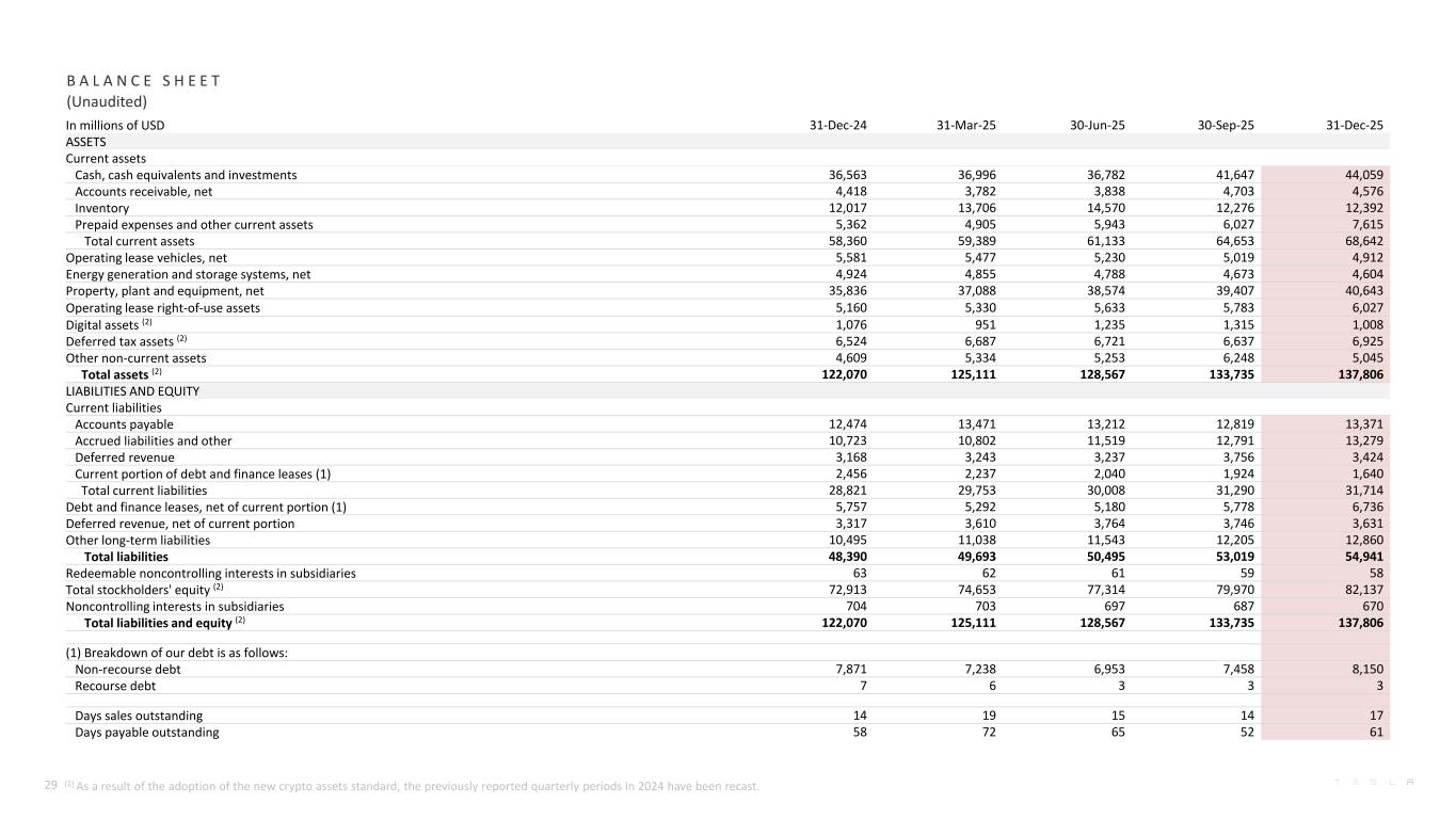B A L A N C E S H E E T (Unaudited) In millions of USD 31-Dec-24 31-Mar-25 30-Jun-25 30-Sep-25 31-Dec-25 ASSETS Current assets Cash, cash equivalents and investments 36,563 36,996 36,782 41,647 44,059 Accounts receivable, net 4,418 3,782 3,838 4,703 4,576 Inventory 12,017 13,706 14,570 12,276 12,392 Prepaid expenses and other current assets 5,362 4,905 5,943 6,027 7,615 Total current assets 58,360 59,389 61,133 64,653 68,642 Operating lease vehicles, net 5,581 5,477 5,230 5,019 4,912 Energy generation and storage systems, net 4,924 4,855 4,788 4,673 4,604 Property, plant and equipment, net 35,836 37,088 38,574 39,407 40,643 Operating lease right-of-use assets 5,160 5,330 5,633 5,783 6,027 Digital assets (2) 1,076 951 1,235 1,315 1,008 Deferred tax assets (2) 6,524 6,687 6,721 6,637 6,925 Other non-current assets 4,609 5,334 5,253 6,248 5,045 Total assets (2) 122,070 125,111 128,567 133,735 137,806 LIABILITIES AND EQUITY Current liabilities Accounts payable 12,474 13,471 13,212 12,819 13,371 Accrued liabilities and other 10,723 10,802 11,519 12,791 13,279 Deferred revenue 3,168 3,243 3,237 3,756 3,424 Current portion of debt and finance leases (1) 2,456 2,237 2,040 1,924 1,640 Total current liabilities 28,821 29,753 30,008 31,290 31,714 Debt and finance leases, net of current portion (1) 5,757 5,292 5,180 5,778 6,736 Deferred revenue, net of current portion 3,317 3,610 3,764 3,746 3,631 Other long-term liabilities 10,495 11,038 11,543 12,205 12,860 Total liabilities 48,390 49,693 50,495 53,019 54,941 Redeemable noncontrolling interests in subsidiaries 63 62 61 59 58 Total stockholders' equity (2) 72,913 74,653 77,314 79,970 82,137 Noncontrolling interests in subsidiaries 704 703 697 687 670 Total liabilities and equity (2) 122,070 125,111 128,567 133,735 137,806 (1) Breakdown of our debt is as follows: Non-recourse debt 7,871 7,238 6,953 7,458 8,150 Recourse debt 7 6 3 3 3 Days sales outstanding 14 19 15 14 17 Days payable outstanding 58 72 65 52 61 29 (2) As a result of the adoption of the new crypto assets standard, the previously reported quarterly periods in 2024 have been recast.