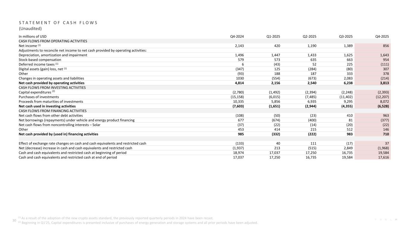 In millions of USD Q4-2024 Q1-2025 Q2-2025 Q3-2025 Q4-2025 CASH FLOWS FROM OPERATING ACTIVITIES Net income (1) 2,143 420 1,190 1,389 856 Adjustments to reconcile net income to net cash provided by operating activities: Depreciation, amortization and impairment 1,496 1,447 1,433 1,625 1,643 Stock-based compensation 579 573 635 663 954 Deferred income taxes (1) 6 (43) 52 225 (111) Digital assets (gain) loss, net (1) (347) 125 (284) (80) 307 Other (93) 188 187 333 378 Changes in operating assets and liabilities 1030 (554) (673) 2,083 (214) Net cash provided by operating activities 4,814 2,156 2,540 6,238 3,813 CASH FLOWS FROM INVESTING ACTIVITIES Capital expenditures (2) (2,780) (1,492) (2,394) (2,248) (2,393) Purchases of investments (15,158) (6,015) (7,485) (11,402) (12,207) Proceeds from maturities of investments 10,335 5,856 6,935 9,295 8,072 Net cash used in investing activities (7,603) (1,651) (2,944) (4,355) (6,528) CASH FLOWS FROM FINANCING ACTIVITIES Net cash flows from other debt activities (108) (50) (23) 410 963 Net borrowings (repayments) under vehicle and energy product financing 677 (674) (400) 81 (377) Net cash flows from noncontrolling interests – Solar (37) (22) (14) (20) (22) Other 453 414 215 512 146 Net cash provided by (used in) financing activities 985 (332) (222) 983 710 Effect of exchange rate changes on cash and cash equivalents and restricted cash (133) 40 111 (17) 37 Net (decrease) increase in cash and cash equivalents and restricted cash (1,937) 213 (515) 2,849 (1,968) Cash and cash equivalents and restricted cash at beginning of period 18,974 17,037 17,250 16,735 19,584 Cash and cash equivalents and restricted cash at end of period 17,037 17,250 16,735 19,584 17,616 S T A T E M E N T O F C A S H F L O W S (Unaudited) 30 (1) As a result of the adoption of the new crypto assets standard, the previously reported quarterly periods in 2024 have been recast. (2) Beginning in Q1'25, Capital expenditures is presented inclusive of purchases of energy generation and storage systems and all prior periods have been adjusted.