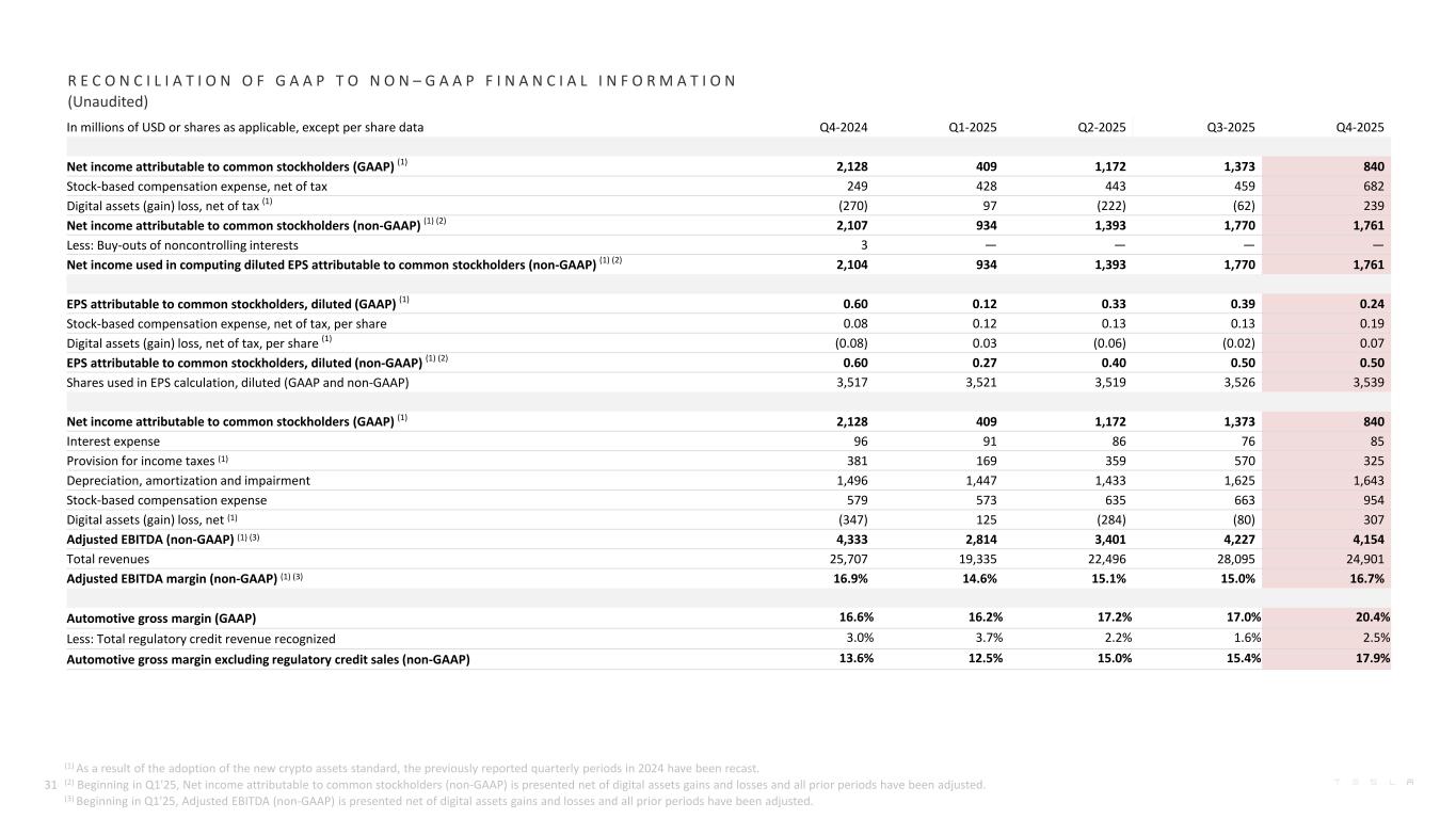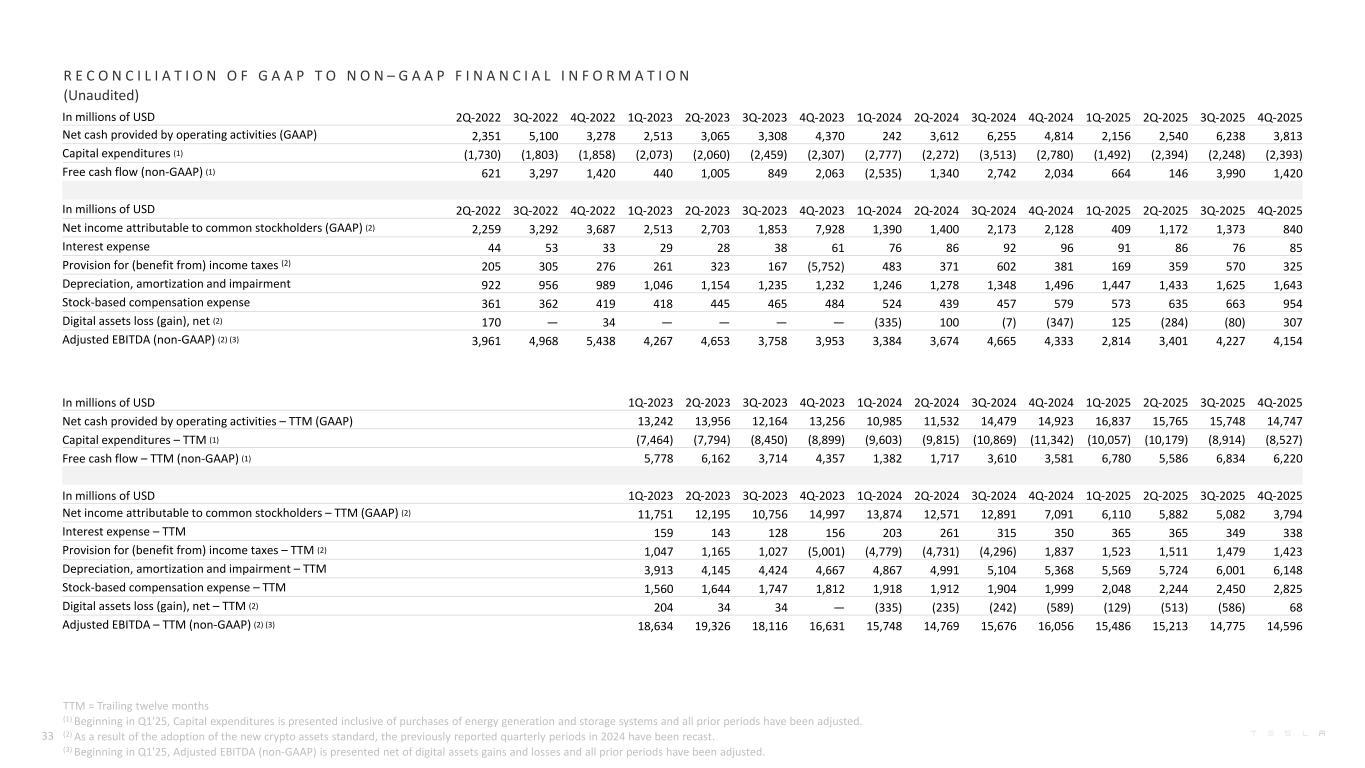 In millions of USD or shares as applicable, except per share data 2021 2022 2023 2024 2025 Net income attributable to common stockholders (GAAP) 5,519 12,556 14,997 7,091 3,794 Stock-based compensation expense, net of tax 2,121 1,560 1,812 1,328 2,012 Digital assets loss (gain), net of tax 79 160 — (459) 52 Release of valuation allowance on deferred tax assets — — (5,927) — — Net income attributable to common stockholders (non-GAAP) (1) 7,719 14,276 10,882 7,960 5,858 Less: Buy-outs of noncontrolling interests (5) (27) (2) (39) — Less: Dilutive convertible debt (9) (1) — — — Net income used in computing diluted EPS attributable to common stockholders (non-GAAP) (1) 7,733 14,304 10,884 7,999 5,858 EPS attributable to common stockholders, diluted (GAAP) 1.63 3.62 4.30 2.04 1.08 Stock-based compensation expense, net of tax, per share 0.63 0.45 0.52 0.38 0.57 Digital assets loss (gain), net of tax, per share 0.02 0.05 — (0.13) 0.01 Release of valuation allowance on deferred tax assets — — (1.70) — — EPS attributable to common stockholders, diluted (non-GAAP) (1) 2.28 4.12 3.12 2.29 1.66 Shares used in EPS calculation, diluted (GAAP and non-GAAP) 3,386 3,475 3,485 3,498 3,528 Net income attributable to common stockholders (GAAP) 5,519 12,556 14,997 7,091 3,794 Interest expense 371 191 156 350 338 Provision for (benefit from) income taxes 699 1132 (5,001) 1,837 1,423 Depreciation, amortization and impairment 2,911 3,747 4,667 5,368 6,148 Stock-based compensation expense 2,121 1,560 1,812 1,999 2,825 Digital assets loss (gain), net 101 204 — (589) 68 Adjusted EBITDA (non-GAAP) (2) 11,722 19,390 16,631 16,056 14,596 Total revenues 53,823 81,462 96,773 97,690 94,827 Adjusted EBITDA margin (non-GAAP) (2) 21.8% 23.8% 17.2% 16.4% 15.4% Automotive gross margin (GAAP) 29.3% 28.5% 19.4% 18.4% 17.8% Less: Total regulatory credit revenue recognized 2.3% 1.8% 1.7% 3.0% 2.4% Automotive gross margin excluding regulatory credit sales (non-GAAP) 27.0% 26.7% 17.7% 15.4% 15.4% R E C O N C I L I A T I O N O F G A A P T O N O N – G A A P F I N A N C I A L I N F O R M A T I O N (Unaudited) 32 (1) Beginning in Q1'25, Net income attributable to common stockholders (non-GAAP) is presented net of digital assets gains and losses and all prior periods have been adjusted. (2) Beginning in Q1'25, Adjusted EBITDA (non-GAAP) is presented net of digital assets gains and losses and all prior periods have been adjusted.