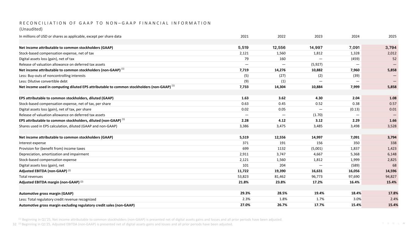 In millions of USD or shares as applicable, except per share data Q4-2024 Q1-2025 Q2-2025 Q3-2025 Q4-2025 Net income attributable to common stockholders (GAAP) (1) 2,128 409 1,172 1,373 840 Stock-based compensation expense, net of tax 249 428 443 459 682 Digital assets (gain) loss, net of tax (1) (270) 97 (222) (62) 239 Net income attributable to common stockholders (non-GAAP) (1) (2) 2,107 934 1,393 1,770 1,761 Less: Buy-outs of noncontrolling interests 3 — — — — Net income used in computing diluted EPS attributable to common stockholders (non-GAAP) (1) (2) 2,104 934 1,393 1,770 1,761 EPS attributable to common stockholders, diluted (GAAP) (1) 0.60 0.12 0.33 0.39 0.24 Stock-based compensation expense, net of tax, per share 0.08 0.12 0.13 0.13 0.19 Digital assets (gain) loss, net of tax, per share (1) (0.08) 0.03 (0.06) (0.02) 0.07 EPS attributable to common stockholders, diluted (non-GAAP) (1) (2) 0.60 0.27 0.40 0.50 0.50 Shares used in EPS calculation, diluted (GAAP and non-GAAP) 3,517 3,521 3,519 3,526 3,539 Net income attributable to common stockholders (GAAP) (1) 2,128 409 1,172 1,373 840 Interest expense 96 91 86 76 85 Provision for income taxes (1) 381 169 359 570 325 Depreciation, amortization and impairment 1,496 1,447 1,433 1,625 1,643 Stock-based compensation expense 579 573 635 663 954 Digital assets (gain) loss, net (1) (347) 125 (284) (80) 307 Adjusted EBITDA (non-GAAP) (1) (3) 4,333 2,814 3,401 4,227 4,154 Total revenues 25,707 19,335 22,496 28,095 24,901 Adjusted EBITDA margin (non-GAAP) (1) (3) 16.9% 14.6% 15.1% 15.0% 16.7% Automotive gross margin (GAAP) 16.6% 16.2% 17.2% 17.0% 20.4% Less: Total regulatory credit revenue recognized 3.0% 3.7% 2.2% 1.6% 2.5% Automotive gross margin excluding regulatory credit sales (non-GAAP) 13.6% 12.5% 15.0% 15.4% 17.9% R E C O N C I L I A T I O N O F G A A P T O N O N – G A A P F I N A N C I A L I N F O R M A T I O N (Unaudited) 31 (1) As a result of the adoption of the new crypto assets standard, the previously reported quarterly periods in 2024 have been recast. (2) Beginning in Q1'25, Net income attributable to common stockholders (non-GAAP) is presented net of digital assets gains and losses and all prior periods have been adjusted. (3) Beginning in Q1'25, Adjusted EBITDA (non-GAAP) is presented net of digital assets gains and losses and all prior periods have been adjusted.