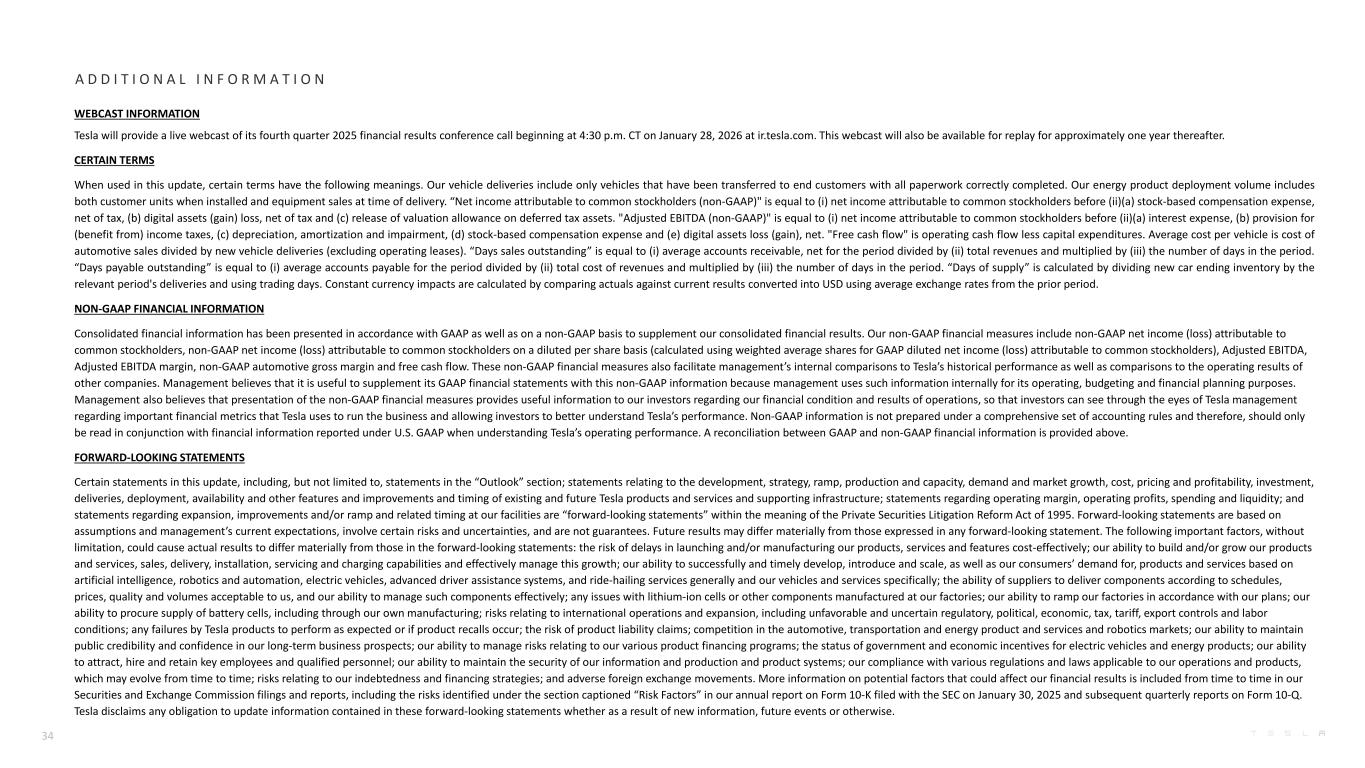 A D D I T I O N A L I N F O R M A T I O N WEBCAST INFORMATION Tesla will provide a live webcast of its fourth quarter 2025 financial results conference call beginning at 4:30 p.m. CT on January 28, 2026 at ir.tesla.com. This webcast will also be available for replay for approximately one year thereafter. CERTAIN TERMS When used in this update, certain terms have the following meanings. Our vehicle deliveries include only vehicles that have been transferred to end customers with all paperwork correctly completed. Our energy product deployment volume includes both customer units when installed and equipment sales at time of delivery. “Net income attributable to common stockholders (non-GAAP)" is equal to (i) net income attributable to common stockholders before (ii)(a) stock-based compensation expense, net of tax, (b) digital assets (gain) loss, net of tax and (c) release of valuation allowance on deferred tax assets. "Adjusted EBITDA (non-GAAP)" is equal to (i) net income attributable to common stockholders before (ii)(a) interest expense, (b) provision for (benefit from) income taxes, (c) depreciation, amortization and impairment, (d) stock-based compensation expense and (e) digital assets loss (gain), net. "Free cash flow" is operating cash flow less capital expenditures. Average cost per vehicle is cost of automotive sales divided by new vehicle deliveries (excluding operating leases). “Days sales outstanding” is equal to (i) average accounts receivable, net for the period divided by (ii) total revenues and multiplied by (iii) the number of days in the period. “Days payable outstanding” is equal to (i) average accounts payable for the period divided by (ii) total cost of revenues and multiplied by (iii) the number of days in the period. “Days of supply” is calculated by dividing new car ending inventory by the relevant period's deliveries and using trading days. Constant currency impacts are calculated by comparing actuals against current results converted into USD using average exchange rates from the prior period. NON-GAAP FINANCIAL INFORMATION Consolidated financial information has been presented in accordance with GAAP as well as on a non-GAAP basis to supplement our consolidated financial results. Our non-GAAP financial measures include non-GAAP net income (loss) attributable to common stockholders, non-GAAP net income (loss) attributable to common stockholders on a diluted per share basis (calculated using weighted average shares for GAAP diluted net income (loss) attributable to common stockholders), Adjusted EBITDA, Adjusted EBITDA margin, non-GAAP automotive gross margin and free cash flow. These non-GAAP financial measures also facilitate management’s internal comparisons to Tesla’s historical performance as well as comparisons to the operating results of other companies. Management believes that it is useful to supplement its GAAP financial statements with this non-GAAP information because management uses such information internally for its operating, budgeting and financial planning purposes. Management also believes that presentation of the non-GAAP financial measures provides useful information to our investors regarding our financial condition and results of operations, so that investors can see through the eyes of Tesla management regarding important financial metrics that Tesla uses to run the business and allowing investors to better understand Tesla’s performance. Non-GAAP information is not prepared under a comprehensive set of accounting rules and therefore, should only be read in conjunction with financial information reported under U.S. GAAP when understanding Tesla’s operating performance. A reconciliation between GAAP and non-GAAP financial information is provided above. FORWARD-LOOKING STATEMENTS Certain statements in this update, including, but not limited to, statements in the “Outlook” section; statements relating to the development, strategy, ramp, production and capacity, demand and market growth, cost, pricing and profitability, investment, deliveries, deployment, availability and other features and improvements and timing of existing and future Tesla products and services and supporting infrastructure; statements regarding operating margin, operating profits, spending and liquidity; and statements regarding expansion, improvements and/or ramp and related timing at our facilities are “forward-looking statements” within the meaning of the Private Securities Litigation Reform Act of 1995. Forward-looking statements are based on assumptions and management’s current expectations, involve certain risks and uncertainties, and are not guarantees. Future results may differ materially from those expressed in any forward-looking statement. The following important factors, without limitation, could cause actual results to differ materially from those in the forward-looking statements: the risk of delays in launching and/or manufacturing our products, services and features cost-effectively; our ability to build and/or grow our products and services, sales, delivery, installation, servicing and charging capabilities and effectively manage this growth; our ability to successfully and timely develop, introduce and scale, as well as our consumers’ demand for, products and services based on artificial intelligence, robotics and automation, electric vehicles, advanced driver assistance systems, and ride-hailing services generally and our vehicles and services specifically; the ability of suppliers to deliver components according to schedules, prices, quality and volumes acceptable to us, and our ability to manage such components effectively; any issues with lithium-ion cells or other components manufactured at our factories; our ability to ramp our factories in accordance with our plans; our ability to procure supply of battery cells, including through our own manufacturing; risks relating to international operations and expansion, includ