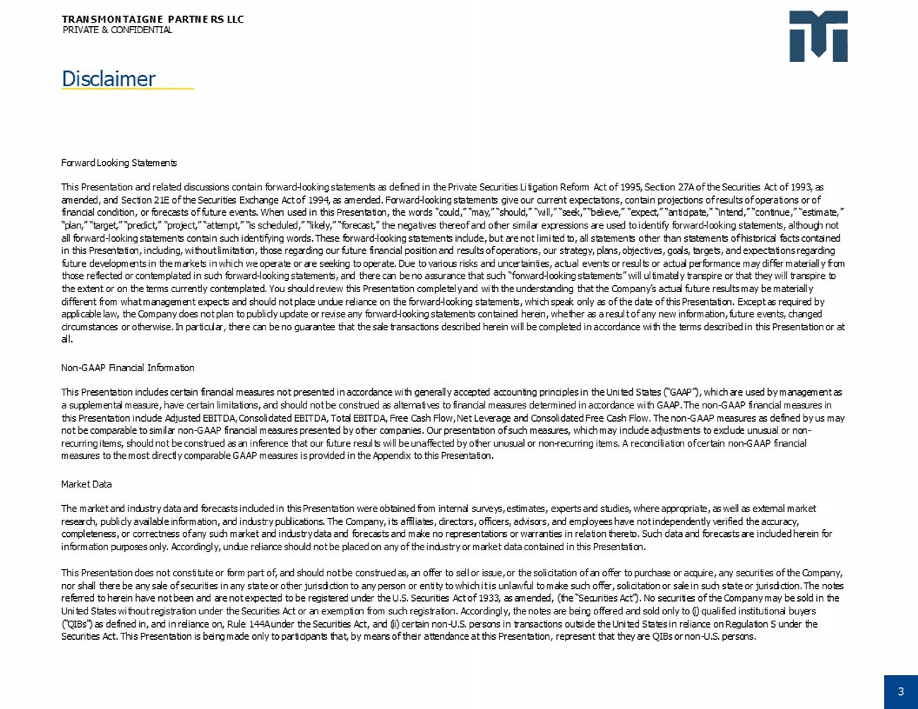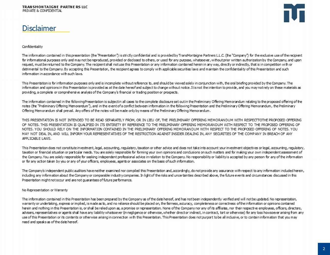 TRANSMONTAIGNE PARTNE RS LLC PRIVATE & CONFIDENTIAL Disclaimer Confidentiality The information contained in this presentation (the “Presentation”) is strictly confidential and is provided by TransMontaigne Partners L.L.C. (the “Company”) for the exclusive use of the recipient for informational purposes only and may not be reproduced, provided or disclosed to others, or used for any purpose, whatsoever, without prior written authorization by the Company, and upon request, must be returned to the Company. The recipient shall not use this Presentation or any information contained herein in any way, directly or indirectly, that is in competition with or detrimental to the Company. By accepting this Presentation, the recipient agrees to comply with applicable securities laws and maintain the confidentiality of this Presentation and such information in accordance with such laws. This Presentation is for information purposes only and is incomplete without reference to, and should be viewed solely in conjunction with, the oral briefing provided by the Company. The information and opinions in this Presentation is provided as at the date hereof and subject to change without notice. It is not the intention to provide, and you may not rely on these materials as providing, a complete or comprehensive analysis of the Company’s financial or trading position or prospects. The information contained in the following Presentation is subject in all cases to the complete disclosure set out in the Preliminary Offering Memorandum relating to the proposed offering of the notes (the “Preliminary Offering Memorandum”), and in the event of a conflict between information in the following Presentation and the Preliminary Offering Memorandum, the Preliminary Offering Memorandum shall prevail. Any offers of the notes will be made only by means of the Preliminary Offering Memorandum. THIS PRESENTATION IS NOT INTENDED TO BE READ SEPARATELY FROM, OR IN LIEU OF, THE PRELIMINARY OFFERING MEMORANDUM WITH RESPECTTOTHE PROPOSED OFFERING OF NOTES. THIS PRESENTATION IS QUALIFIED IN ITS ENTIRETY BY REFERENCE TO THE PRELIMINARY OFFERING MEMORANDUM WITH RESPECT TO THE PROPOSED OFFERING OF NOTES. YOU SHOULD RELY ON THE INFORMATION CONTAINED IN THE PRELIMINARY OFFERING MEMORANDUM WITH RESPECT TO THE PROPOSED OFFERING OF NOTES. YOU MAY NOT DEAL IN, AND WILL INFORM YOUR REPRESENTATIVES OF THE RESTRICTION AGAINST INSIDER DEALING IN, ANY SECURITIES OF THE COMPANY IN BREACH OF ANY APPLICABLE LAWS. This Presentation does not constitute investment, legal, accounting, regulatory, taxation or other advice and does not take into account your investment objectives or legal, accounting, regulatory, taxation or financial situation or particular needs. You are solely responsible for forming your own opinions and conclusions on such matters and for making your own independent assessment of the Company. You are solely responsible for seeking independent professional advice in relation to the Company. No responsibility or liability is accepted by any person for any of the information or for any action taken by you or any of your officers, employees, agents or associates on the basis of such information. The Company’s independent public auditors have neither examined nor compiled this Presentation and, accordingly, do not provide any assurance with respect to any information included herein, including any information about the Company or comparable industry companies. In light of the risks and uncertainties described above, the future events and circumstances discussed in this Presentation might not occur and are not guarantees of future performance. No Representation or Warranty The information contained in this Presentation has been prepared by the Company as of the date hereof, and has not been independently verified and will not be updated. No representation, warranty or undertaking, express or implied, is made as to, and no reliance should be placed on, the fairness, accuracy, completeness or correctness of the information or opinions contained herein and nothing in this Presentation is, or shall be relied upon as, a promise or representation. None of the Company nor any of its affiliates, nor their respective employees, officers, directors, advisers, representatives or agents shall have any liability whatsoever (in negligence or otherwise, whether direct or indirect, in contract, tort or otherwise) for any loss howsoever arising from any use of this Presentation or its contents or otherwise arising in connection with this Presentation. This Presentation does not purport to be all inclusive, or to contain information that you may need and speaks as of the date hereof. 2