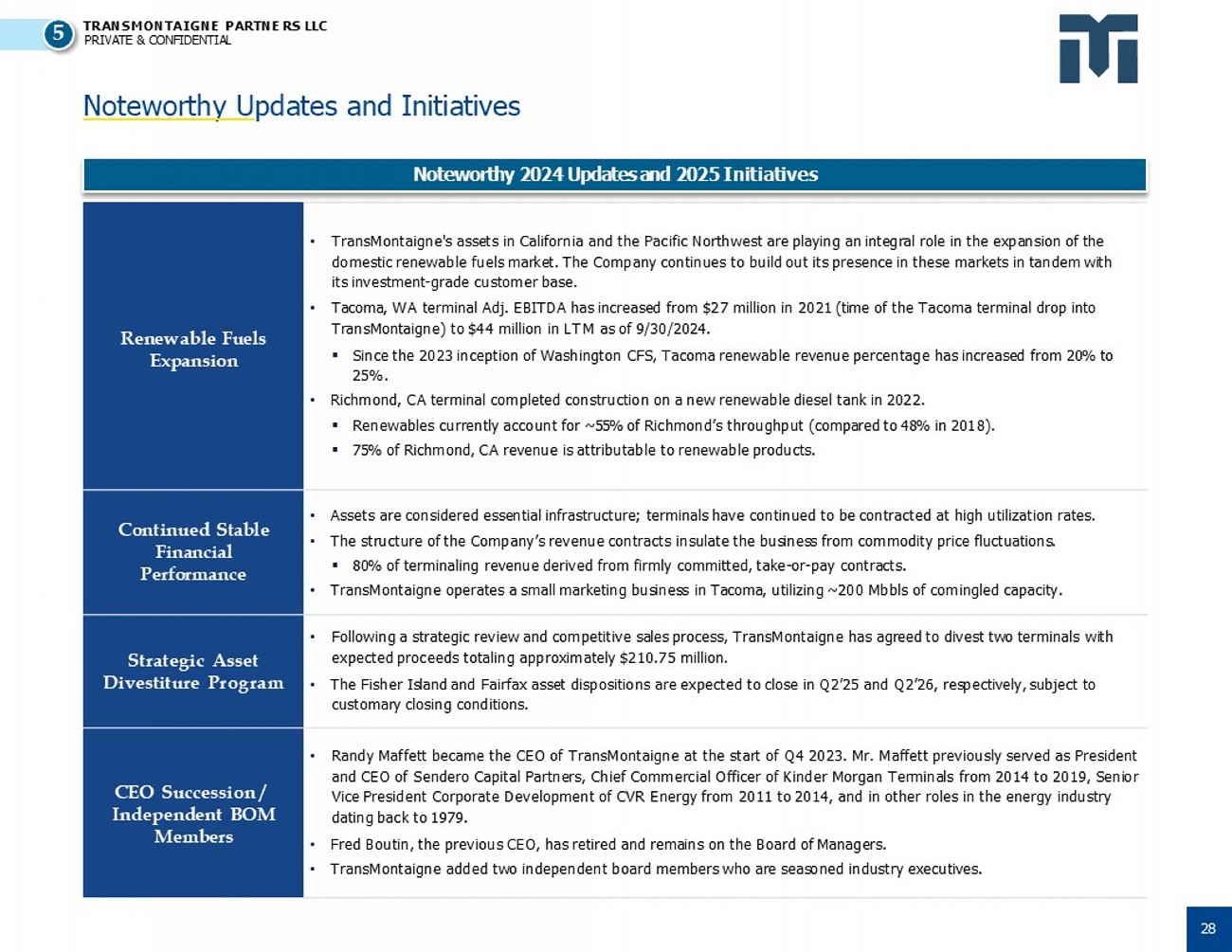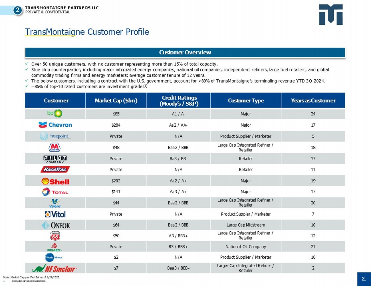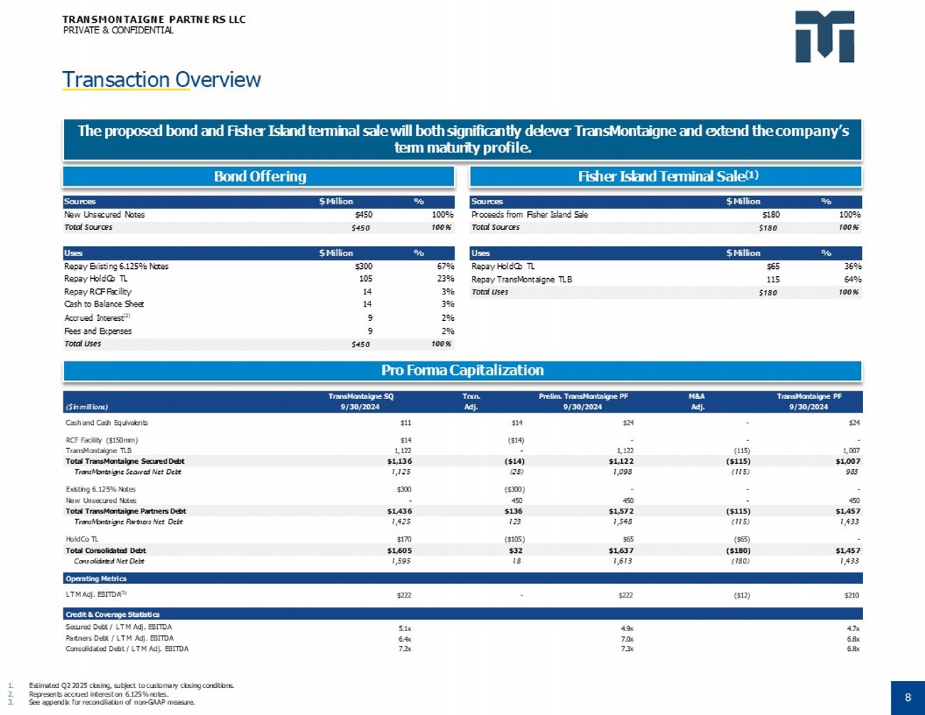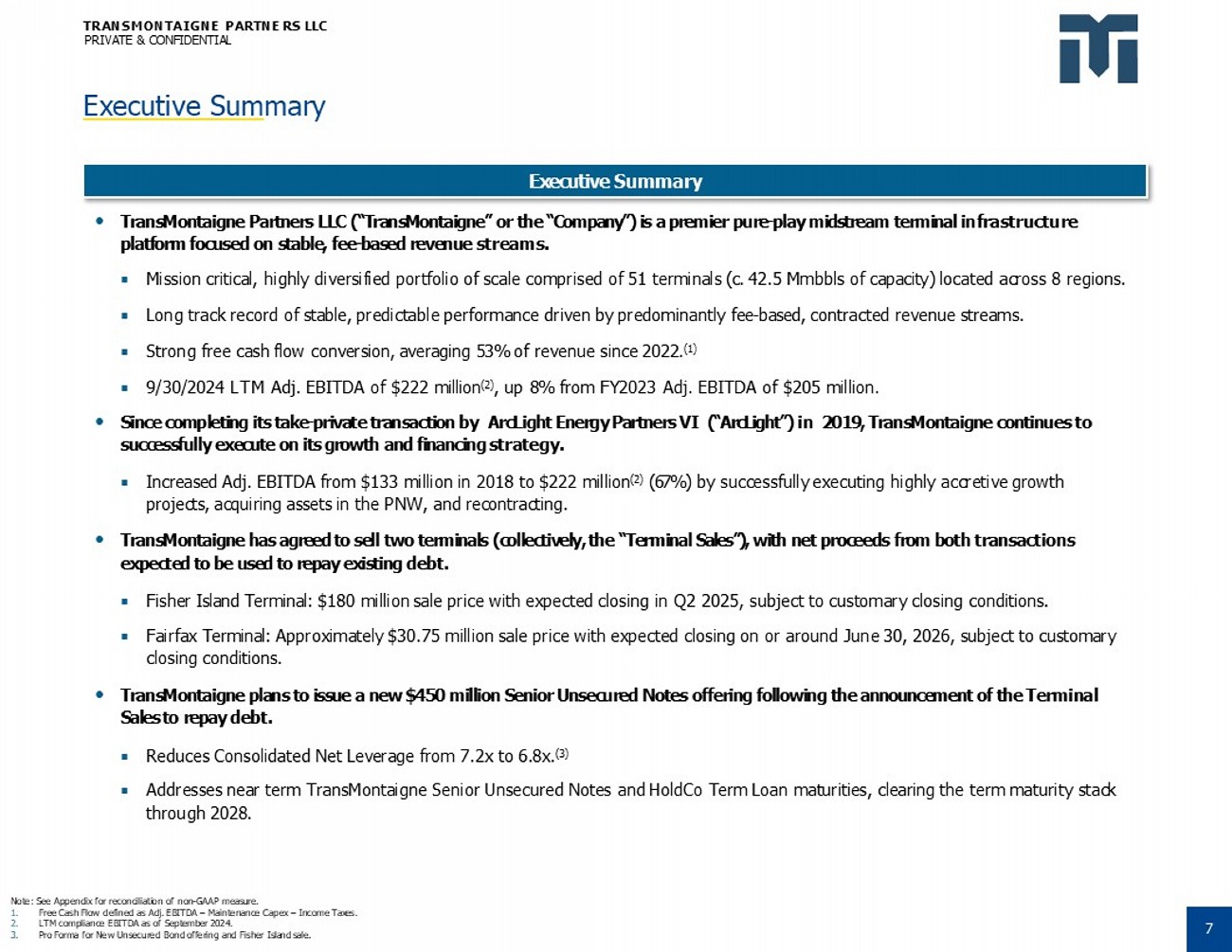 TRANSMONTAIGNE PARTNE RS LLC PRIVATE & CONFIDENTIAL Executive Sum mary Note: See Appendix for reconciliation of non - GAAP measure. 1. Free Cash Flow defined as Adj. EBITDA – Maintenance Capex – Income Taxes. 2. LTM compliance EBITDA as of September 2024. 3. Pro Forma for New Unsecured Bond offering and Fisher Island sale. Executive Summary TransMontaigne Partners LLC (“TransMontaigne” or the “Company”) is a premier pure - play midstream terminal infrastructure platform focused on stable, fee - based revenue streams. Mission critical, highly diversified portfolio of scale comprised of 51 terminals (c. 42.5 Mmbbls of capacity) located across 8 regions. Long track record of stable, predictable performance driven by predominantly fee - based, contracted revenue streams. Strong free cash flow conversion, averaging 53% of revenue since 2022. (1) 9/30/2024 LTM Adj. EBITDA of $222 million (2) , up 8% from FY2023 Adj. EBITDA of $205 million. Since completing its take - private transaction by ArcLight Energy Partners VI (“ArcLight”) in 2019, TransMontaigne continues to successfully execute on its growth and financing strategy. Increased Adj. EBITDA from $133 million in 2018 to $222 million (2) (67%) by successfully executing highly accretive growth projects, acquiring assets in the PNW, and recontracting. TransMontaigne has agreed to sell two terminals (collectively, the “Terminal Sales”), with net proceeds from both transactions expected to be used to repay existing debt. Fisher Island Terminal: $180 million sale price with expected closing in Q2 2025, subject to customary closing conditions. Fairfax Terminal: Approximately $30.75 million sale price with expected closing on or around June 30, 2026, subject to customary closing conditions. TransMontaigne plans to issue a new $450 million Senior Unsecured Notes offering following the announcement of the Terminal Sales to repay debt. Reduces Consolidated Net Leverage from 7.2x to 6.8x. (3) Addresses near term TransMontaigne Senior Unsecured Notes and HoldCo Term Loan maturities, clearing the term maturity stack through 2028. 7