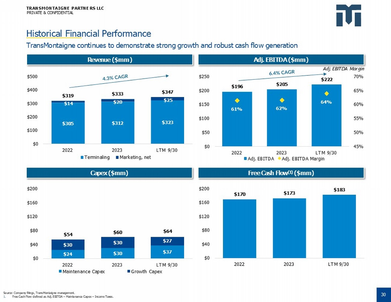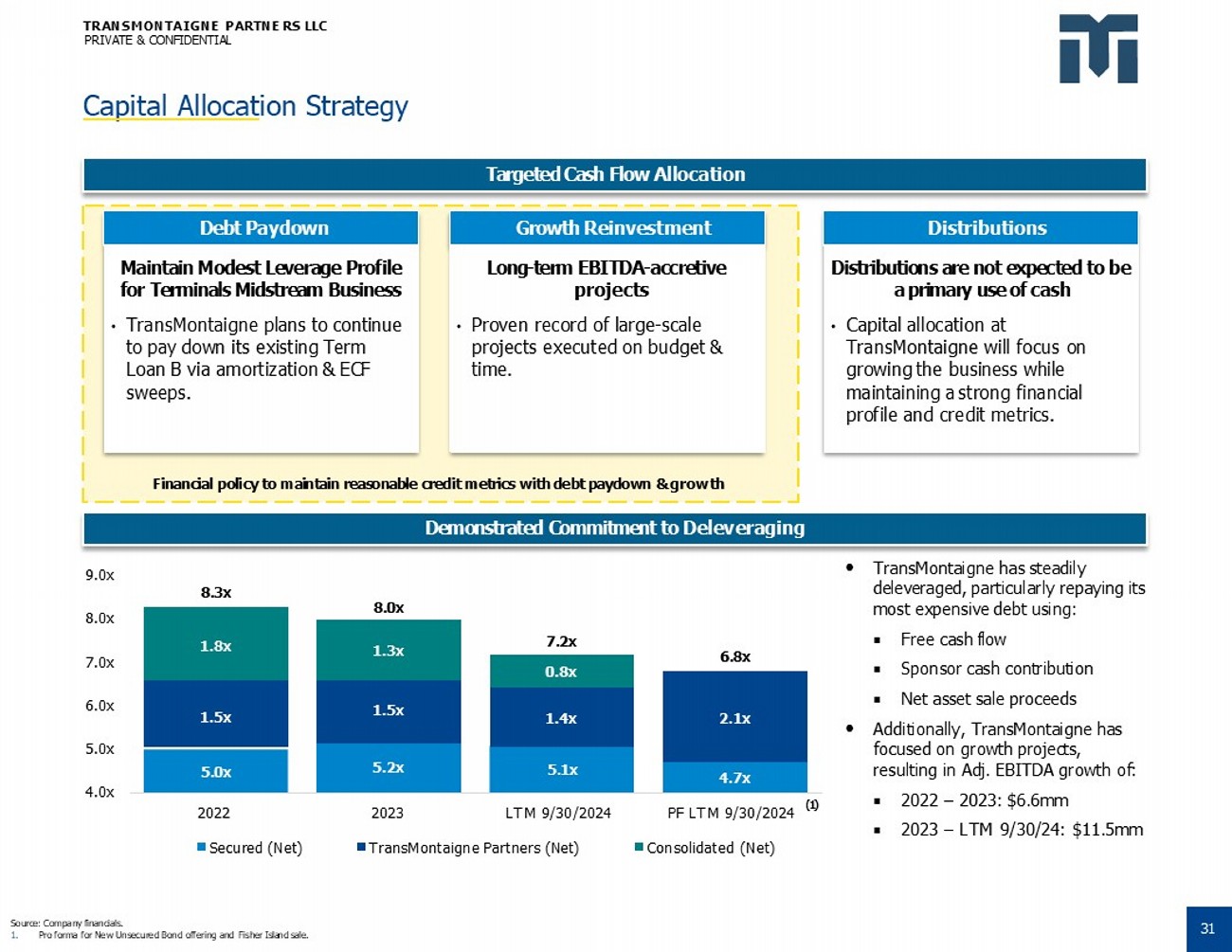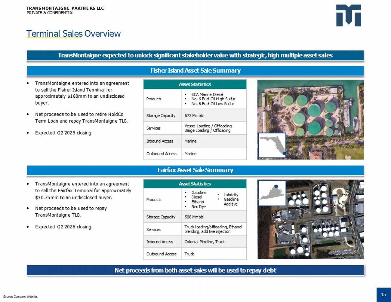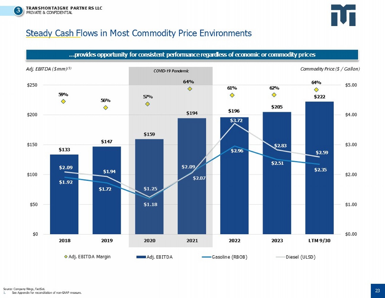 TRANSMONTAIGNE PARTNE RS LLC PRIVATE & CONFIDENTIAL Executive Sum mary Note: See Appendix for reconciliation of non - GAAP measure. 1. Free Cash Flow defined as Adj. EBITDA – Maintenance Capex – Income Taxes. 2. LTM compliance EBITDA as of September 2024. 3. Pro Forma for New Unsecured Bond offering and Fisher Island sale. Executive Summary TransMontaigne Partners LLC (“TransMontaigne” or the “Company”) is a premier pure - play midstream terminal infrastructure platform focused on stable, fee - based revenue streams. Mission critical, highly diversified portfolio of scale comprised of 51 terminals (c. 42.5 Mmbbls of capacity) located across 8 regions. Long track record of stable, predictable performance driven by predominantly fee - based, contracted revenue streams. Strong free cash flow conversion, averaging 53% of revenue since 2022. (1) 9/30/2024 LTM Adj. EBITDA of $222 million (2) , up 8% from FY2023 Adj. EBITDA of $205 million. Since completing its take - private transaction by ArcLight Energy Partners VI (“ArcLight”) in 2019, TransMontaigne continues to successfully execute on its growth and financing strategy. Increased Adj. EBITDA from $133 million in 2018 to $222 million (2) (67%) by successfully executing highly accretive growth projects, acquiring assets in the PNW, and recontracting. TransMontaigne has agreed to sell two terminals (collectively, the “Terminal Sales”), with net proceeds from both transactions expected to be used to repay existing debt. Fisher Island Terminal: $180 million sale price with expected closing in Q2 2025, subject to customary closing conditions. Fairfax Terminal: Approximately $30.75 million sale price with expected closing on or around June 30, 2026, subject to customary closing conditions. TransMontaigne plans to issue a new $450 million Senior Unsecured Notes offering following the announcement of the Terminal Sales to repay debt. Reduces Consolidated Net Leverage from 7.2x to 6.8x. (3) Addresses near term TransMontaigne Senior Unsecured Notes and HoldCo Term Loan maturities, clearing the term maturity stack through 2028. 7