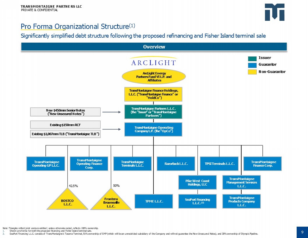 TRANSMONTAIGNE PARTNE RS LLC PRIVATE & CONFIDENTIAL Transaction O verview 1. 2. 3. Estimated Q2 2025 closing, subject to customary closing conditions. Represents accrued interest on 6.125% notes. See appendix for reconciliation of non - GAAP measure. 8 The proposed bond and Fisher Island terminal sale will both significantly delever TransMontaigne and extend the company’s term maturity profile. Bond Offering Fisher Island Terminal Sale (1) Pro Forma Capitalization TransMontaigne PF 9/30/2024 M&A Adj. Prelim. TransMontaigne PF 9/30/2024 Trxn. Adj. TransMontaigne SQ 9/30/2024 ($ in millions) $24 - $24 $14 $11 Cash and Cash Equivalents - - - ($14) $14 RCF Facility ($150mm) 1,007 (115) 1,122 - 1,122 TransMontaigne TLB $1,007 ($115) $1,122 ($14) $1,136 Total TransMontaigne Secured Debt 983 (115) 1,098 (28) 1,125 TransMontaigne Secured Net Debt - - - ($300) $300 Existing 6.125% Notes 450 - 450 450 - New Unsecured Notes $1,457 ($115) $1,572 $136 $1,436 Total TransMontaigne Partners Debt 1,433 (115) 1,548 123 1,425 TransMontaigne Partners Net Debt - ($65) $65 ($105) $170 HoldCo TL $1,457 ($180) $1,637 $32 $1,605 Total Consolidated Debt 1,433 (180) 1,613 18 1,595 Consolidated Net Debt Operating Metrics $210 ($12) $222 - $222 LTM Adj. EBITDA (3) Credit & Coverage Statistics 4.7x 6.8x 6.8x 4.9x 7.0x 7.3x 5.1x 6.4x 7.2x Secured Debt / LTM Adj. EBITDA Partners Debt / LTM Adj. EBITDA Consolidated Debt / LTM Adj. EBITDA % $ Million Sources % $ Million Sources 100% $180 Proceeds from Fisher Island Sale 100% $450 New Unsecured Notes 100% $180 Total Sources 100% $450 Total Sources % $ Million Uses % $ Million Uses 36% $65 Repay HoldCo TL 67% $300 Repay Existing 6.125% Notes 64% 115 Repay TransMontaigne TLB 23% 105 Repay HoldCo TL 100% $180 Total Uses 3% 14 Repay RCF Facility 3% 14 Cash to Balance Sheet 2% 9 Accrued Interest (2) 2% 9 Fees and Expenses 100% $450 Total Uses