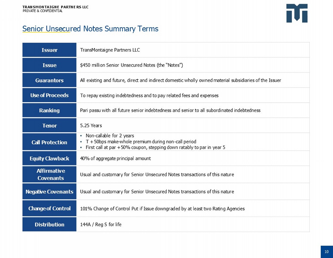 TRANSMONTAIGNE PARTNE RS LLC PRIVATE & CONFIDENTIAL Pro Forma Org anizational Structure (1) Significantly simplified debt structure following the proposed refinancing and Fisher Island terminal sale Note: Triangles reflect joint venture entities’; unless otherwise noted, reflects 100% ownership. 1. 2. Shown pro - forma for both the proposed financing and Fisher Island terminal sale. SeaPort Financing L.L.C. consists of TransMontaigne’s Tacoma Terminal, 51% ownership of SMP (which will be an unrestricted subsidiary of the Company and will not guarantee the New Unsecured Notes), and 30% ownership of Olympic Pipeline. Overview TransMontaigne Finance Holdings, L.L.C. (“TransMontaigne Finance” or “HoldCo”) TransMontaigne Operating GP L.L.C. TransMontaigne Operating Finance Corp. TransMontaigne Terminals L.L.C. Razorback L.L.C. TPSI Terminals L.L.C. TransMontaigne Finance Corp. TPME L.L.C. TransMontaigne Products Company L.L.C. SeaPort Financing L.L.C. (2) New $450mm Senior Notes (“New Unsecured Notes”) TransMontaigne Operating Company L.P. (the “OpCo”) Existing $150mm RCF Existing $1,007mm TLB (“TransMontaigne TLB”) Frontera Brownsville L.L.C. BOSTCO L.L.C. 42.5% 50% TransMontaigne Partners L.L.C. (the “Issuer” or “TransMontaigne Partners”) Issuer Guarantor Non - Guarantor ArcLight Energy Partners Fund VI L.P. and Affiliates Pike West Coast Holdings, LLC TransMontaigne Management Services L.L.C. 9
