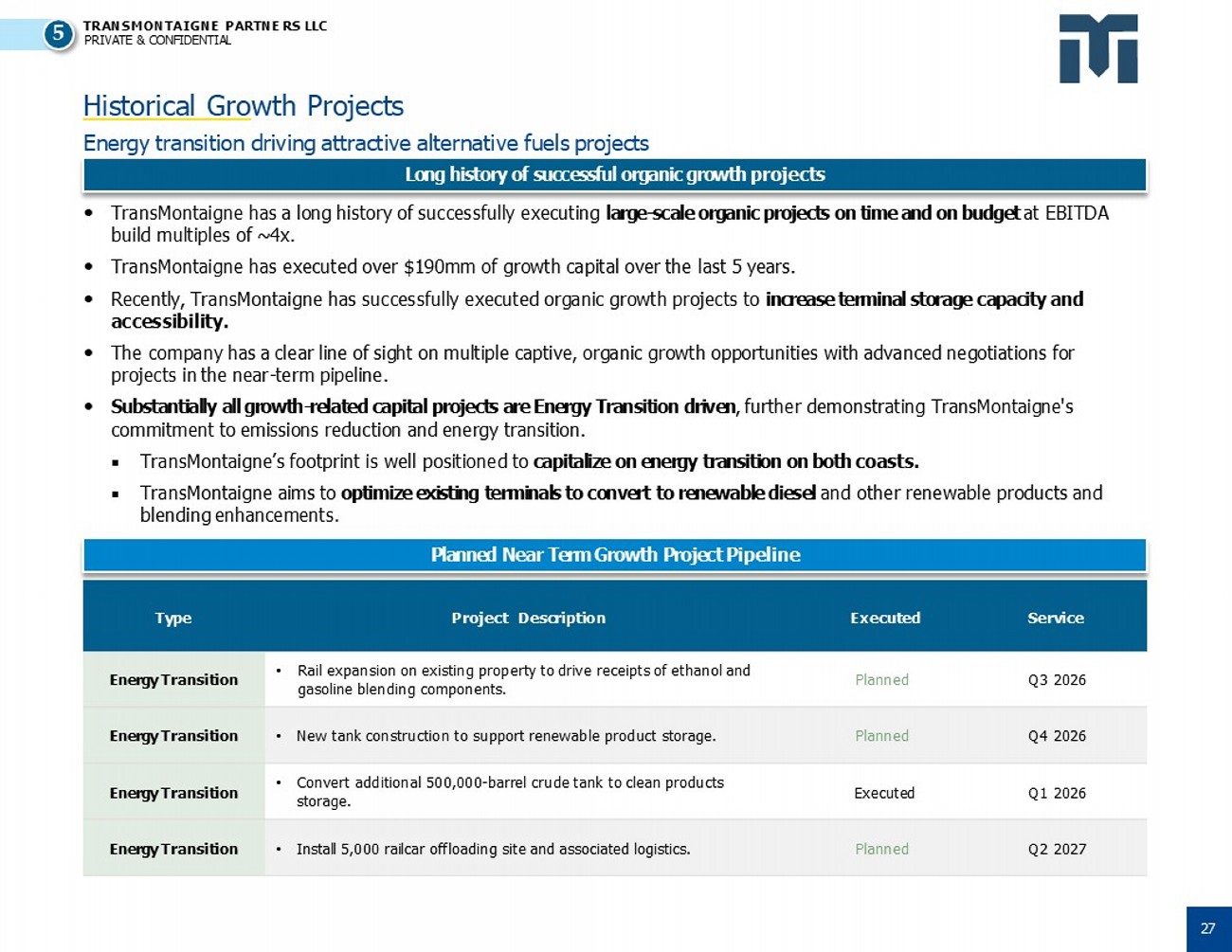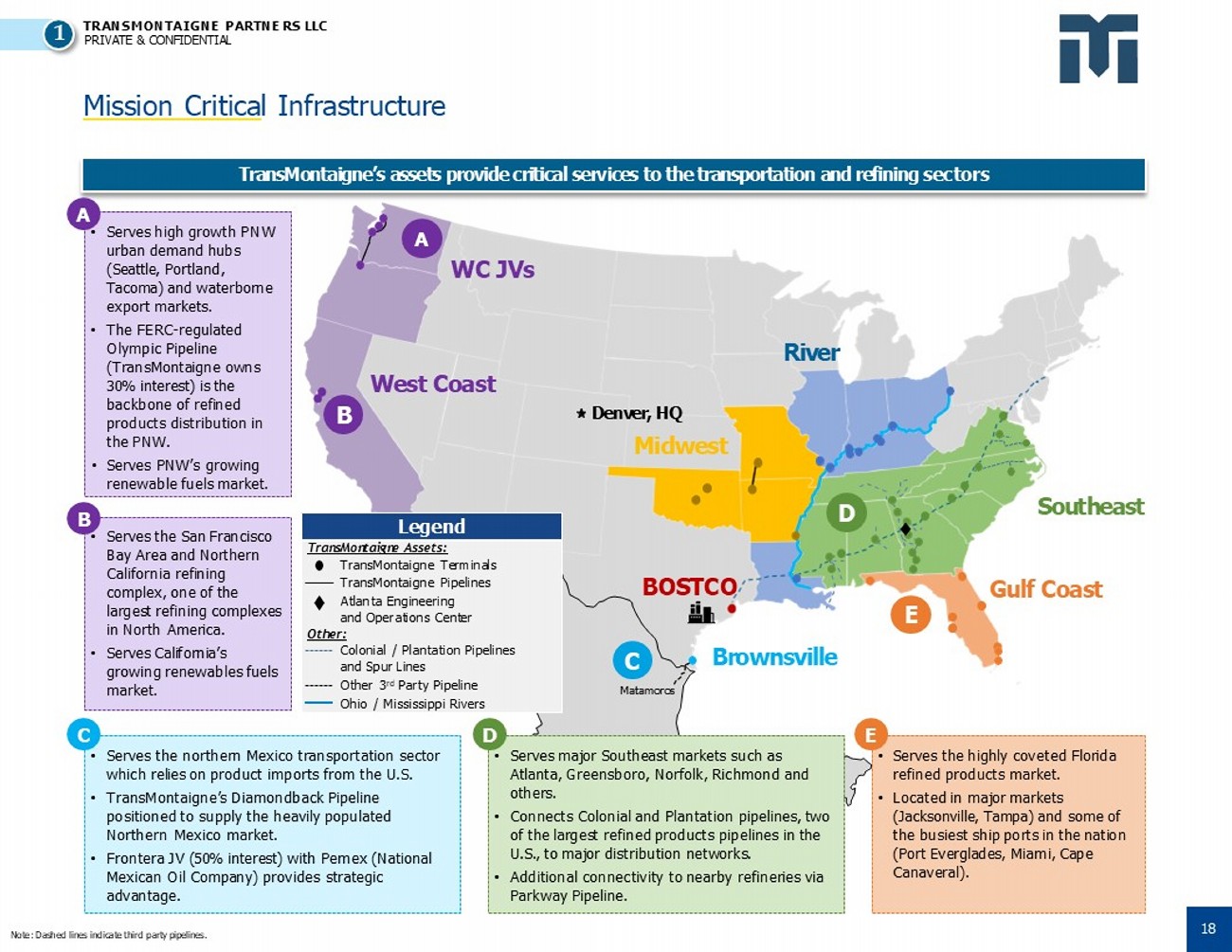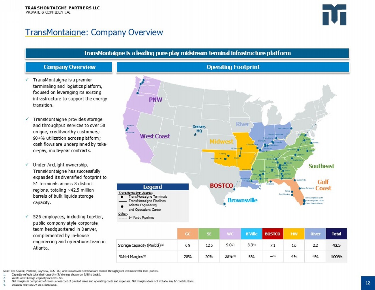 TRANSMONTAIGNE PARTNE RS LLC PRIVATE & CONFIDENTIAL TransMontaign e: Company Overview Note: The Seattle, Portland, Bayview, BOSTCO, and Brownsville terminals are owned through joint ventures with third parties. 1. 2. 3. 4. Capacity reflects total shell capacity (JV storage shown on 8/8ths basis). West Coast storage capacity includes JVs. Net margins is composed of revenue less cost of product sales and operating costs and expenses. Net margins does not include any JV contributions. Includes Frontera JV on 8/8ths basis. TransMontaigne is a leading pure - play midstream terminal infrastructure platform Company Overview Operating Footprint x TransMontaigne is a premier terminaling and logistics platform, focused on leveraging its existing infrastructure to support the energy transition. x TransMontaigne provides storage and throughput services to over 50 unique, creditworthy customers; 90+% utilization across platform; cash flows are underpinned by take - or - pay, multi - year contracts. x Under ArcLight ownership, TransMontaigne has successfully expanded its diversified footprint to 51 terminals across 8 distinct regions, totaling ~42.5 million barrels of bulk liquids storage capacity. x 526 employees, including top - tier, public company - style corporate team headquartered in Denver, complemented by in - house engineering and operations team in Atlanta. West Coast PNW River Southeast Gulf Brownsville BOSTCO Denver, HQ Oklahoma City Cushing Pensacola Tampa Port Manatee Jacksonville East Liverpool Greater Cincinnati New Albany Henderson Paducah Midwest Mt. Vernon Rogers Evansville Cape Giradeau Greenville Fairfax Richmond Norfolk Greensboro Selma Charlotte Spartanburg Bainbridge Purvis Martinez Richmond Bayview Seattle Sound (Tacoma) Portland Baton Rouge Dock Collins Louisville Owensboro Birmingham Meridian Athens Doraville Griffin Macon Americus Cape Canaveral Coast Port Everglades North Port Everglades South Fisher Island (Miami) Lookout Mtn. Rome Albany Total River MW BOSTCO B’Ville WC SE GC 42.5 2.2 1.6 7.1 3.3 (4) 9.0 (2) 12.5 6.9 Storage Capacity (Mmbbl) (1) 100% 4% 4% – (3) 6% 38% (3) 20% 28% % Net Margins (3) Legend TransMontaigne Assets : TransMontaigne Terminals TransMontaigne Pipelines Atlanta Engineering and Operations Center Other : 3 rd Party Pipelines 12
