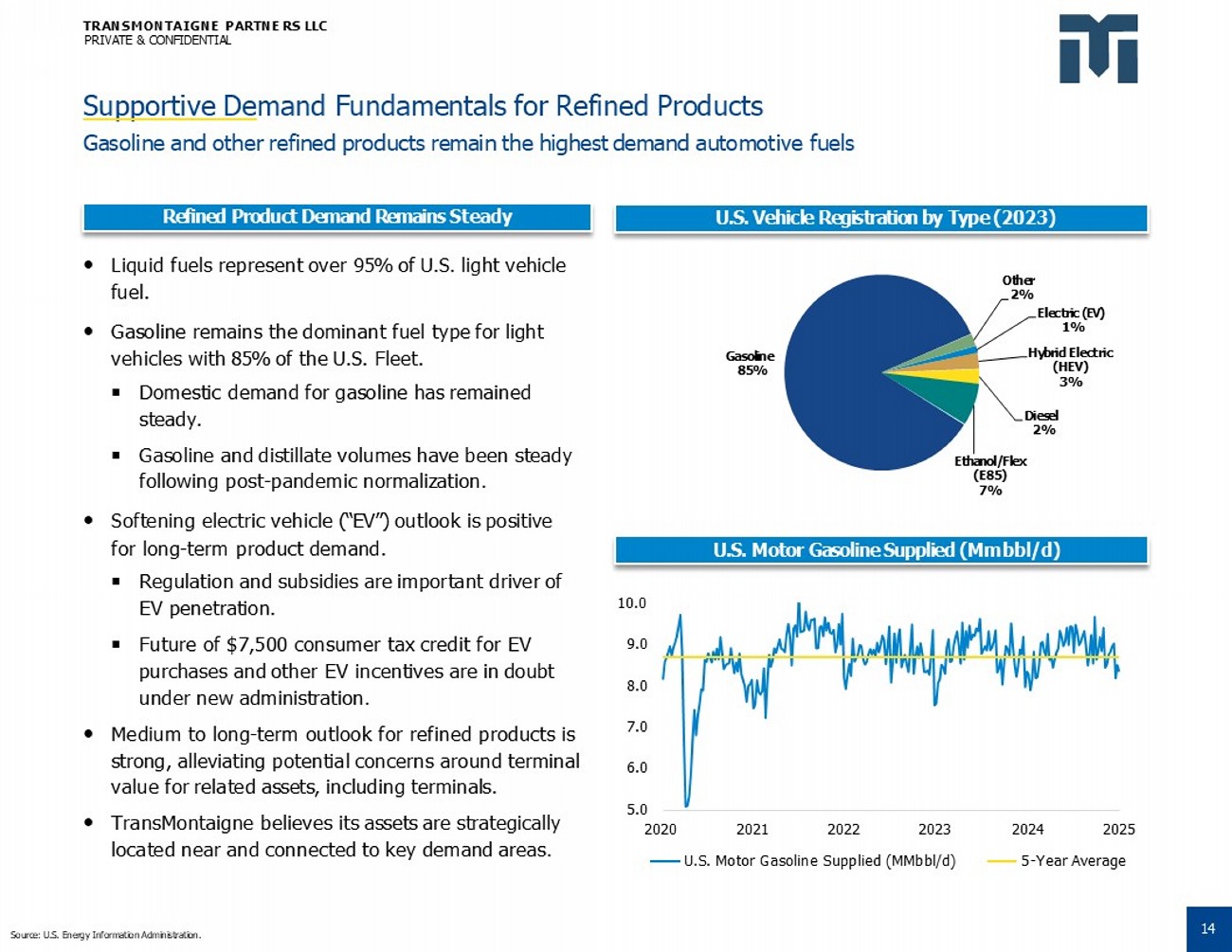 TRANSMONTAIGNE PARTNE RS LLC PRIVATE & CONFIDENTIAL Electric (EV) 1% Hybrid Electric (HEV) 3% Diesel 2% Ethanol/Flex (E85) 7% Gasoline 85% Other 2% U.S. Vehicle Registration by Type (2023) Supportive De mand Fundamentals for Refined Products Gasoline and other refined products remain the highest demand automotive fuels Source: U.S. Energy Information Administration. Liquid fuels represent over 95% of U.S. light vehicle fuel. Gasoline remains the dominant fuel type for light vehicles with 85% of the U.S. Fleet. Domestic demand for gasoline has remained steady. Gasoline and distillate volumes have been steady following post - pandemic normalization. Softening electric vehicle (“EV”) outlook is positive for long - term product demand. Regulation and subsidies are important driver of EV penetration. Future of $7,500 consumer tax credit for EV purchases and other EV incentives are in doubt under new administration. Medium to long - term outlook for refined products is strong, alleviating potential concerns around terminal value for related assets, including terminals. TransMontaigne believes its assets are strategically located near and connected to key demand areas. 14 U.S. Motor Gasoline Supplied (Mmbbl/d) 5.0 6.0 7.0 8.0 9.0 10.0 2020 2021 2022 2023 U.S. Motor Gasoline Supplied (MMbbl/d) 2024 2025 5 - Year Average Refined Product Demand Remains Steady
