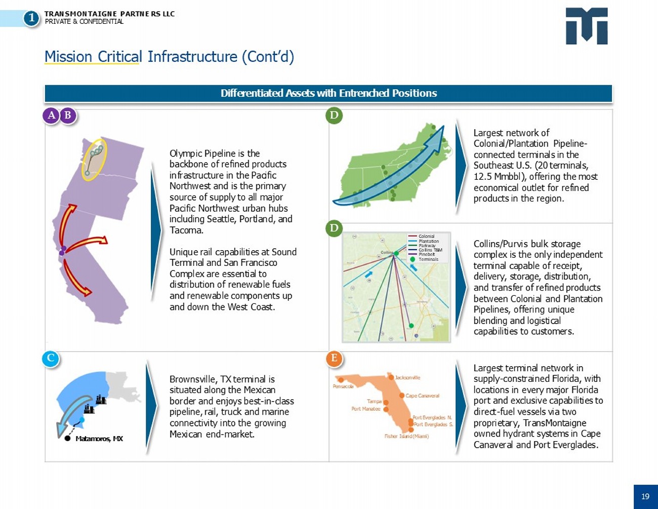 TRANSMONTAIGNE PARTNE RS LLC PRIVATE & CONFIDENTIAL Mission Critica l Infrastructure Note: Dashed lines indicate third party pipelines. TransMontaigne’s assets provide critical services to the transportation and refining sectors West Coast WC JVs Denver, HQ Midwest River Southeast Gulf Coast D E B A BOSTCO Brownsville C Matamoros • Serves the northern Mexico transportation sector which relies on product imports from the U.S. • TransMontaigne’s Diamondback Pipeline positioned to supply the heavily populated Northern Mexico market. • Frontera JV (50% interest) with Pemex (National Mexican Oil Company) provides strategic advantage. • Serves the San Francisco Bay Area and Northern California refining complex, one of the largest refining complexes in North America. • Serves California’s growing renewables fuels market. • Serves high growth PNW urban demand hubs (Seattle, Portland, Tacoma) and waterborne export markets. • The FERC - regulated Olympic Pipeline (TransMontaigne owns 30% interest) is the backbone of refined products distribution in the PNW. • Serves PNW’s growing renewable fuels market. Legend TransMontaigne Assets: TransMontaigne Terminals TransMontaigne Pipelines Atlanta Engineering and Operations Center Other: Colonial / Plantation Pipelines and Spur Lines Other 3 rd Party Pipeline Ohio / Mississippi Rivers • Serves the highly coveted Florida refined products market. • Located in major markets (Jacksonville, Tampa) and some of the busiest ship ports in the nation (Port Everglades, Miami, Cape Canaveral). E • Serves major Southeast markets such as Atlanta, Greensboro, Norfolk, Richmond and others. • Connects Colonial and Plantation pipelines, two of the largest refined products pipelines in the U.S., to major distribution networks. • Additional connectivity to nearby refineries via Parkway Pipeline. D C B A 1 18