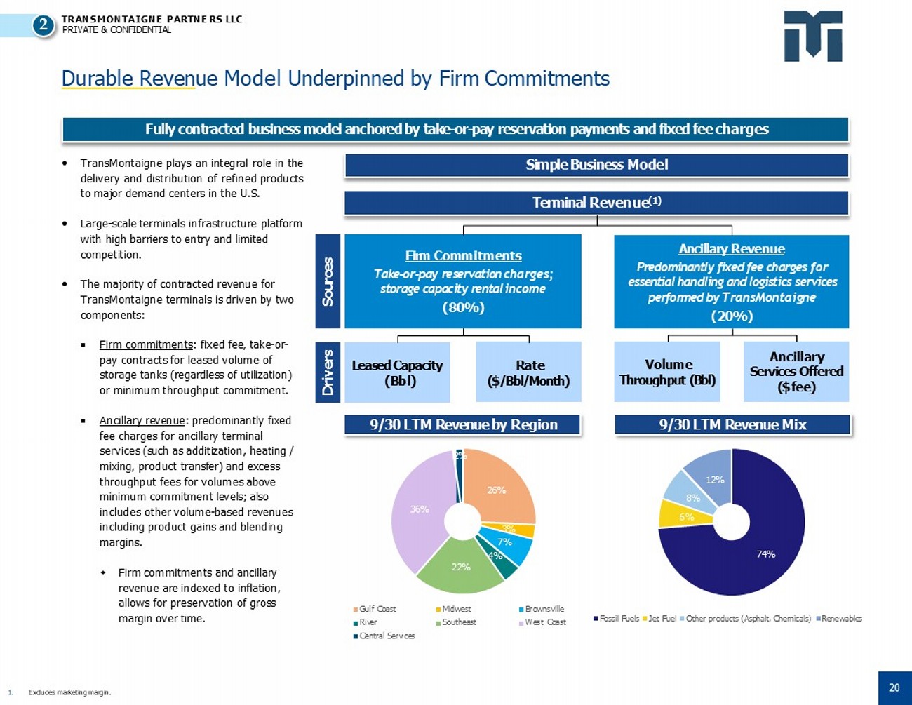 TRANSMONTAIGNE PARTNE RS LLC PRIVATE & CONFIDENTIAL Matamoros, MX Mission Critica l Infrastructure (Cont’d) Differentiated Assets with Entrenched Positions Brownsville, TX terminal is situated along the Mexican border and enjoys best - in - class pipeline, rail, truck and marine connectivity into the growing Mexican end - market. Olympic Pipeline is the backbone of refined products infrastructure in the Pacific Northwest and is the primary source of supply to all major Pacific Northwest urban hubs including Seattle, Portland, and Tacoma. Unique rail capabilities at Sound Terminal and San Francisco Complex are essential to distribution of renewable fuels and renewable components up and down the West Coast. C Largest terminal network in supply - constrained Florida, with locations in every major Florida port and exclusive capabilities to direct - fuel vessels via two proprietary, TransMontaigne owned hydrant systems in Cape Canaveral and Port Everglades. Largest network of Colonial/Plantation Pipeline - connected terminals in the Southeast U.S. (20 terminals, 12.5 Mmbbl), offering the most economical outlet for refined products in the region. A B D E D Colonial Plantation Parkway Collins T&M Pinebelt Terminals Cape Canaveral Fisher Island (Miami) Pensacola Tampa Port Manatee Jacksonville Port Everglades N. Port Everglades S. Collins/Purvis bulk storage complex is the only independent terminal capable of receipt, delivery, storage, distribution, and transfer of refined products between Colonial and Plantation Pipelines, offering unique blending and logistical capabilities to customers. 1 19
