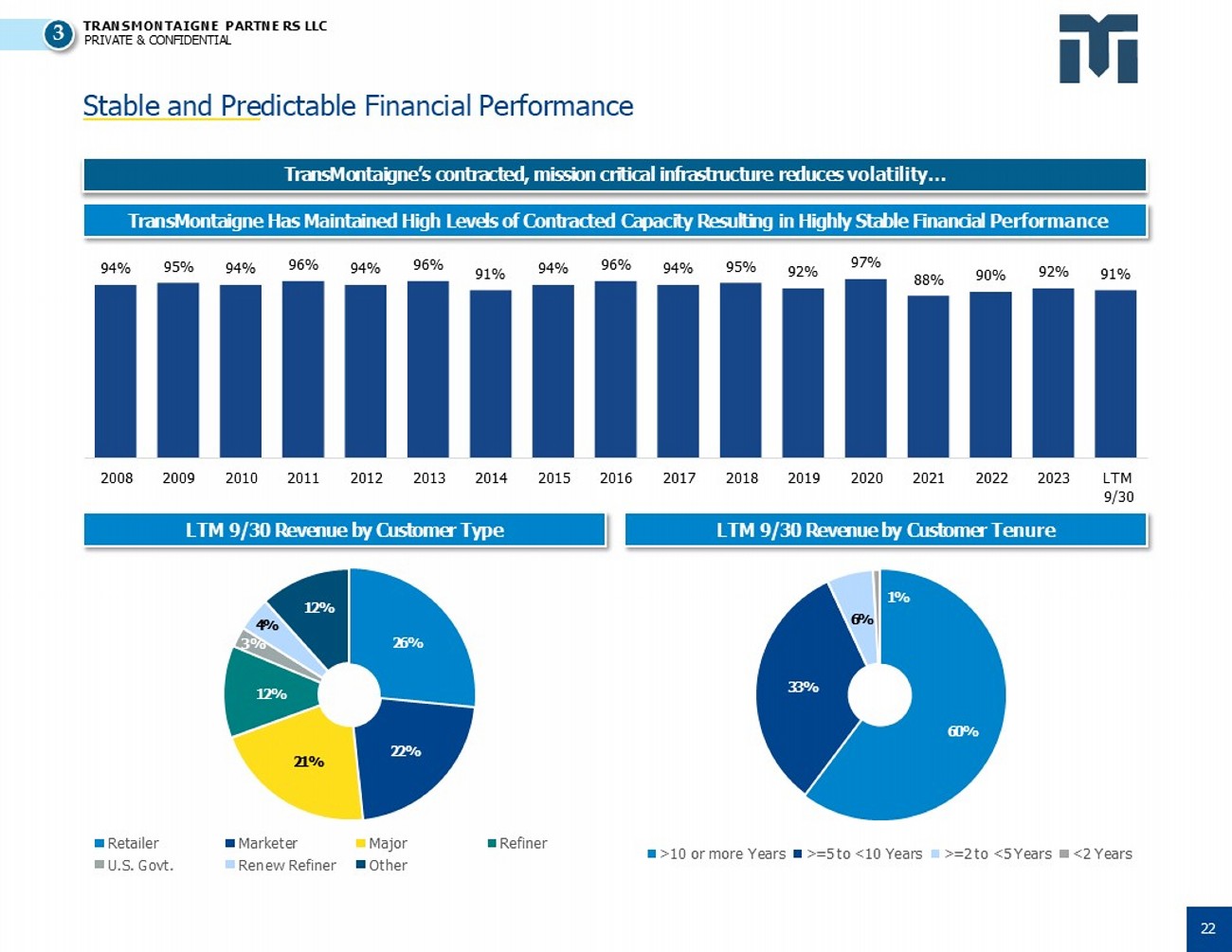 TRANSMONTAIGNE PARTNE RS LLC PRIVATE & CONFIDENTIAL Customer Overview TransMontaig ne Customer Profile Note: Market Cap per FactSet as of 1/21/2025. 1. Excludes unrated customers. x Over 50 unique customers, with no customer representing more than 15% of total capacity. x Blue chip counterparties, including major integrated energy companies, national oil companies, independent refiners, large fuel retailers, and global commodity trading firms and energy marketers; average customer tenure of 12 years. x The below customers, including a contract with the U.S. government, account for >80% of TransMontaigne’s terminaling revenue YTD 3Q 2024. x ~86% of top - 10 rated customers are investment grade. (1) Years as Customer Customer Type Credit Ratings (Moody’s / S&P) Market Cap ($bn) Customer 24 Major A1 / A - $85 17 Major Aa2 / AA - $284 5 Product Supplier / Marketer N/A Private 18 Large Cap Integrated Refiner / Retailer Baa2 / BBB $48 17 Retailer Ba3 / BB - Private 11 Retailer N/A Private 19 Major Aa2 / A+ $202 17 Major Aa3 / A+ $141 20 Large Cap Integrated Refiner / Retailer Baa2 / BBB $44 7 Product Suppler / Marketer N/A Private 10 Large Cap Midstream Baa2 / BBB $64 12 Large Cap Integrated Refiner / Retailer A3 / BBB+ $50 21 National Oil Company B3 / BBB+ Private 10 Product Supplier / Marketer N/A $2 2 Larger Cap Integrated Refiner / Retailer Baa3 / BBB - $7 2 21
