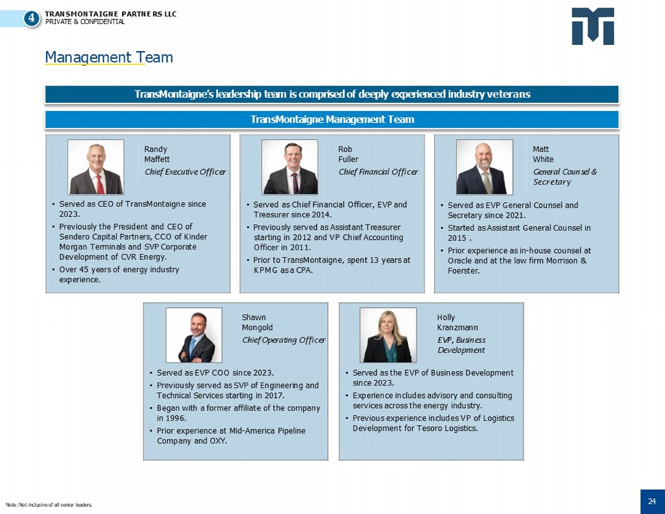 TRANSMONTAIGNE PARTNE RS LLC PRIVATE & CONFIDENTIAL Management T eam Note: Not inclusive of all senior leaders. TransMontaigne’s leadership team is comprised of deeply experienced industry veterans Randy Maffett Chief Executive Officer • Served as CEO of TransMontaigne since 2023. • Previously the President and CEO of Sendero Capital Partners, CCO of Kinder Morgan Terminals and SVP Corporate Development of CVR Energy. • Over 45 years of energy industry experience. Rob Fuller Chief Financial Officer • Served as Chief Financial Officer, EVP and Treasurer since 2014. • Previously served as Assistant Treasurer starting in 2012 and VP Chief Accounting Officer in 2011. • Prior to TransMontaigne, spent 13 years at KPMG as a CPA. Matt White General Counsel & Secretary • Served as EVP General Counsel and Secretary since 2021. • Started as Assistant General Counsel in 2015 . • Prior experience as in - house counsel at Oracle and at the law firm Morrison & Foerster. Shawn Mongold Chief Operating Officer • Served as EVP COO since 2023. • Previously served as SVP of Engineering and Technical Services starting in 2017. • Began with a former affiliate of the company in 1996. • Prior experience at Mid - America Pipeline Company and OXY. Holly Kranzmann EVP, Business Development • Served as the EVP of Business Development since 2023. • Experience includes advisory and consulting services across the energy industry. • Previous experience includes VP of Logistics Development for Tesoro Logistics. TransMontaigne Management Team 4 24