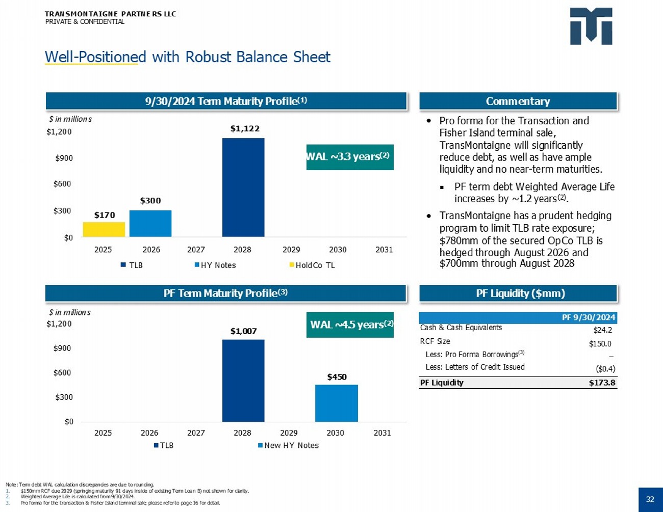TRANSMONTAIGNE PARTNE RS LLC PRIVATE & CONFIDENTIAL Financial policy to maintain reasonable credit metrics with debt paydown & growth Capital Allocat ion Strategy Source: Company financials. 1. Pro forma for New Unsecured Bond offering and Fisher Island sale. Targeted Cash Flow Allocation Debt Paydown Growth Reinvestment Distributions Demonstrated Commitment to Deleveraging Maintain Modest Leverage Profile for Terminals Midstream Business • TransMontaigne plans to continue to pay down its existing Term Loan B via amortization & ECF sweeps. Long - term EBITDA - accretive projects • Proven record of large - scale projects executed on budget & time. Distributions are not expected to be a primary use of cash • Capital allocation at TransMontaigne will focus on growing the business while maintaining a strong financial profile and credit metrics. TransMontaigne has steadily deleveraged, particularly repaying its most expensive debt using: Free cash flow Sponsor cash contribution Net asset sale proceeds Additionally, TransMontaigne has focused on growth projects, resulting in Adj. EBITDA growth of: 2022 – 2023: $6.6mm 2023 – LTM 9/30/24: $11.5mm 5.0x 5.2x 5.1x 4.7x 1.5x 1.5x 1.4x 2.1x 1.8x 1.3x 0.8x 8.3x 8.0x 7.2x 6.8x 4.0x 5.0x 6.0x 7.0x 8.0x 9.0x 2023 LTM 9/30/2024 TransMontaigne Partners (Net) PF LTM 9/30/2024 Consolidated (Net) 2022 Secured (Net) (1) 31