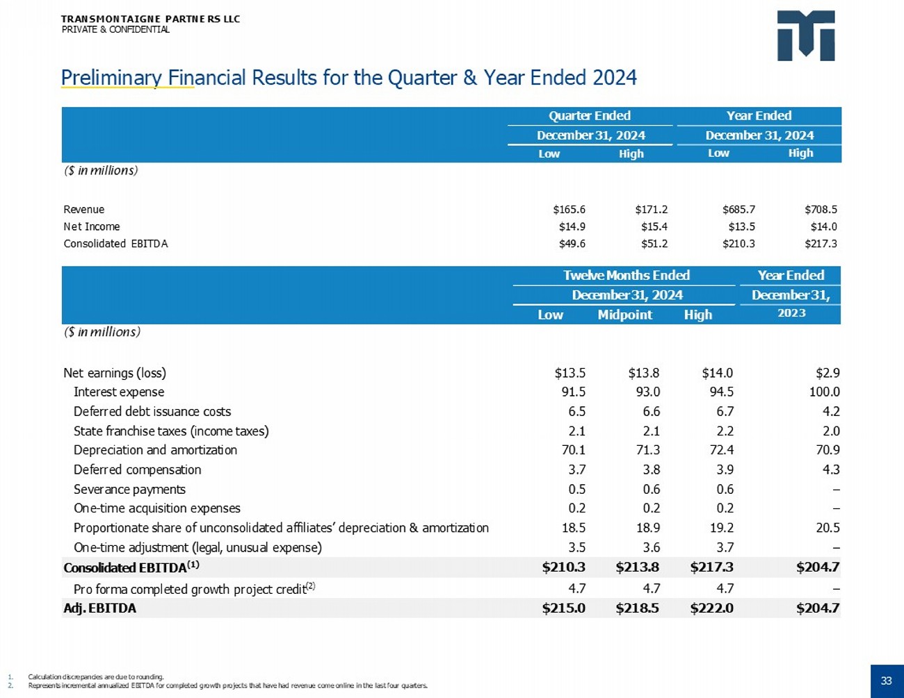 TRANSMONTAIGNE PARTNE RS LLC PRIVATE & CONFIDENTIAL Preliminary Fin ancial Results for the Quarter & Year Ended 2024 33 Year Ended Twelve Months Ended December 31, December 31, 2024 Low Midpoint High 2023 ($ in millions) $2.9 $14.0 $13.8 $13.5 Net earnings (loss) 100.0 94.5 93.0 91.5 Interest expense 4.2 6.7 6.6 6.5 Deferred debt issuance costs 2.0 2.2 2.1 2.1 State franchise taxes (income taxes) 70.9 72.4 71.3 70.1 Depreciation and amortization 4.3 3.9 3.8 3.7 Deferred compensation – 0.6 0.6 0.5 Severance payments – 0.2 0.2 0.2 One - time acquisition expenses 20.5 19.2 18.9 18.5 Proportionate share of unconsolidated affiliates’ depreciation & amortization – 3.7 3.6 3.5 One - time adjustment (legal, unusual expense) $204.7 $217.3 $213.8 $210.3 Consolidated EBITDA (1) – 4.7 4.7 4.7 Pro forma completed growth project credit (2) $204.7 $222.0 $218.5 $215.0 Adj. EBITDA 1. 2. Calculation discrepancies are due to rounding. Represents incremental annualized EBITDA for completed growth projects that have had revenue come online in the last four quarters. Year Ended Quarter Ended December 31, 2024 December 31, 2024 Low High Low High ($ in millions) $708.5 $685.7 $171.2 $165.6 Revenue $14.0 $13.5 $15.4 $14.9 Net Income $217.3 $210.3 $51.2 $49.6 Consolidated EBITDA