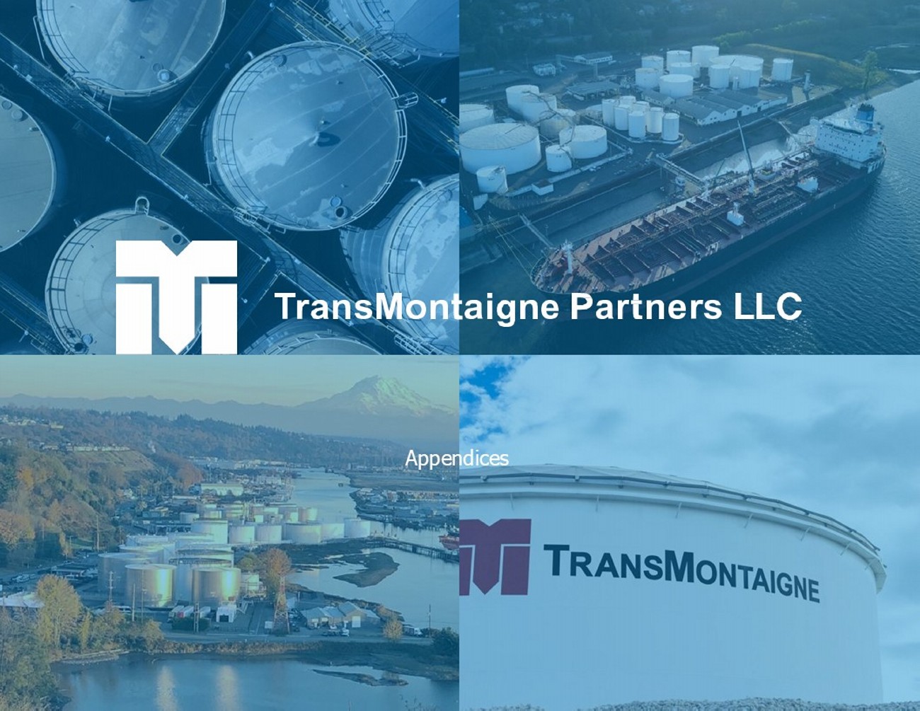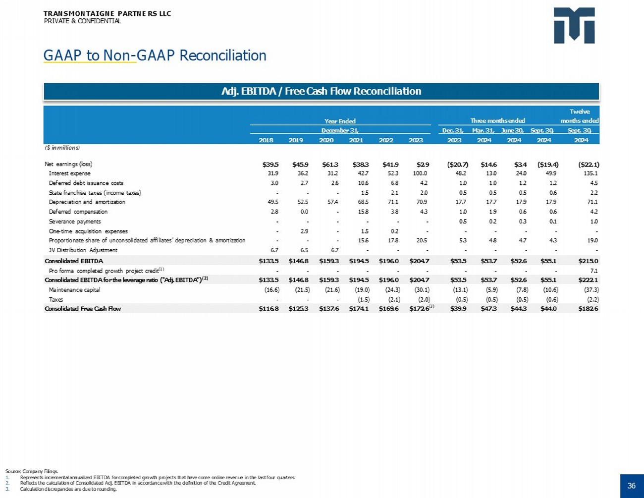 TRANSMONTAIGNE PARTNE RS LLC PRIVATE & CONFIDENTIAL GAAP to Non - GAAP Reconciliation Source: Company Filings. 1. Represents incremental annualized EBITDA for completed growth projects that have come online revenue in the last four quarters. 2. Reflects the calculation of Consolidated Adj. EBITDA in accordance with the definition of the Credit Agreement. 3. Calculation discrepancies are due to rounding. Adj. EBITDA / Free Cash Flow Reconciliation Twelve Three months ended months ended Year Ended Dec. 31, Mar. 31, June 30, Sept. 30, Sept. 30, December 31, 2023 2024 2024 2024 2024 2018 2019 2020 2021 2022 2023 ($22.1) ($19.4) $3.4 $14.6 ($20.7) $2.9 $41.9 $38.3 $61.3 $45.9 $39.5 ($ in millions) Net earnings (loss) 135.1 49.9 24.0 13.0 48.2 100.0 52.3 42.7 31.2 36.2 31.9 Interest expense 4.5 1.2 1.2 1.0 1.0 4.2 6.8 10.6 2.6 2.7 3.0 Deferred debt issuance costs 2.2 0.6 0.5 0.5 0.5 2.0 2.1 1.5 - - - State franchise taxes (income taxes) 71.1 17.9 17.9 17.7 17.7 70.9 71.1 68.5 57.4 52.5 49.5 Depreciation and amortization 4.2 0.6 0.6 1.9 1.0 4.3 3.8 15.8 - 0.0 2.8 Deferred compensation 1.0 0.1 0.3 0.2 0.5 - - - - - - Severance payments - - - - - - 0.2 1.5 - 2.9 - One - time acquisition expenses 19.0 4.3 4.7 4.8 5.3 20.5 17.8 15.6 - - - Proportionate share of unconsolidated affiliates' depreciation & amortization - - - - - - - - 6.7 6.5 6.7 JV Distribution Adjustment $215.0 $55.1 $52.6 $53.7 $53.5 $204.7 $196.0 $194.5 $159.3 $146.8 $133.5 Consolidated EBITDA 7.1 - - - - - - - - - - Pro forma completed growth project credit (1) $222.1 $55.1 $52.6 $53.7 $53.5 $204.7 $196.0 $194.5 $159.3 $146.8 $133.5 Consolidated EBITDA for the leverage ratio ("Adj. EBITDA") (2) (37.3) (10.6) (7.8) (5.9) (13.1) (30.1) (24.3) (19.0) (21.6) (21.5) (16.6) Maintenance capital (2.2) (0.6) (0.5) (0.5) (0.5) (2.0) (2.1) (1.5) - - - Taxes $182.6 $44.0 $44.3 $47.3 $39.9 $172.6 (3) $169.6 $174.1 $137.6 $125.3 $116.8 Consolidated Free Cash Flow 36