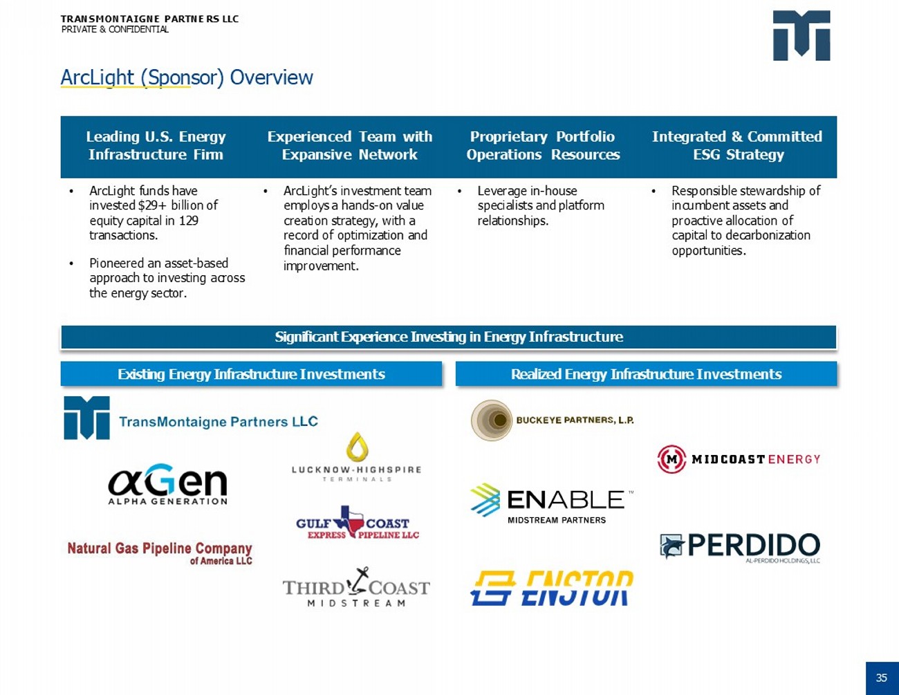 TRANSMONTAIGNE PARTNE RS LLC PRIVATE & CONFIDENTIAL ArcLight (Spon sor) Overview Integrated & Committed ESG Strategy Proprietary Portfolio Operations Resources Experienced Team with Expansive Network Leading U. S. Energy Infrastructure Firm • Responsible stewardship of incumbent assets and proactive allocation of capital to decarbonization opportunities. • Leverage in - house specialists and platform relationships. • ArcLight’s investment team employs a hands - on value creation strategy, with a record of optimization and financial performance improvement. • ArcLight funds have invested $29+ billion of equity capital in 129 transactions. • Pioneered an asset - based approach to investing across the energy sector. Significant Experience Investing in Energy Infrastructure Existing Energy Infrastructure Investments Realized Energy Infrastructure Investments 35