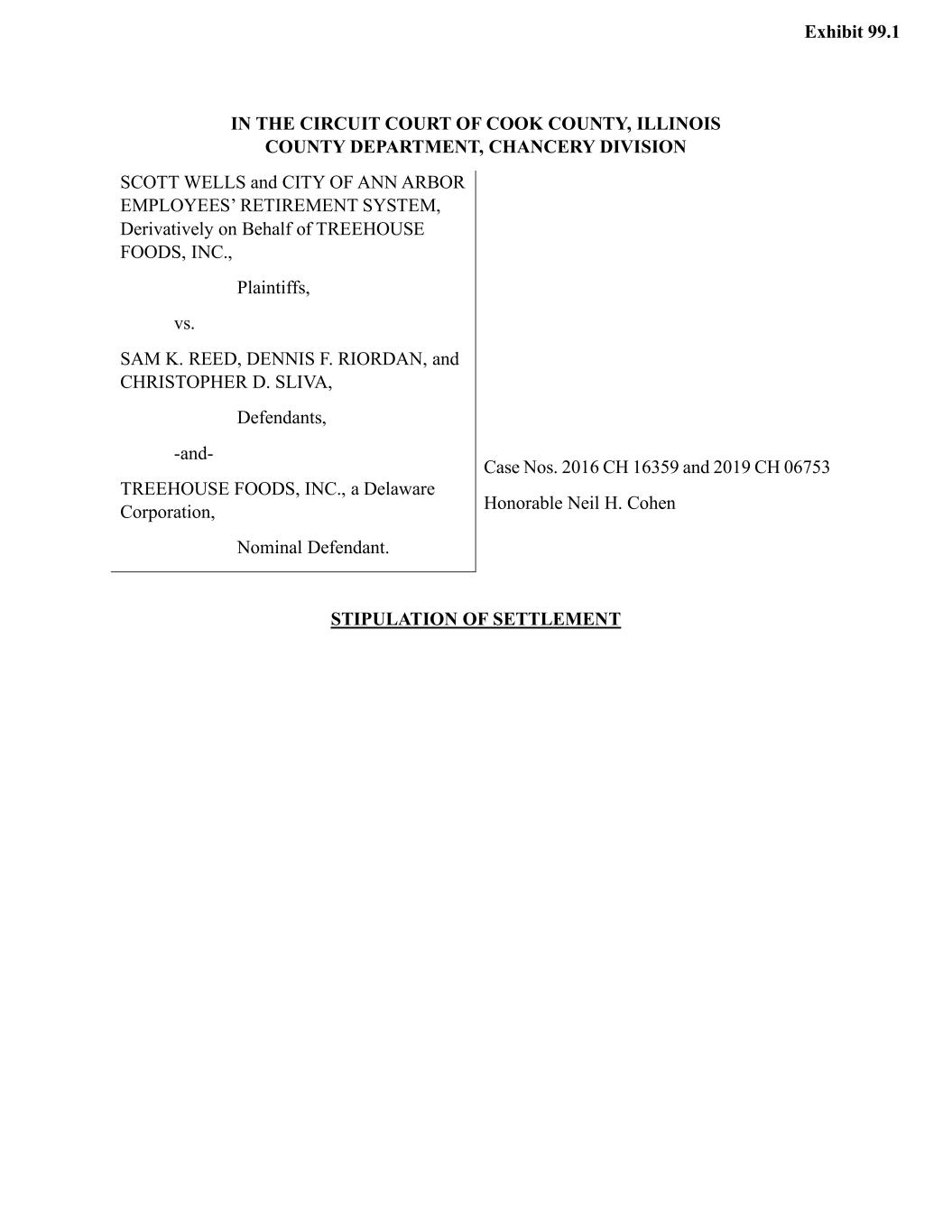 IN THE CIRCUIT COURT OF COOK COUNTY, ILLINOIS COUNTY DEPARTMENT, CHANCERY DIVISION SCOTT WELLS and CITY OF ANN ARBOR EMPLOYEES’ RETIREMENT SYSTEM, Derivatively on Behalf of TREEHOUSE FOODS, INC., Plaintiffs, vs. SAM K. REED, DENNIS F. RIORDAN, and CHRISTOPHER D. SLIVA, Defendants, -and- TREEHOUSE FOODS, INC., a Delaware Corporation, Nominal Defendant. Case Nos. 2016 CH 16359 and 2019 CH 06753 Honorable Neil H. Cohen STIPULATION OF SETTLEMENT Exhibit 99.1
