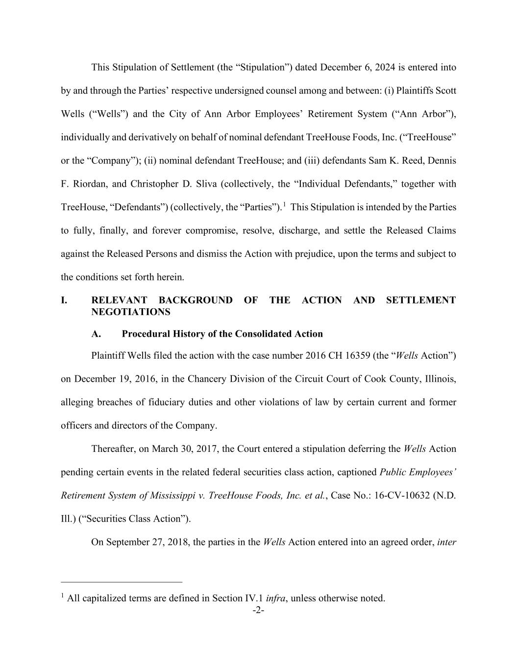 -2- This Stipulation of Settlement (the “Stipulation”) dated December 6, 2024 is entered into by and through the Parties’ respective undersigned counsel among and between: (i) Plaintiffs Scott Wells (“Wells”) and the City of Ann Arbor Employees’ Retirement System (“Ann Arbor”), individually and derivatively on behalf of nominal defendant TreeHouse Foods, Inc. (“TreeHouse” or the “Company”); (ii) nominal defendant TreeHouse; and (iii) defendants Sam K. Reed, Dennis F. Riordan, and Christopher D. Sliva (collectively, the “Individual Defendants,” together with TreeHouse, “Defendants”) (collectively, the “Parties”).1 This Stipulation is intended by the Parties to fully, finally, and forever compromise, resolve, discharge, and settle the Released Claims against the Released Persons and dismiss the Action with prejudice, upon the terms and subject to the conditions set forth herein. I. RELEVANT BACKGROUND OF THE ACTION AND SETTLEMENT NEGOTIATIONS A. Procedural History of the Consolidated Action Plaintiff Wells filed the action with the case number 2016 CH 16359 (the “Wells Action”) on December 19, 2016, in the Chancery Division of the Circuit Court of Cook County, Illinois, alleging breaches of fiduciary duties and other violations of law by certain current and former officers and directors of the Company. Thereafter, on March 30, 2017, the Court entered a stipulation deferring the Wells Action pending certain events in the related federal securities class action, captioned Public Employees’ Retirement System of Mississippi v. TreeHouse Foods, Inc. et al., Case No.: 16-CV-10632 (N.D. Ill.) (“Securities Class Action”). On September 27, 2018, the parties in the Wells Action entered into an agreed order, inter 1 All capitalized terms are defined in Section IV.1 infra, unless otherwise noted.