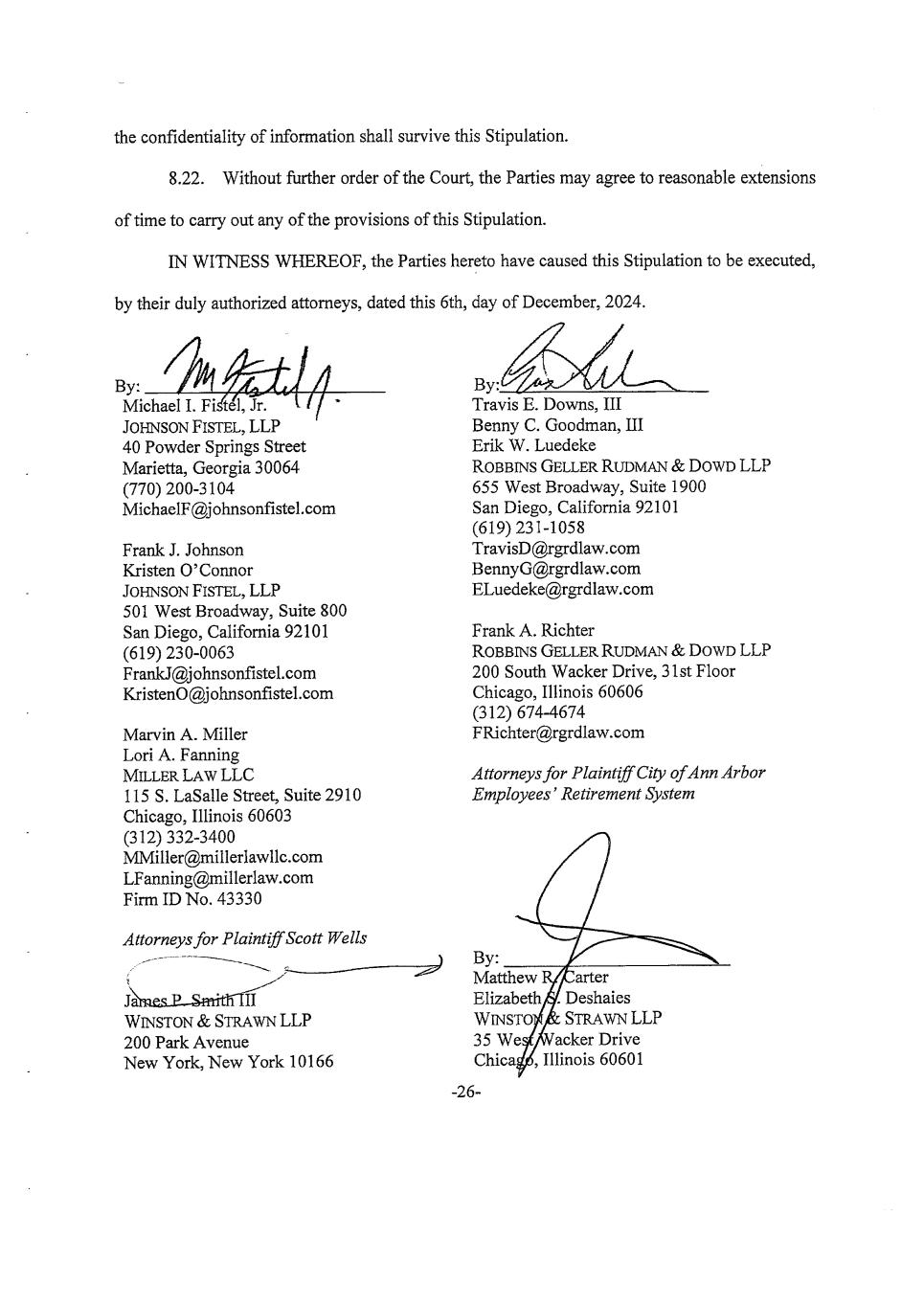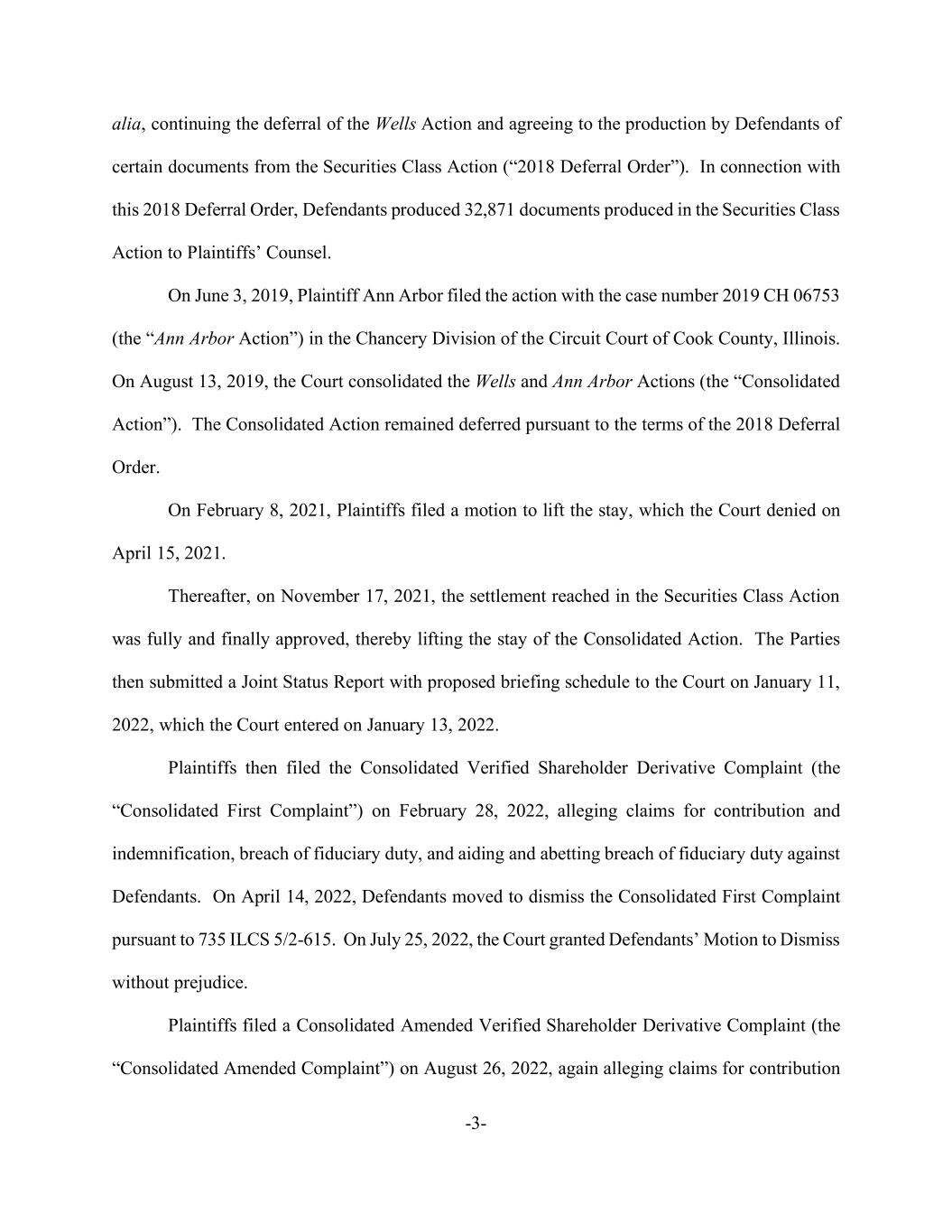 -3- alia, continuing the deferral of the Wells Action and agreeing to the production by Defendants of certain documents from the Securities Class Action (“2018 Deferral Order”). In connection with this 2018 Deferral Order, Defendants produced 32,871 documents produced in the Securities Class Action to Plaintiffs’ Counsel. On June 3, 2019, Plaintiff Ann Arbor filed the action with the case number 2019 CH 06753 (the “Ann Arbor Action”) in the Chancery Division of the Circuit Court of Cook County, Illinois. On August 13, 2019, the Court consolidated the Wells and Ann Arbor Actions (the “Consolidated Action”). The Consolidated Action remained deferred pursuant to the terms of the 2018 Deferral Order. On February 8, 2021, Plaintiffs filed a motion to lift the stay, which the Court denied on April 15, 2021. Thereafter, on November 17, 2021, the settlement reached in the Securities Class Action was fully and finally approved, thereby lifting the stay of the Consolidated Action. The Parties then submitted a Joint Status Report with proposed briefing schedule to the Court on January 11, 2022, which the Court entered on January 13, 2022. Plaintiffs then filed the Consolidated Verified Shareholder Derivative Complaint (the “Consolidated First Complaint”) on February 28, 2022, alleging claims for contribution and indemnification, breach of fiduciary duty, and aiding and abetting breach of fiduciary duty against Defendants. On April 14, 2022, Defendants moved to dismiss the Consolidated First Complaint pursuant to 735 ILCS 5/2-615. On July 25, 2022, the Court granted Defendants’ Motion to Dismiss without prejudice. Plaintiffs filed a Consolidated Amended Verified Shareholder Derivative Complaint (the “Consolidated Amended Complaint”) on August 26, 2022, again alleging claims for contribution