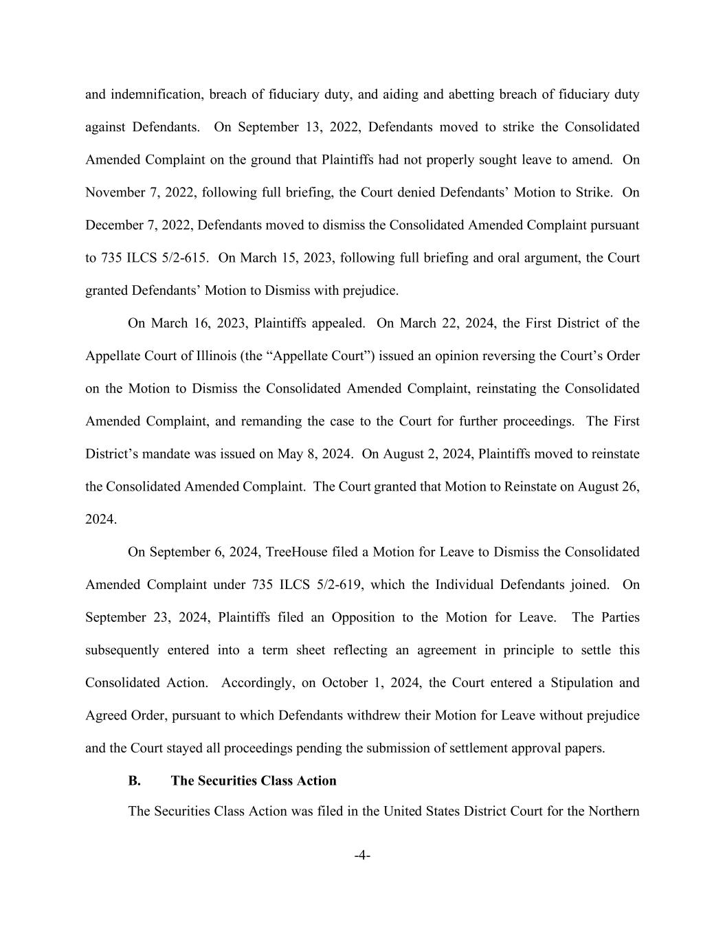 -4- and indemnification, breach of fiduciary duty, and aiding and abetting breach of fiduciary duty against Defendants. On September 13, 2022, Defendants moved to strike the Consolidated Amended Complaint on the ground that Plaintiffs had not properly sought leave to amend. On November 7, 2022, following full briefing, the Court denied Defendants’ Motion to Strike. On December 7, 2022, Defendants moved to dismiss the Consolidated Amended Complaint pursuant to 735 ILCS 5/2-615. On March 15, 2023, following full briefing and oral argument, the Court granted Defendants’ Motion to Dismiss with prejudice. On March 16, 2023, Plaintiffs appealed. On March 22, 2024, the First District of the Appellate Court of Illinois (the “Appellate Court”) issued an opinion reversing the Court’s Order on the Motion to Dismiss the Consolidated Amended Complaint, reinstating the Consolidated Amended Complaint, and remanding the case to the Court for further proceedings. The First District’s mandate was issued on May 8, 2024. On August 2, 2024, Plaintiffs moved to reinstate the Consolidated Amended Complaint. The Court granted that Motion to Reinstate on August 26, 2024. On September 6, 2024, TreeHouse filed a Motion for Leave to Dismiss the Consolidated Amended Complaint under 735 ILCS 5/2-619, which the Individual Defendants joined. On September 23, 2024, Plaintiffs filed an Opposition to the Motion for Leave. The Parties subsequently entered into a term sheet reflecting an agreement in principle to settle this Consolidated Action. Accordingly, on October 1, 2024, the Court entered a Stipulation and Agreed Order, pursuant to which Defendants withdrew their Motion for Leave without prejudice and the Court stayed all proceedings pending the submission of settlement approval papers. B. The Securities Class Action The Securities Class Action was filed in the United States District Court for the Northern