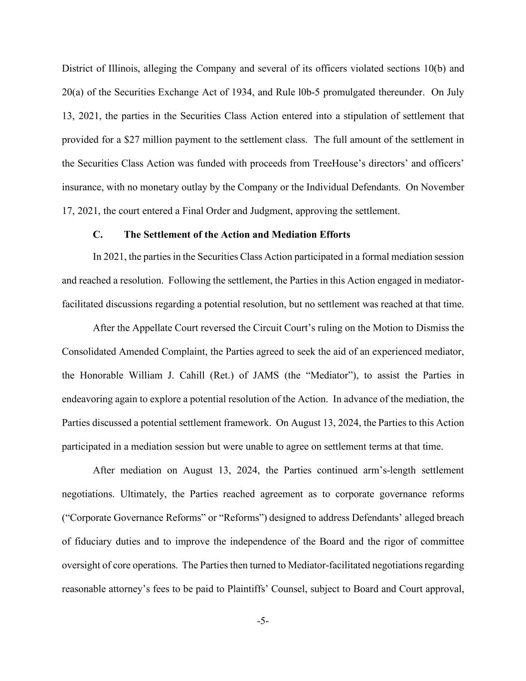 -5- District of Illinois, alleging the Company and several of its officers violated sections 10(b) and 20(a) of the Securities Exchange Act of 1934, and Rule l0b-5 promulgated thereunder. On July 13, 2021, the parties in the Securities Class Action entered into a stipulation of settlement that provided for a $27 million payment to the settlement class. The full amount of the settlement in the Securities Class Action was funded with proceeds from TreeHouse’s directors’ and officers’ insurance, with no monetary outlay by the Company or the Individual Defendants. On November 17, 2021, the court entered a Final Order and Judgment, approving the settlement. C. The Settlement of the Action and Mediation Efforts In 2021, the parties in the Securities Class Action participated in a formal mediation session and reached a resolution. Following the settlement, the Parties in this Action engaged in mediator- facilitated discussions regarding a potential resolution, but no settlement was reached at that time. After the Appellate Court reversed the Circuit Court’s ruling on the Motion to Dismiss the Consolidated Amended Complaint, the Parties agreed to seek the aid of an experienced mediator, the Honorable William J. Cahill (Ret.) of JAMS (the “Mediator”), to assist the Parties in endeavoring again to explore a potential resolution of the Action. In advance of the mediation, the Parties discussed a potential settlement framework. On August 13, 2024, the Parties to this Action participated in a mediation session but were unable to agree on settlement terms at that time. After mediation on August 13, 2024, the Parties continued arm’s-length settlement negotiations. Ultimately, the Parties reached agreement as to corporate governance reforms (“Corporate Governance Reforms” or “Reforms”) designed to address Defendants’ alleged breach of fiduciary duties and to improve the independence of the Board and the rigor of committee oversight of core operations. The Parties then turned to Mediator-facilitated negotiations regarding reasonable attorney’s fees to be paid to Plaintiffs’ Counsel, subject to Board and Court approval,