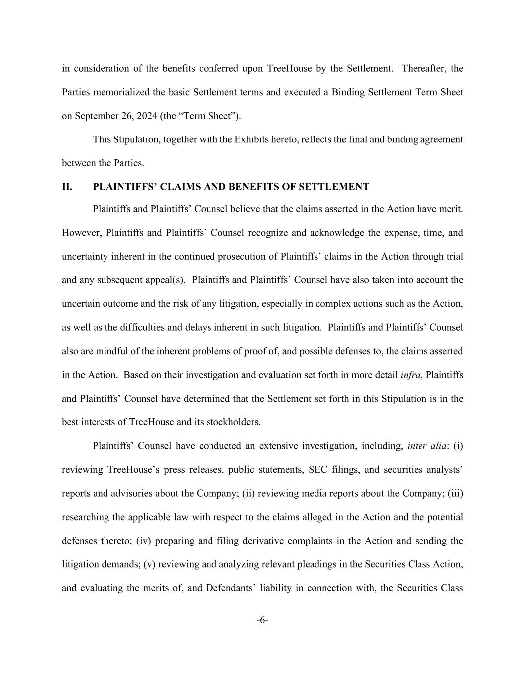 -6- in consideration of the benefits conferred upon TreeHouse by the Settlement. Thereafter, the Parties memorialized the basic Settlement terms and executed a Binding Settlement Term Sheet on September 26, 2024 (the “Term Sheet”). This Stipulation, together with the Exhibits hereto, reflects the final and binding agreement between the Parties. II. PLAINTIFFS’ CLAIMS AND BENEFITS OF SETTLEMENT Plaintiffs and Plaintiffs’ Counsel believe that the claims asserted in the Action have merit. However, Plaintiffs and Plaintiffs’ Counsel recognize and acknowledge the expense, time, and uncertainty inherent in the continued prosecution of Plaintiffs’ claims in the Action through trial and any subsequent appeal(s). Plaintiffs and Plaintiffs’ Counsel have also taken into account the uncertain outcome and the risk of any litigation, especially in complex actions such as the Action, as well as the difficulties and delays inherent in such litigation. Plaintiffs and Plaintiffs’ Counsel also are mindful of the inherent problems of proof of, and possible defenses to, the claims asserted in the Action. Based on their investigation and evaluation set forth in more detail infra, Plaintiffs and Plaintiffs’ Counsel have determined that the Settlement set forth in this Stipulation is in the best interests of TreeHouse and its stockholders. Plaintiffs’ Counsel have conducted an extensive investigation, including, inter alia: (i) reviewing TreeHouse’s press releases, public statements, SEC filings, and securities analysts’ reports and advisories about the Company; (ii) reviewing media reports about the Company; (iii) researching the applicable law with respect to the claims alleged in the Action and the potential defenses thereto; (iv) preparing and filing derivative complaints in the Action and sending the litigation demands; (v) reviewing and analyzing relevant pleadings in the Securities Class Action, and evaluating the merits of, and Defendants’ liability in connection with, the Securities Class