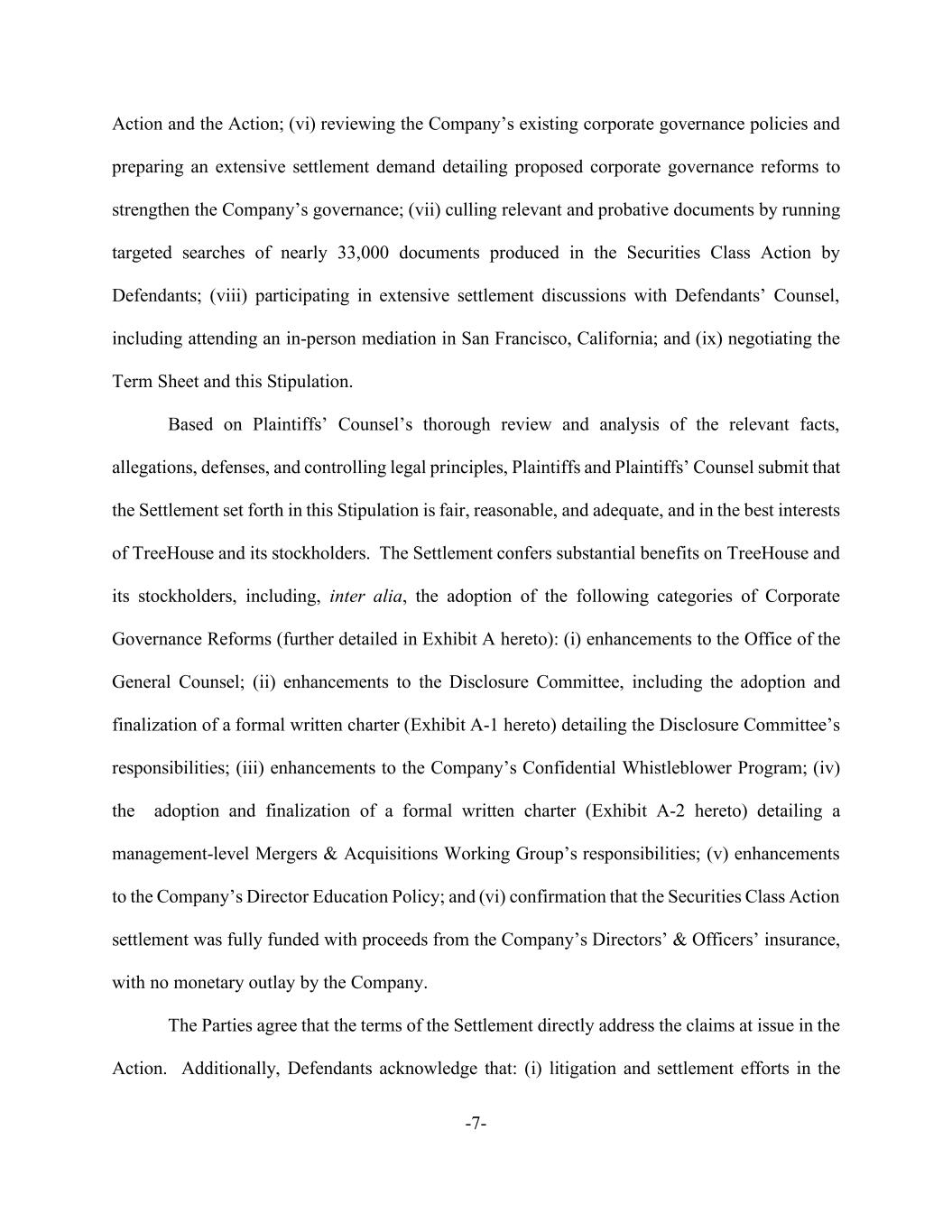 -7- Action and the Action; (vi) reviewing the Company’s existing corporate governance policies and preparing an extensive settlement demand detailing proposed corporate governance reforms to strengthen the Company’s governance; (vii) culling relevant and probative documents by running targeted searches of nearly 33,000 documents produced in the Securities Class Action by Defendants; (viii) participating in extensive settlement discussions with Defendants’ Counsel, including attending an in-person mediation in San Francisco, California; and (ix) negotiating the Term Sheet and this Stipulation. Based on Plaintiffs’ Counsel’s thorough review and analysis of the relevant facts, allegations, defenses, and controlling legal principles, Plaintiffs and Plaintiffs’ Counsel submit that the Settlement set forth in this Stipulation is fair, reasonable, and adequate, and in the best interests of TreeHouse and its stockholders. The Settlement confers substantial benefits on TreeHouse and its stockholders, including, inter alia, the adoption of the following categories of Corporate Governance Reforms (further detailed in Exhibit A hereto): (i) enhancements to the Office of the General Counsel; (ii) enhancements to the Disclosure Committee, including the adoption and finalization of a formal written charter (Exhibit A-1 hereto) detailing the Disclosure Committee’s responsibilities; (iii) enhancements to the Company’s Confidential Whistleblower Program; (iv) the adoption and finalization of a formal written charter (Exhibit A-2 hereto) detailing a management-level Mergers & Acquisitions Working Group’s responsibilities; (v) enhancements to the Company’s Director Education Policy; and (vi) confirmation that the Securities Class Action settlement was fully funded with proceeds from the Company’s Directors’ & Officers’ insurance, with no monetary outlay by the Company. The Parties agree that the terms of the Settlement directly address the claims at issue in the Action. Additionally, Defendants acknowledge that: (i) litigation and settlement efforts in the