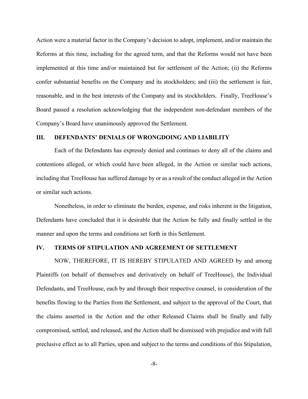 -8- Action were a material factor in the Company’s decision to adopt, implement, and/or maintain the Reforms at this time, including for the agreed term, and that the Reforms would not have been implemented at this time and/or maintained but for settlement of the Action; (ii) the Reforms confer substantial benefits on the Company and its stockholders; and (iii) the settlement is fair, reasonable, and in the best interests of the Company and its stockholders. Finally, TreeHouse’s Board passed a resolution acknowledging that the independent non-defendant members of the Company’s Board have unanimously approved the Settlement. III. DEFENDANTS’ DENIALS OF WRONGDOING AND LIABILITY Each of the Defendants has expressly denied and continues to deny all of the claims and contentions alleged, or which could have been alleged, in the Action or similar such actions, including that TreeHouse has suffered damage by or as a result of the conduct alleged in the Action or similar such actions. Nonetheless, in order to eliminate the burden, expense, and risks inherent in the litigation, Defendants have concluded that it is desirable that the Action be fully and finally settled in the manner and upon the terms and conditions set forth in this Settlement. IV. TERMS OF STIPULATION AND AGREEMENT OF SETTLEMENT NOW, THEREFORE, IT IS HEREBY STIPULATED AND AGREED by and among Plaintiffs (on behalf of themselves and derivatively on behalf of TreeHouse), the Individual Defendants, and TreeHouse, each by and through their respective counsel, in consideration of the benefits flowing to the Parties from the Settlement, and subject to the approval of the Court, that the claims asserted in the Action and the other Released Claims shall be finally and fully compromised, settled, and released, and the Action shall be dismissed with prejudice and with full preclusive effect as to all Parties, upon and subject to the terms and conditions of this Stipulation,