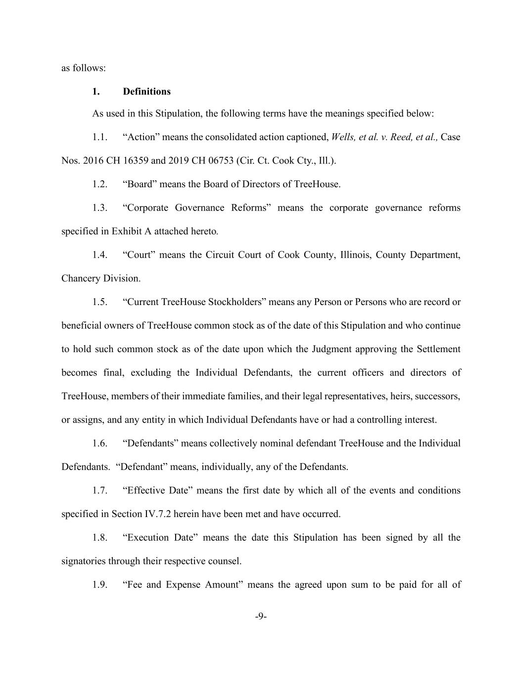 -9- as follows: 1. Definitions As used in this Stipulation, the following terms have the meanings specified below: 1.1. “Action” means the consolidated action captioned, Wells, et al. v. Reed, et al., Case Nos. 2016 CH 16359 and 2019 CH 06753 (Cir. Ct. Cook Cty., Ill.). 1.2. “Board” means the Board of Directors of TreeHouse. 1.3. “Corporate Governance Reforms” means the corporate governance reforms specified in Exhibit A attached hereto. 1.4. “Court” means the Circuit Court of Cook County, Illinois, County Department, Chancery Division. 1.5. “Current TreeHouse Stockholders” means any Person or Persons who are record or beneficial owners of TreeHouse common stock as of the date of this Stipulation and who continue to hold such common stock as of the date upon which the Judgment approving the Settlement becomes final, excluding the Individual Defendants, the current officers and directors of TreeHouse, members of their immediate families, and their legal representatives, heirs, successors, or assigns, and any entity in which Individual Defendants have or had a controlling interest. 1.6. “Defendants” means collectively nominal defendant TreeHouse and the Individual Defendants. “Defendant” means, individually, any of the Defendants. 1.7. “Effective Date” means the first date by which all of the events and conditions specified in Section IV.7.2 herein have been met and have occurred. 1.8. “Execution Date” means the date this Stipulation has been signed by all the signatories through their respective counsel. 1.9. “Fee and Expense Amount” means the agreed upon sum to be paid for all of