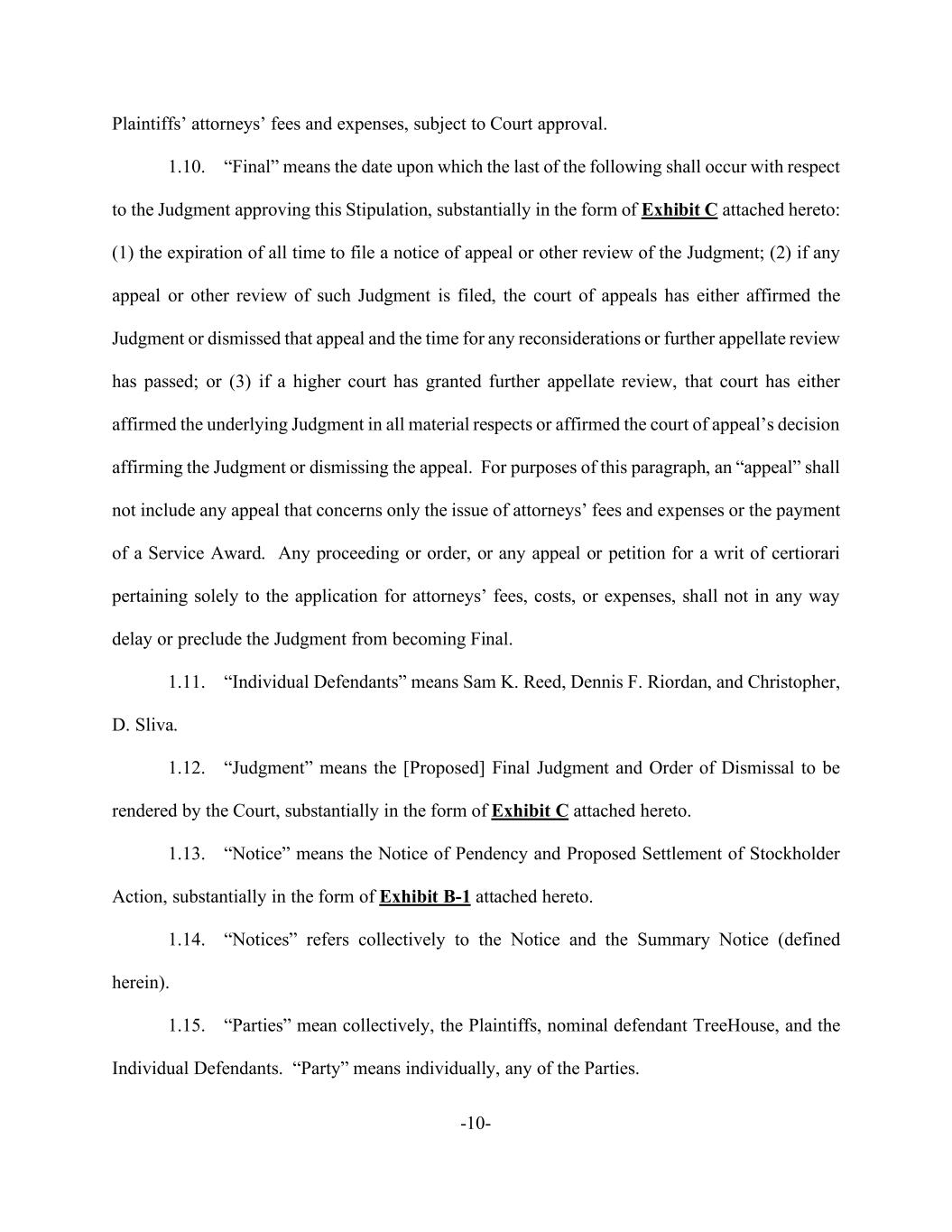 -10- Plaintiffs’ attorneys’ fees and expenses, subject to Court approval. 1.10. “Final” means the date upon which the last of the following shall occur with respect to the Judgment approving this Stipulation, substantially in the form of Exhibit C attached hereto: (1) the expiration of all time to file a notice of appeal or other review of the Judgment; (2) if any appeal or other review of such Judgment is filed, the court of appeals has either affirmed the Judgment or dismissed that appeal and the time for any reconsiderations or further appellate review has passed; or (3) if a higher court has granted further appellate review, that court has either affirmed the underlying Judgment in all material respects or affirmed the court of appeal’s decision affirming the Judgment or dismissing the appeal. For purposes of this paragraph, an “appeal” shall not include any appeal that concerns only the issue of attorneys’ fees and expenses or the payment of a Service Award. Any proceeding or order, or any appeal or petition for a writ of certiorari pertaining solely to the application for attorneys’ fees, costs, or expenses, shall not in any way delay or preclude the Judgment from becoming Final. 1.11. “Individual Defendants” means Sam K. Reed, Dennis F. Riordan, and Christopher, D. Sliva. 1.12. “Judgment” means the [Proposed] Final Judgment and Order of Dismissal to be rendered by the Court, substantially in the form of Exhibit C attached hereto. 1.13. “Notice” means the Notice of Pendency and Proposed Settlement of Stockholder Action, substantially in the form of Exhibit B-1 attached hereto. 1.14. “Notices” refers collectively to the Notice and the Summary Notice (defined herein). 1.15. “Parties” mean collectively, the Plaintiffs, nominal defendant TreeHouse, and the Individual Defendants. “Party” means individually, any of the Parties.