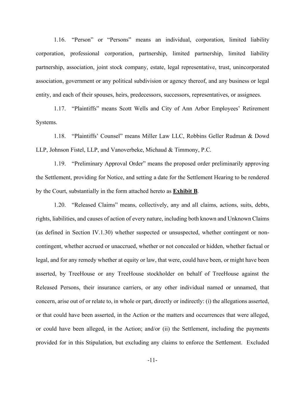 -11- 1.16. “Person” or “Persons” means an individual, corporation, limited liability corporation, professional corporation, partnership, limited partnership, limited liability partnership, association, joint stock company, estate, legal representative, trust, unincorporated association, government or any political subdivision or agency thereof, and any business or legal entity, and each of their spouses, heirs, predecessors, successors, representatives, or assignees. 1.17. “Plaintiffs” means Scott Wells and City of Ann Arbor Employees’ Retirement Systems. 1.18. “Plaintiffs’ Counsel” means Miller Law LLC, Robbins Geller Rudman & Dowd LLP, Johnson Fistel, LLP, and Vanoverbeke, Michaud & Timmony, P.C. 1.19. “Preliminary Approval Order” means the proposed order preliminarily approving the Settlement, providing for Notice, and setting a date for the Settlement Hearing to be rendered by the Court, substantially in the form attached hereto as Exhibit B. 1.20. “Released Claims” means, collectively, any and all claims, actions, suits, debts, rights, liabilities, and causes of action of every nature, including both known and Unknown Claims (as defined in Section IV.1.30) whether suspected or unsuspected, whether contingent or non- contingent, whether accrued or unaccrued, whether or not concealed or hidden, whether factual or legal, and for any remedy whether at equity or law, that were, could have been, or might have been asserted, by TreeHouse or any TreeHouse stockholder on behalf of TreeHouse against the Released Persons, their insurance carriers, or any other individual named or unnamed, that concern, arise out of or relate to, in whole or part, directly or indirectly: (i) the allegations asserted, or that could have been asserted, in the Action or the matters and occurrences that were alleged, or could have been alleged, in the Action; and/or (ii) the Settlement, including the payments provided for in this Stipulation, but excluding any claims to enforce the Settlement. Excluded